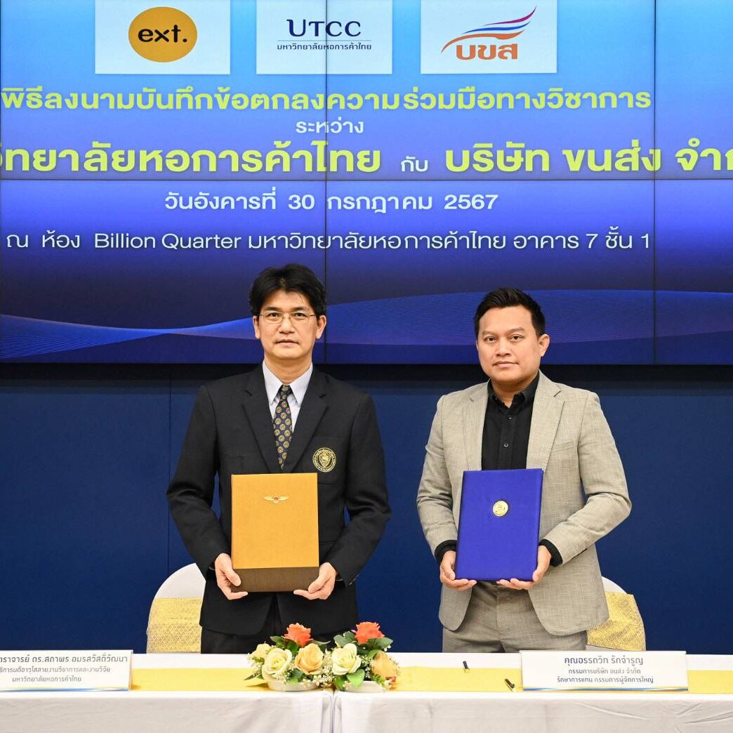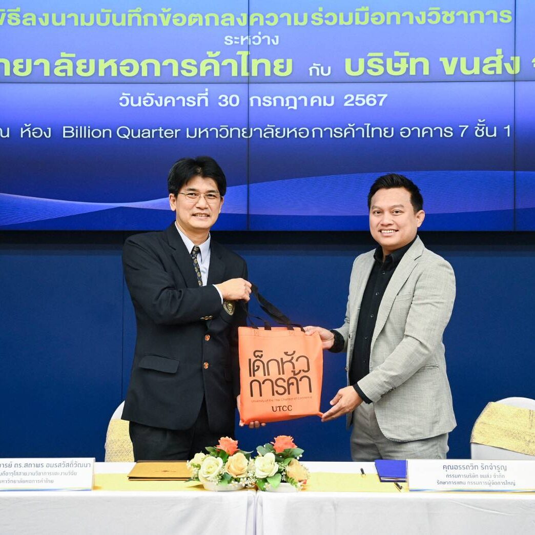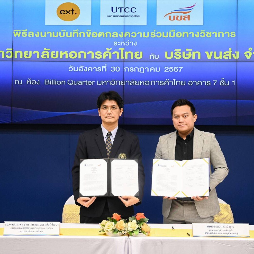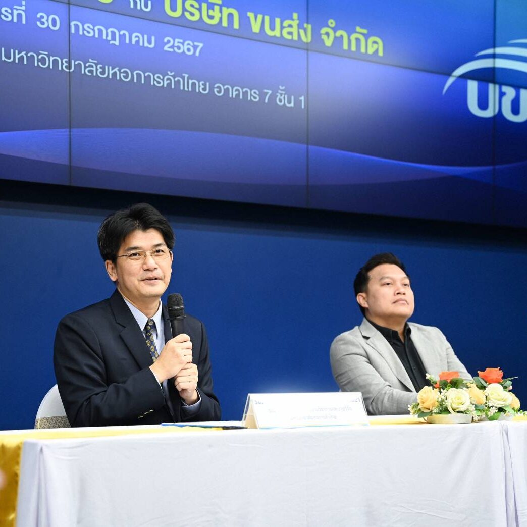 รองศาสตราจารย์ ดร.สถาพร อมรสวัสดิ์วัฒนา รองอธิการบดีอาวุโสสายงานวิชาการและงานวิจัย มหาวิทยาลัยหอการค้าไทย ลงนามความร่วมมือ ร่วมกับ คุณอรรถวิท รักจำรูญ กรรมการบริษัท ขนส่ง จำกัด และรักษาการแทนกรรมการผู้จัดการใหญ่ ณ อาคาร 7 ชั้น 1 ในวันที่ 30 กรกฎาคม 2567