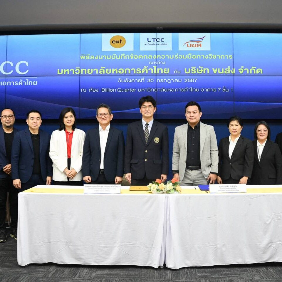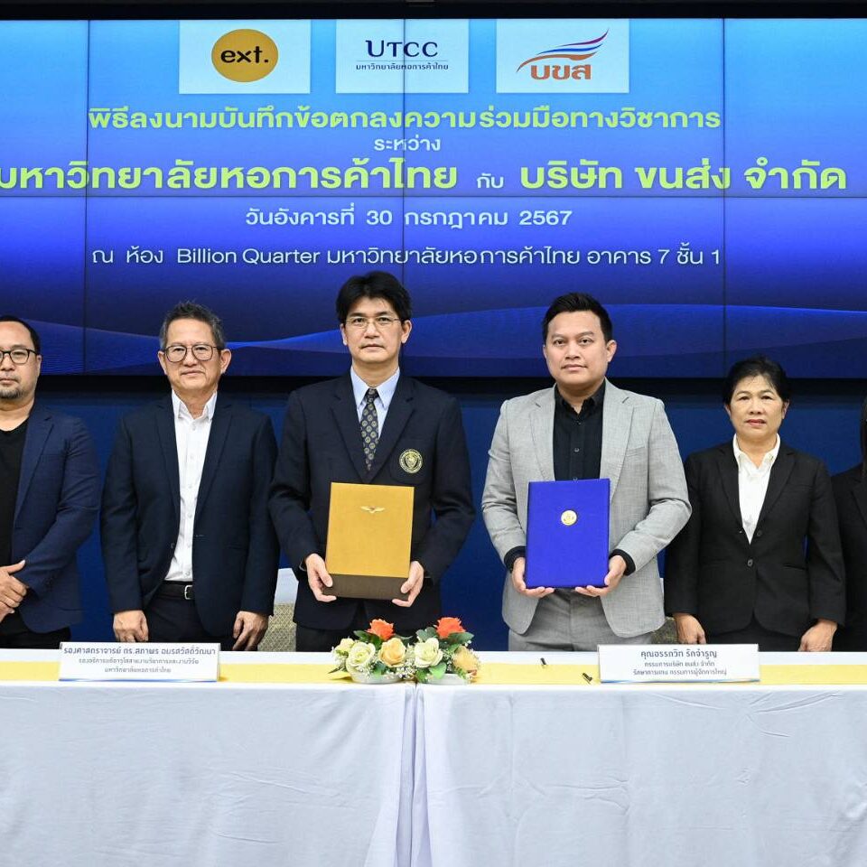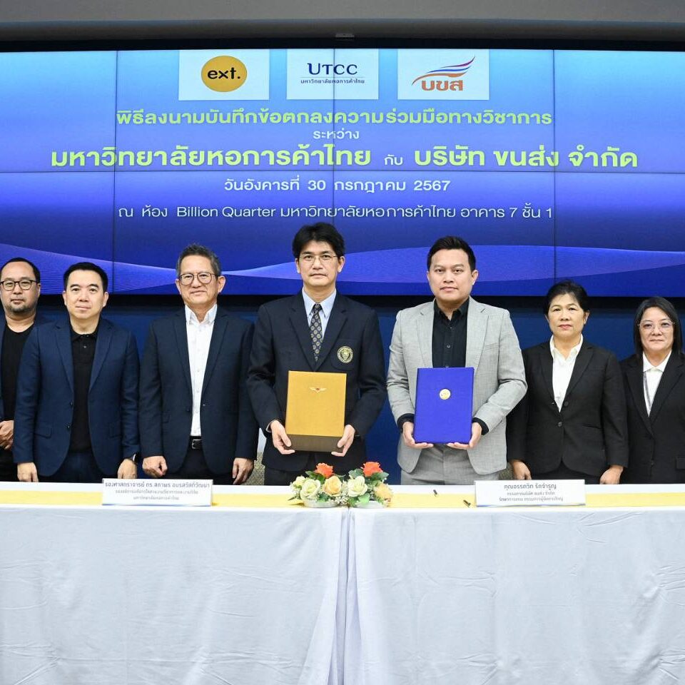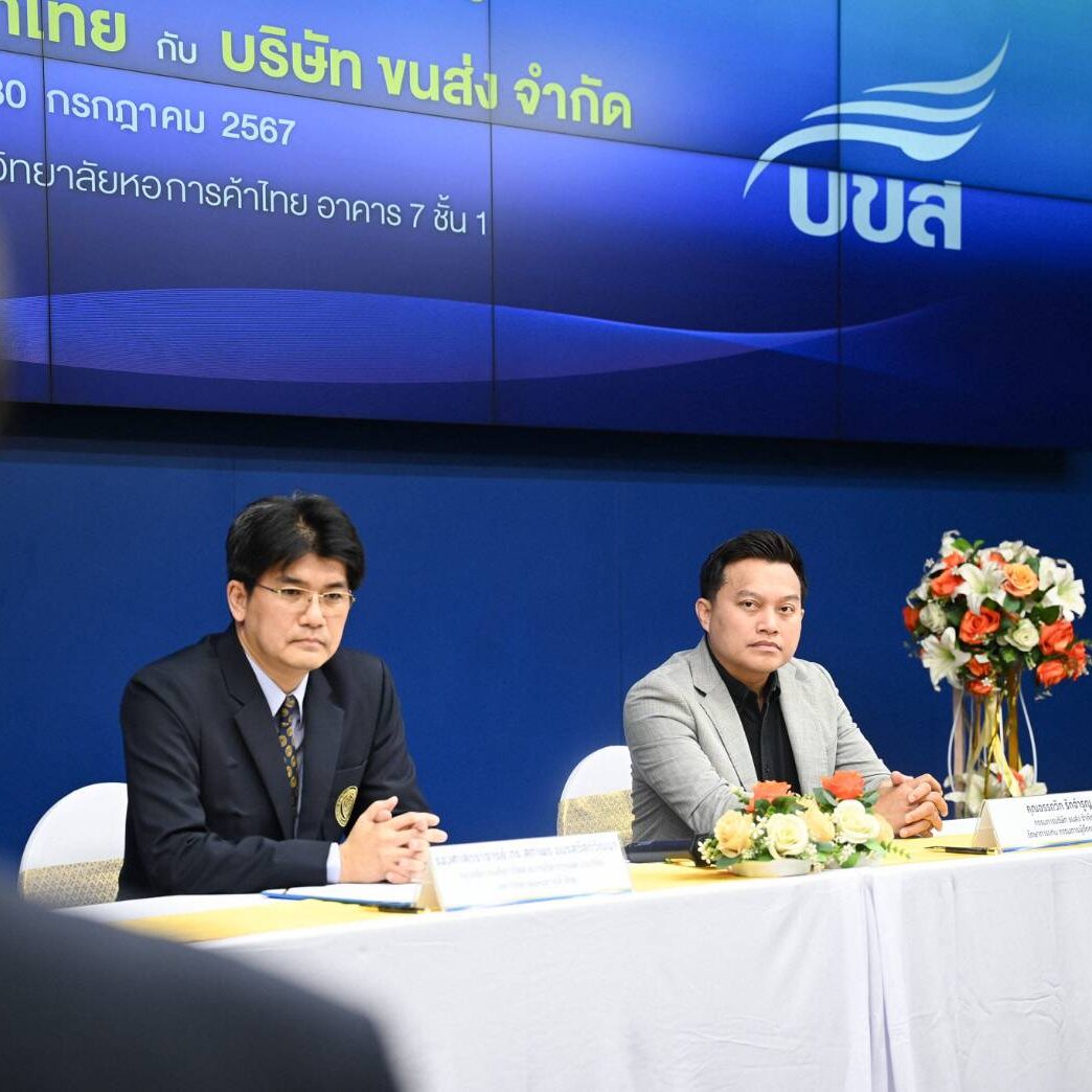 รองศาสตราจารย์ ดร.สถาพร อมรสวัสดิ์วัฒนา รองอธิการบดีอาวุโสสายงานวิชาการและงานวิจัย มหาวิทยาลัยหอการค้าไทย ลงนามความร่วมมือ ร่วมกับ คุณอรรถวิท รักจำรูญ กรรมการบริษัท ขนส่ง จำกัด และรักษาการแทนกรรมการผู้จัดการใหญ่ ณ อาคาร 7 ชั้น 1 ในวันที่ 30 กรกฎาคม 2567