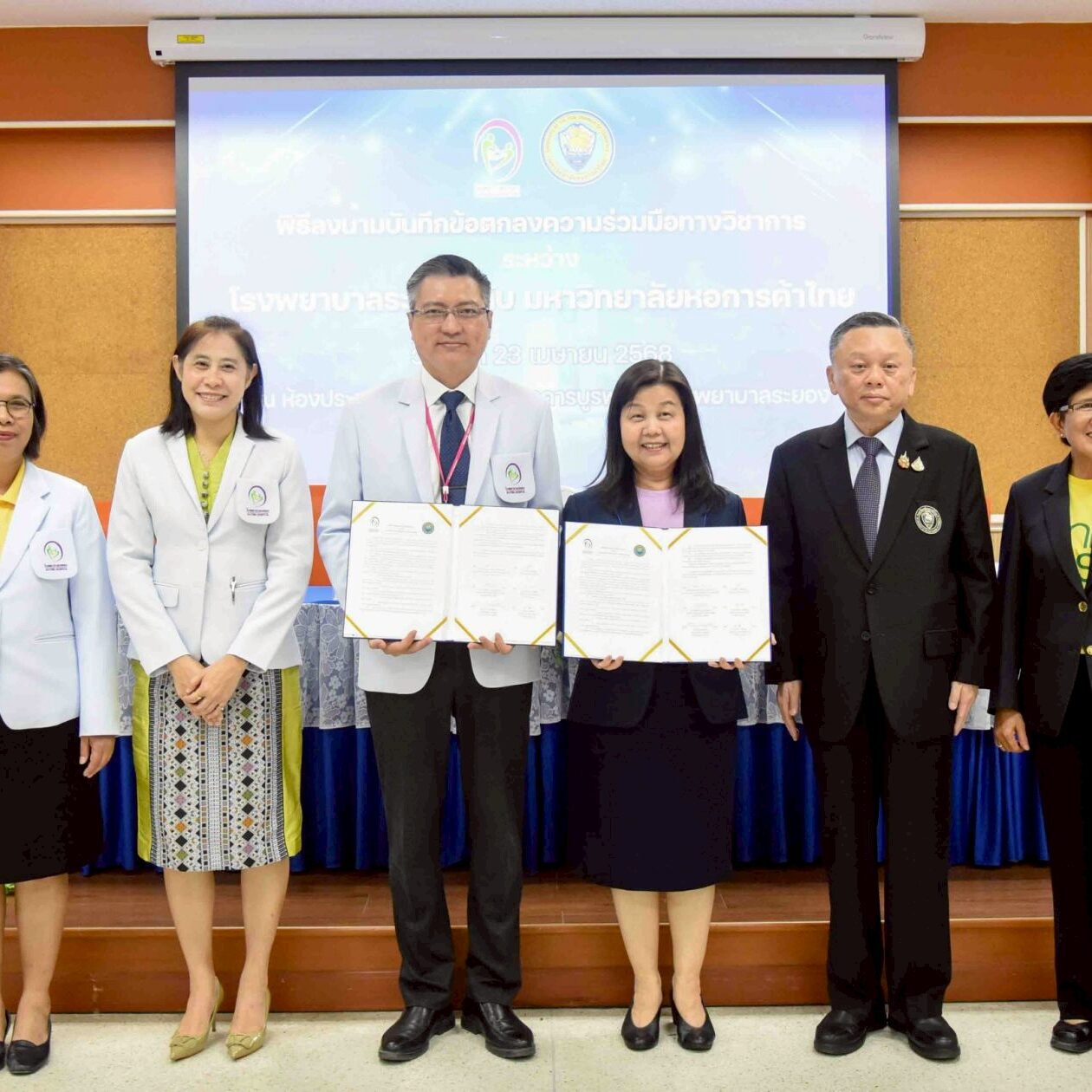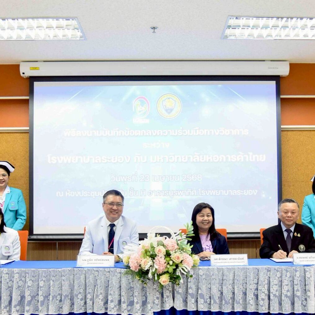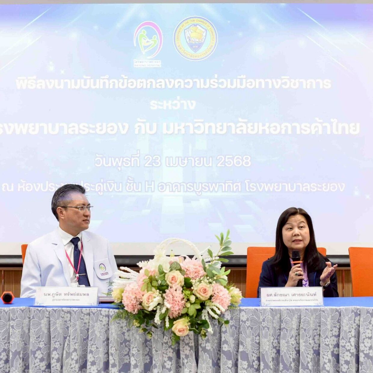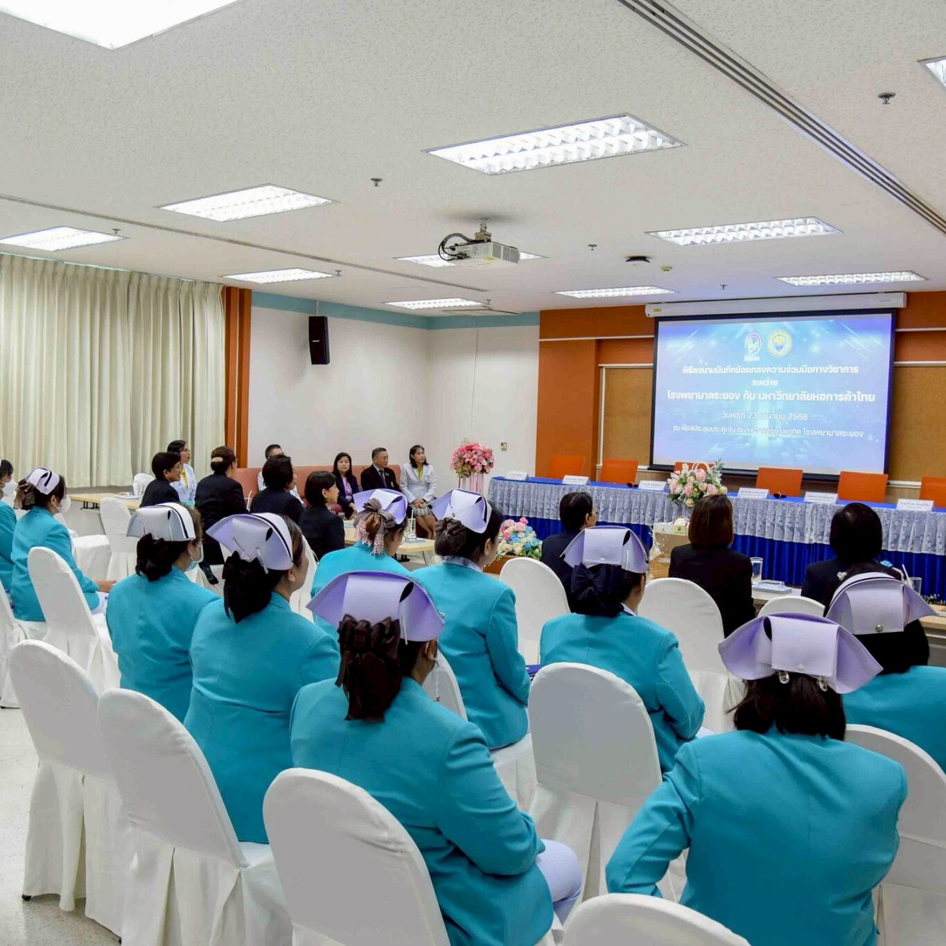 มหาวิทยาลัยหอการค้าไทย โดยคณะพยาบาลศาสตร์ ร่วมพิธีลงนามความร่วมมือด้านวิชาการ (MOU) ระหว่าง มหาวิทยาลัยหอการค้าไทย กับ โรงพยาบาลระยอง ได้รับเกียรติจาก ผู้ช่วยศาสตราจารย์ลักขณา เศาธยะนันท์ รองอธิการบดีอาวุโสสายงานวิชาการและงานวิจัย ลงนามความร่วมมือกับ นายภูษิต ทรัพย์สมพล ผู้อำนวยการโรงพยาบาลระยอง เพื่อความร่วมมือทางวิชาการด้านการพยาบาลและการผดุงครรภ์โดยโรงพยาบาลระยองเป็นหน่วยงานรองรับการฝึกปฏิบัติงานของนักศึกษาสาขาด้านการพยาบาลและการผดุงครรภ์ของมหาวิทยาลัยหอการค้าไทย รวมถึงการวิจัยและการพัฒนา เพื่อให้เกิดความก้าวหน้าทางวิชาการและวิจัยทางการพยาบาลและการผดุงครรภ์ โดยมี อาจารย์สมพงษ์ แก้วเจริญไพศาล รองอธิการบดีฝ่ายปฏิบัติการและกิจการพิเศษ ดร.จิราพร วัฒนศรีสิน คณบดีคณะพยาบาลศาสตร์ มหาวิทยาลัยหอการค้าไทย และนางจริยา กิตติดิลก รองผู้อำนวยการฝ่ายการพยาบาล นางสาวนวรัตน์ ศรีสวัสดิ์ รองผู้อำนวยการฝ่ายการแพทย์ โรงพยาบาลระยอง ร่วมลงนามเป็นพยาน พร้อมด้วยผู้บริหาร คณาจารย์ ทั้ง 2 สถาบันร่วมในพิธี ณ โรงพยาบาลระยอง จังหวัดระยอง เมื่อวันที่ 23 เมษายน 2568