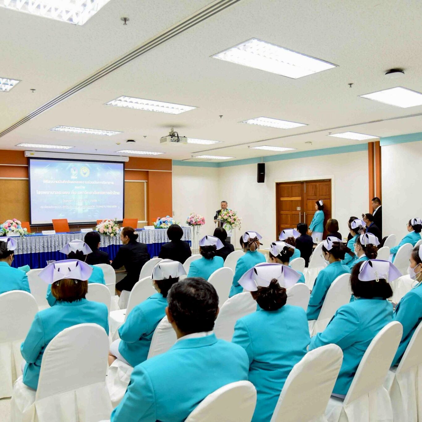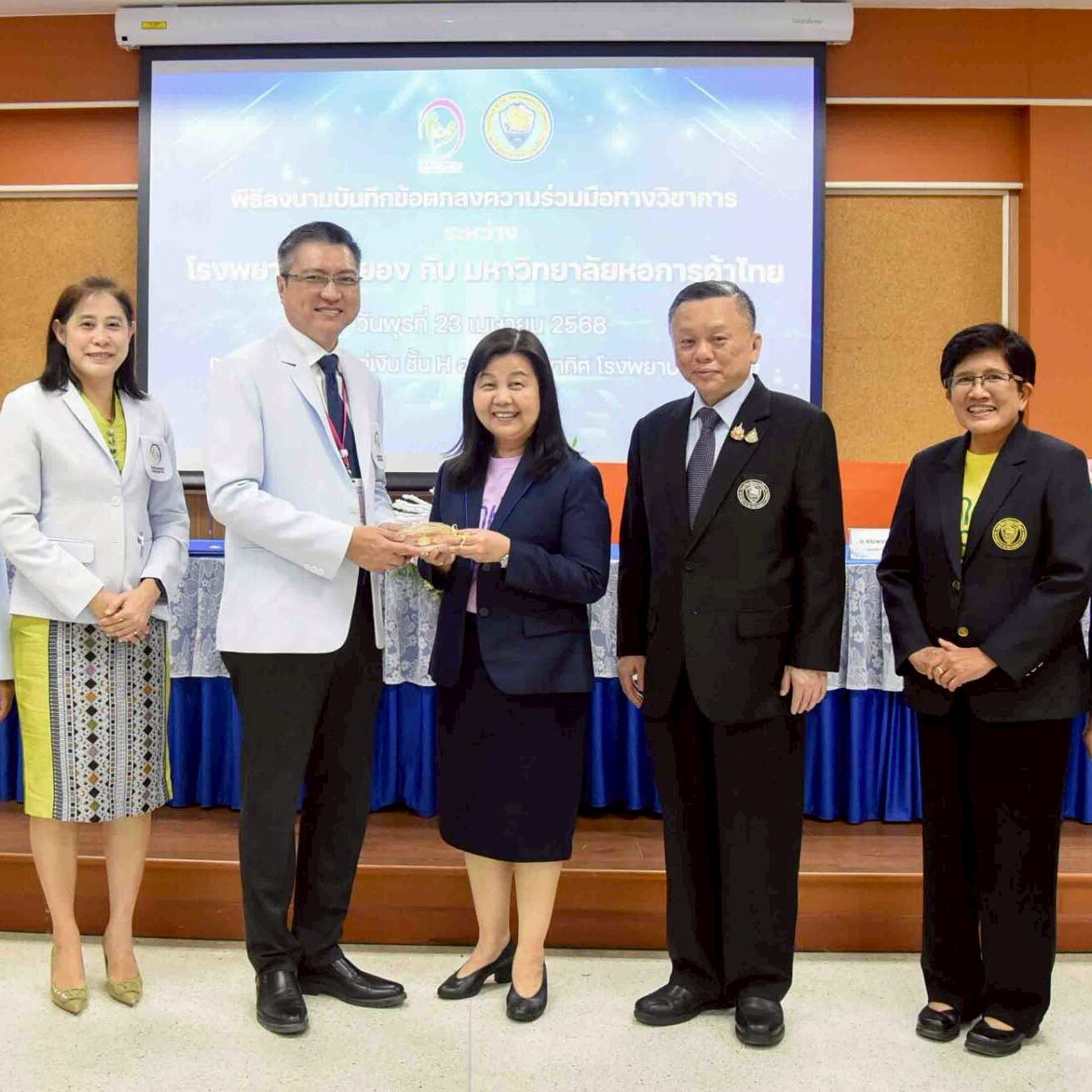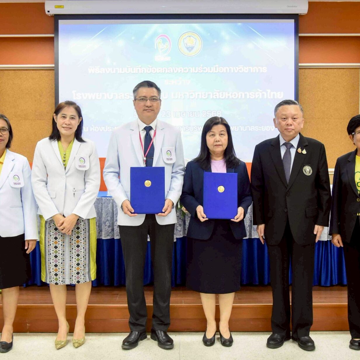 มหาวิทยาลัยหอการค้าไทย โดยคณะพยาบาลศาสตร์ ร่วมพิธีลงนามความร่วมมือด้านวิชาการ (MOU) ระหว่าง มหาวิทยาลัยหอการค้าไทย กับ โรงพยาบาลระยอง ได้รับเกียรติจาก ผู้ช่วยศาสตราจารย์ลักขณา เศาธยะนันท์ รองอธิการบดีอาวุโสสายงานวิชาการและงานวิจัย ลงนามความร่วมมือกับ นายภูษิต ทรัพย์สมพล ผู้อำนวยการโรงพยาบาลระยอง เพื่อความร่วมมือทางวิชาการด้านการพยาบาลและการผดุงครรภ์โดยโรงพยาบาลระยองเป็นหน่วยงานรองรับการฝึกปฏิบัติงานของนักศึกษาสาขาด้านการพยาบาลและการผดุงครรภ์ของมหาวิทยาลัยหอการค้าไทย รวมถึงการวิจัยและการพัฒนา เพื่อให้เกิดความก้าวหน้าทางวิชาการและวิจัยทางการพยาบาลและการผดุงครรภ์ โดยมี อาจารย์สมพงษ์ แก้วเจริญไพศาล รองอธิการบดีฝ่ายปฏิบัติการและกิจการพิเศษ ดร.จิราพร วัฒนศรีสิน คณบดีคณะพยาบาลศาสตร์ มหาวิทยาลัยหอการค้าไทย และนางจริยา กิตติดิลก รองผู้อำนวยการฝ่ายการพยาบาล นางสาวนวรัตน์ ศรีสวัสดิ์ รองผู้อำนวยการฝ่ายการแพทย์ โรงพยาบาลระยอง ร่วมลงนามเป็นพยาน พร้อมด้วยผู้บริหาร คณาจารย์ ทั้ง 2 สถาบันร่วมในพิธี ณ โรงพยาบาลระยอง จังหวัดระยอง เมื่อวันที่ 23 เมษายน 2568