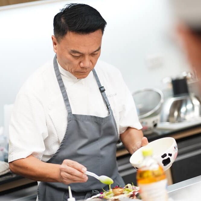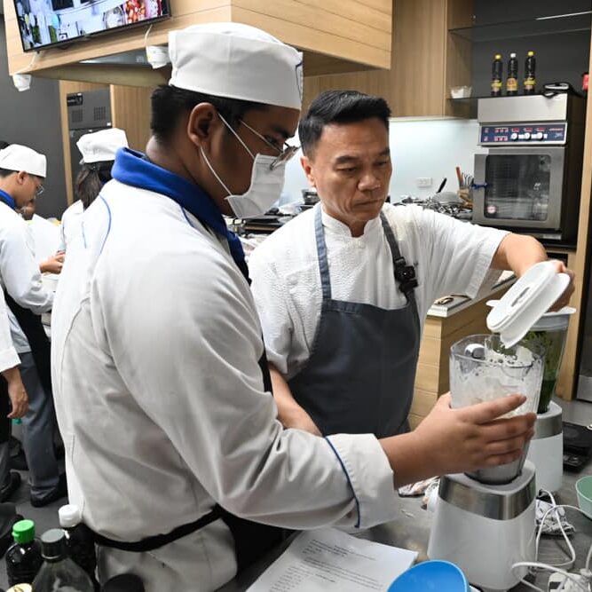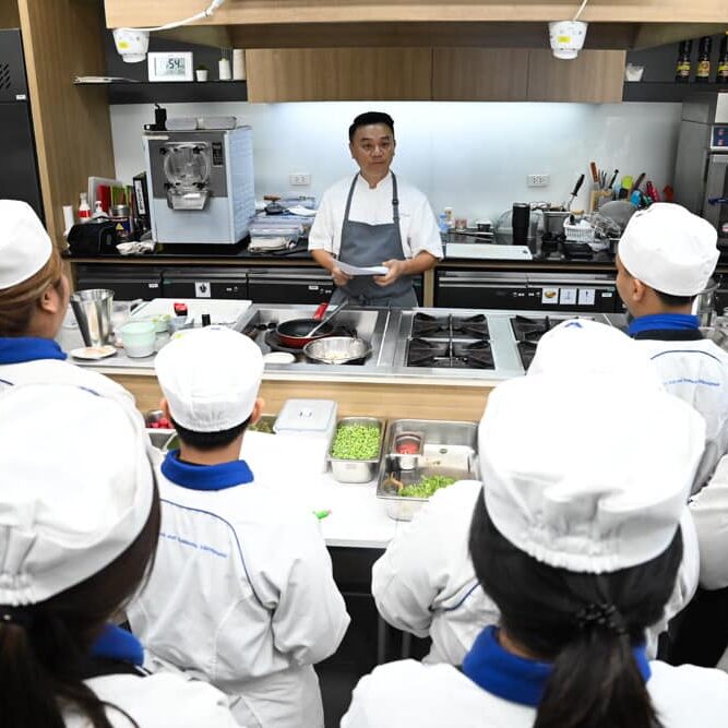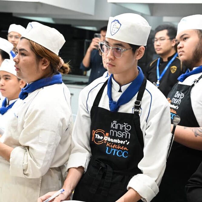 สาขาวิชาศิลปะการประกอบอาหารและการจัดการภัตตาคาร คณะการท่องเที่ยวและอุตสาหกรรมบริการ มหาวิทยาลัยหอการค้าไทย รู้สึกเป็นเกียรติอย่างยิ่งที่ได้ต้อนรับและขอขอบคุณ “เชฟเอียน” พงษ์ธวัช เฉลิมกิตติชัย เชฟแถวหน้าของประเทศไทย ที่มีชื่อเสียงจากการเป็นเชฟกระทะเหล็ก สู่เชฟระดับโลกผู้สร้างตำนาน “คนไทยคนแรก” เชฟผู้มากความสามารถที่มาให้ความรู้และบอกเล่าเรื่องราวให้กับนักศึกษาในวันนี้ โดยเชฟเอียนได้ทำการสาธิตเมนู Seared Hokkaido Scallop, Jalapeno-Lime Dressing ให้เหล่านักศึกษาได้ชมกันอย่างใกล้ชิด ถือเป็นโอกาสที่ดีที่นักศึกษาจะได้นำคำแนะนำจากความรู้และประสบการณ์ของเชฟผู้เชี่ยวชาญในวงการอาหารมาอย่างยาวนาน มาปรับใช้เพื่อพัฒนาศักยภาพของตนเองให้มากยิ่งขึ้น