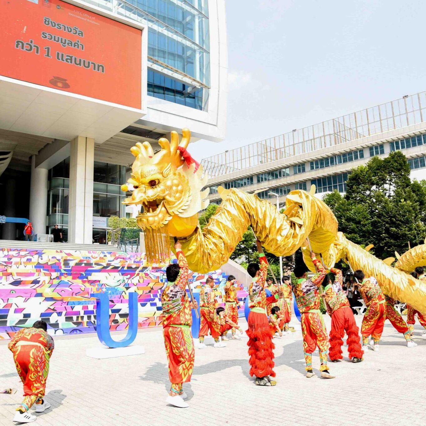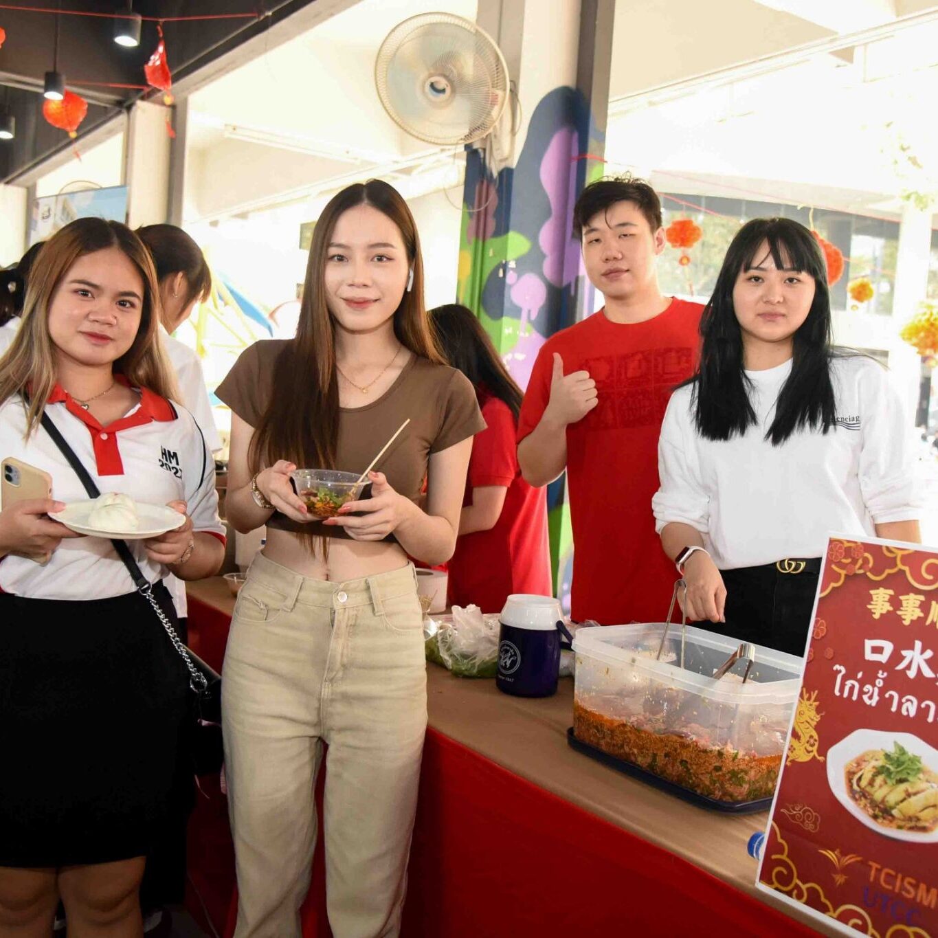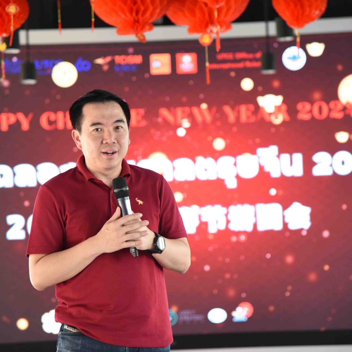 2024年2月1日泰-中国际管理学院、学校外事处、人文学院及研究生院联合举办2024金龙年春节游园会。泰国商会大学行政主管副校长翁端·西玛厝迪老师(AJ.Wongduen Simachokdee)及外事主管副校长披拉蓬·弗西里博士(Dr.Piraphong Foosiri)分别致开幕词。