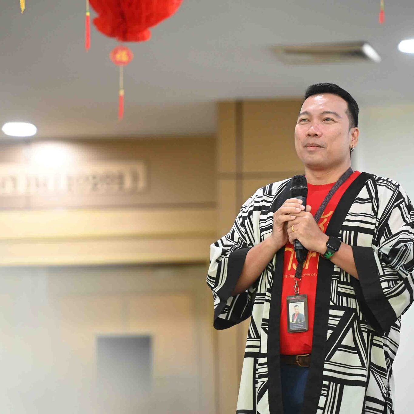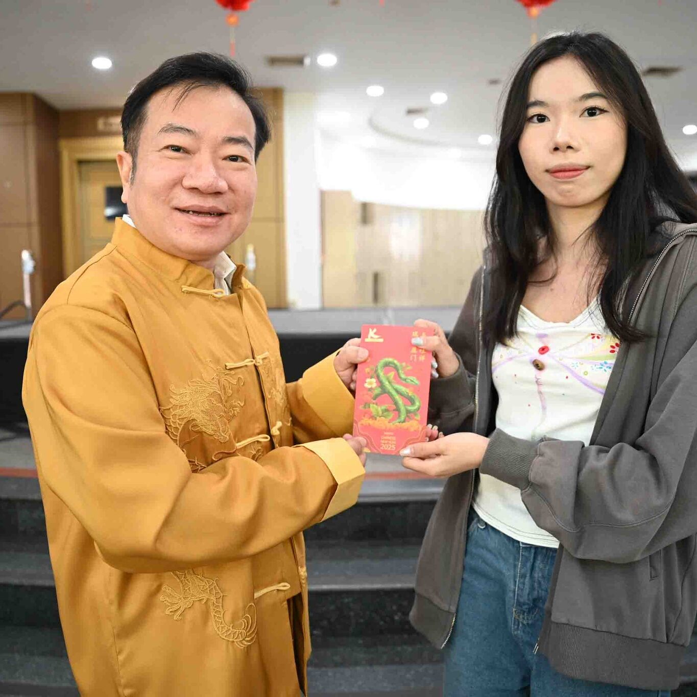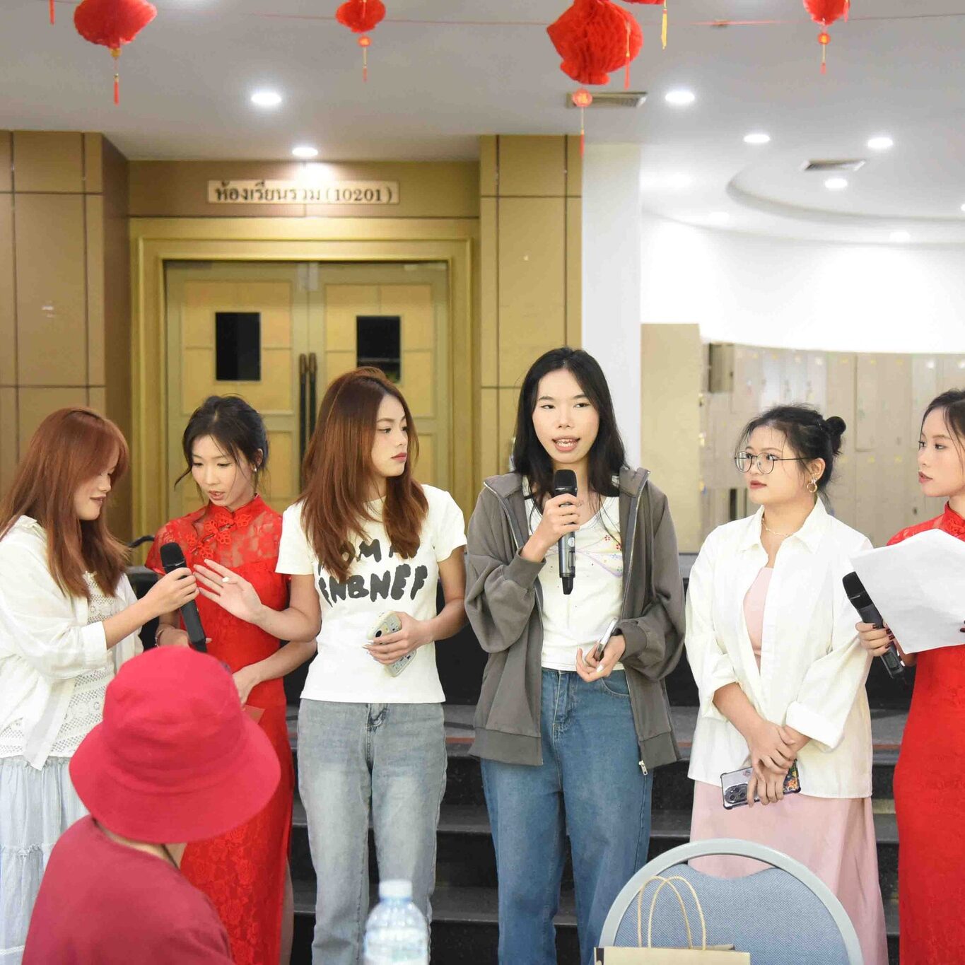 ผศ.ดร.กิตติศักดิ์ เกิดอรุณสุขศรี คณบดีคณะมนุษยศาสตร์ กล่าวเปิดงานเฉลิมฉลองเทศกาลตรุษจีน มะเส็งทอง 2025 จัดให้แก่นักศึกษาแลกเปลี่ยนจากมหาวิทยาลัยกุ้ยหลิน สาธารณรัฐประชาชนจีน ที่มาศึกษาสาขาวิชาภาษาไทย โดยมีคณาจารย์ จากคณะมนุษยศาสตร์ มหาวิทยาลัยหอการค้าไทย ร่วมกิจกรรมและแจกอั่งเปาให้กับนักศึกษาด้วย บรรยากาศเต็มไปด้วยความสนุกสนาน ฮาเฮ ณ บริเวณห้องโถง อาคาร 10 ชั้น 2 เมื่อวันที่ 27 มกราคม 2568