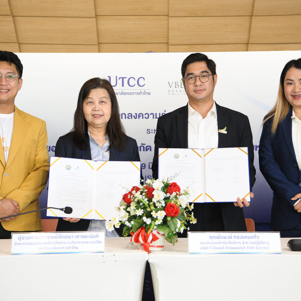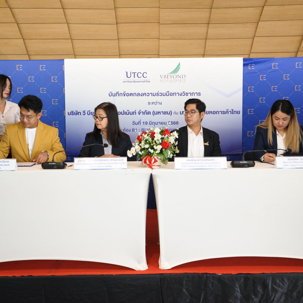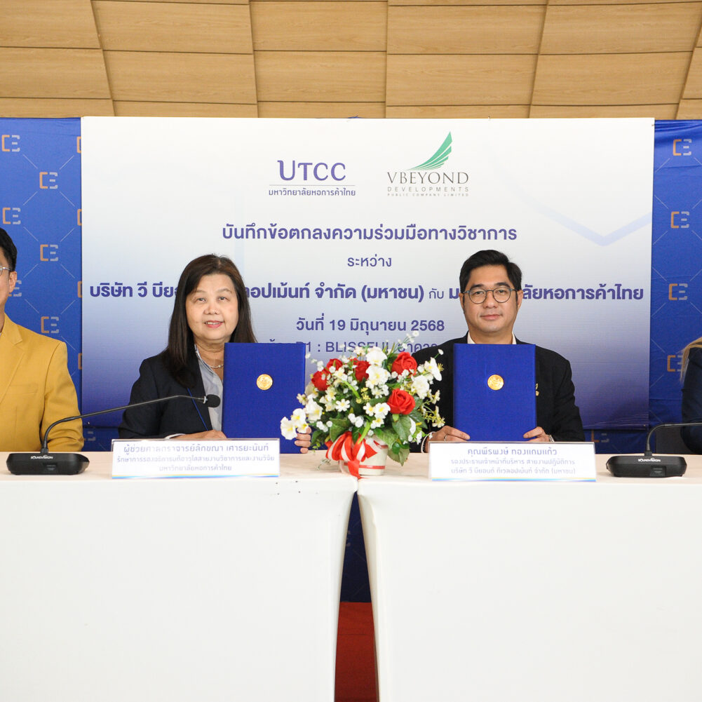 ภายในพิธีลงนามได้รับเกียรติจาก ผู้ช่วยศาสตราจารย์ ลักขณา เศาธยะนันท์ รองอธิการบดีอาวุโสสายงานวิชาการและงานวิจัย ลงนามร่วมกับ คุณพีรพงษ์ ทองแกมแก้ว รองประธานเจ้าหน้าที่บริหาร สายงานปฏิบัติการ บริษัท วี บียอนด์ ดีเวลลอปเม้นท์ จำกัด (มหาชน) ร่วมด้วย อาจารย์ ดร.ศุภสัณห์ ปรีดาวิภาต คณบดีคณะการสร้างเจ้าของธุรกิจสร้างสรรค์ และ คุณนิรัชรา อิสรีย์ธัญชนก ผู้จัดการอาวุโสฝ่ายทรัพยากรบุคคลและธุรการ บริษัท วี บียอนด์ ดีเวลลอปเม้นท์ จำกัด (มหาชน) ร่วมลงนามเป็นสักขีพยาน โดยมี คณะผู้บริหารของทั้ง 2 องค์กร ร่วมในพิธี ณ ห้อง Blissful อาคาร 10 ชั้น 1 มหาวิทยาลัยหอการค้าไทย เมื่อวันที่ 19 มิถุนายน 2568
