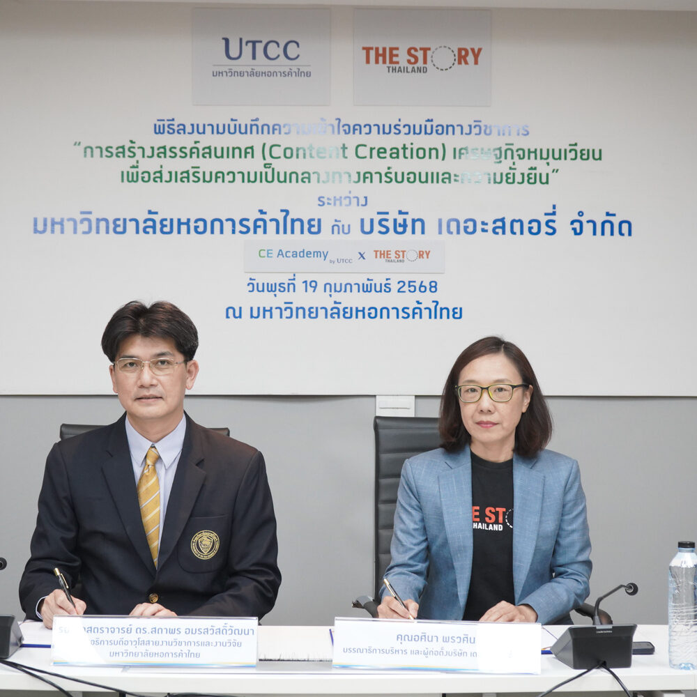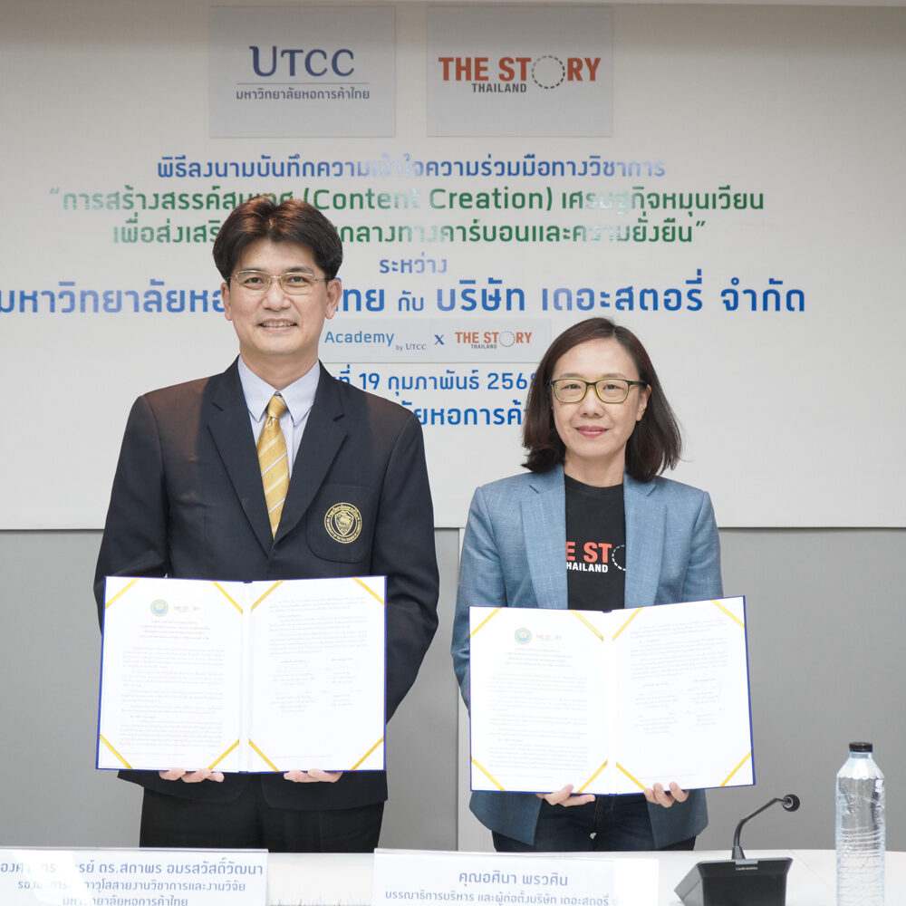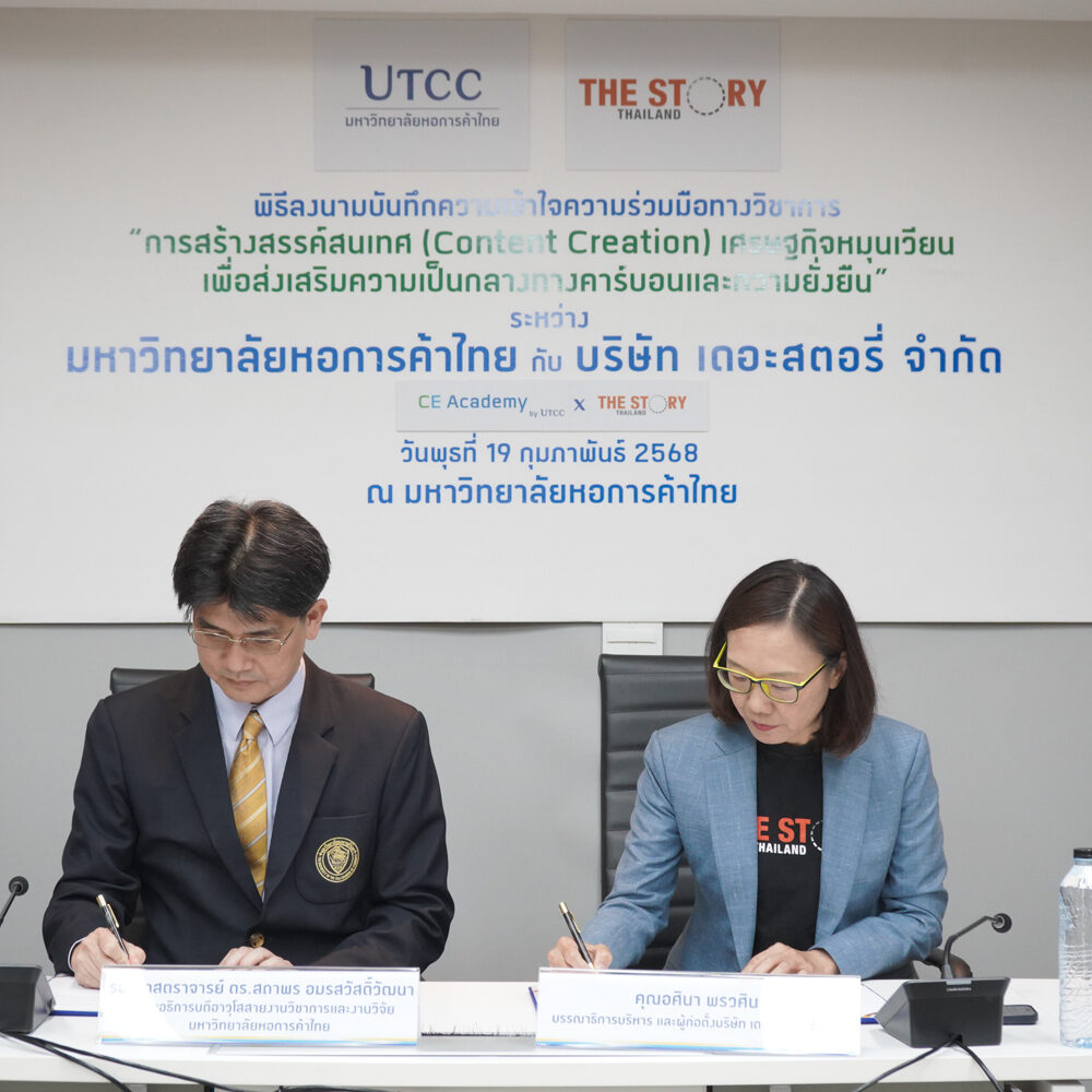 มหาวิทยาลัยหอการค้าไทย โดย สถาบันวิทยาการเศรษฐกิจหมุนเวียนเพื่อผู้ประกอบการและผู้บริโภค ( CE academy by UTCC ) จัดพิธีลงนามความร่วมมือระหว่าง มหาวิทยาลัยหอการค้าไทย กับ บริษัท เดอะสตอรี่ จำกัด โดยมีวัตถุประสงค์เพื่อส่งเสริมกิจกรรมทางวิชาการและการพัฒนาองค์ความรู้ด้านเศรษฐกิจหมุนเวียนและความยั่งยืน เพื่อเป้าหมายในการลดปริมาณการปล่อยก๊าซคาร์บอนของประเทศไทยในอนาคต