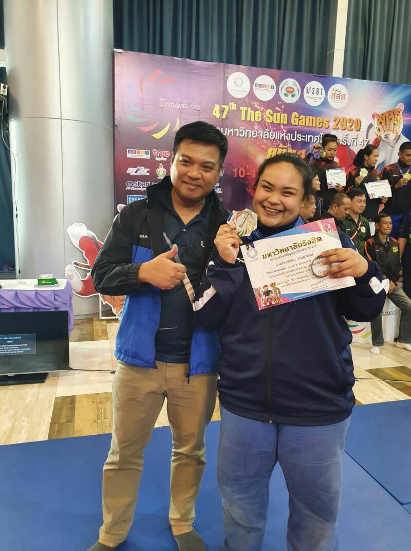 2. รางวัลรองชนะเลิศอันดับ 1 (เหรียญเงิน) ยูยิตสู รุ่นน้ำหนักเกิน 70 กิโลกรัม ขึ้นไป ประเภท fighting หญิง จาก นางสาวธนิสรา เกษสุวรรณ์ คณะบริหารธุรกิจ