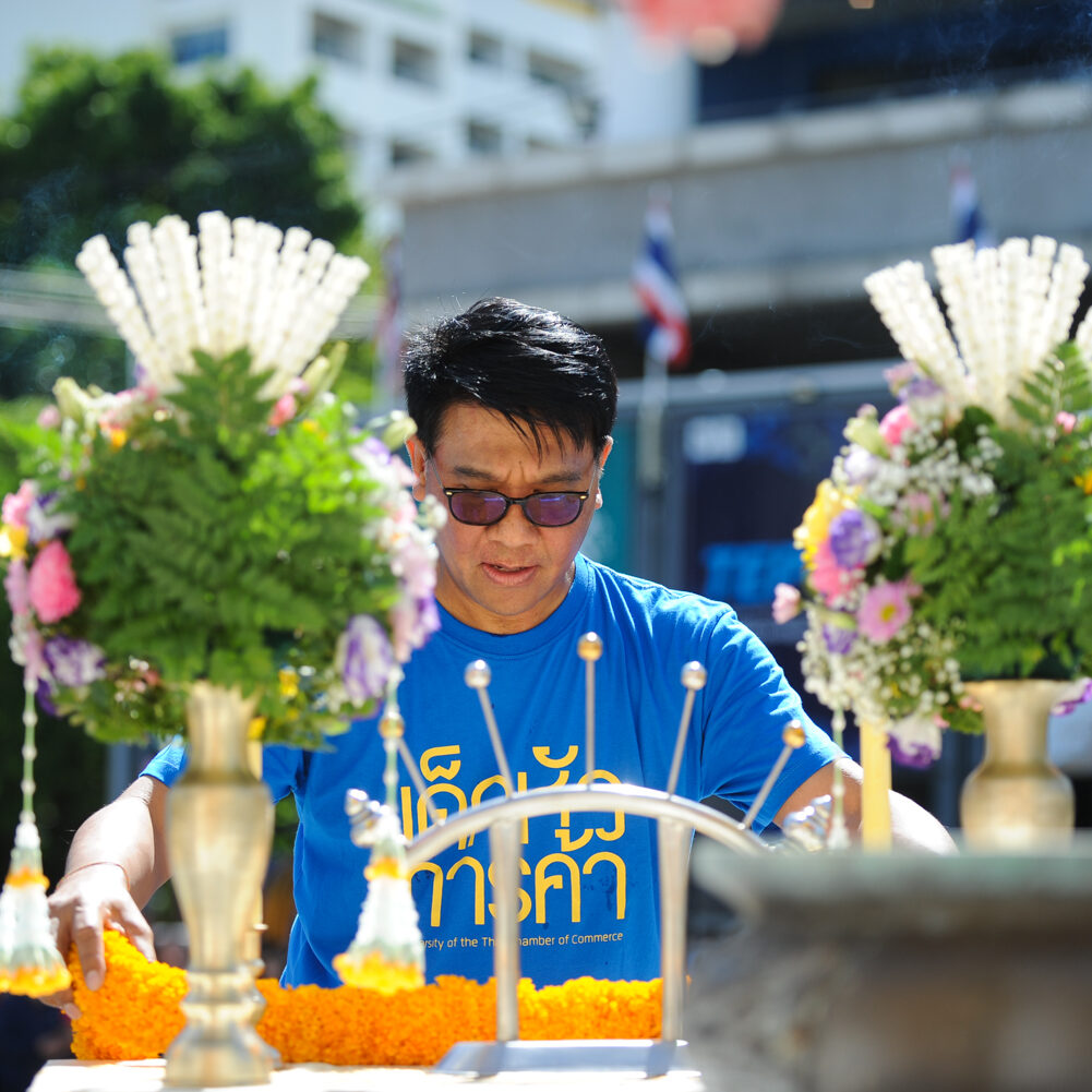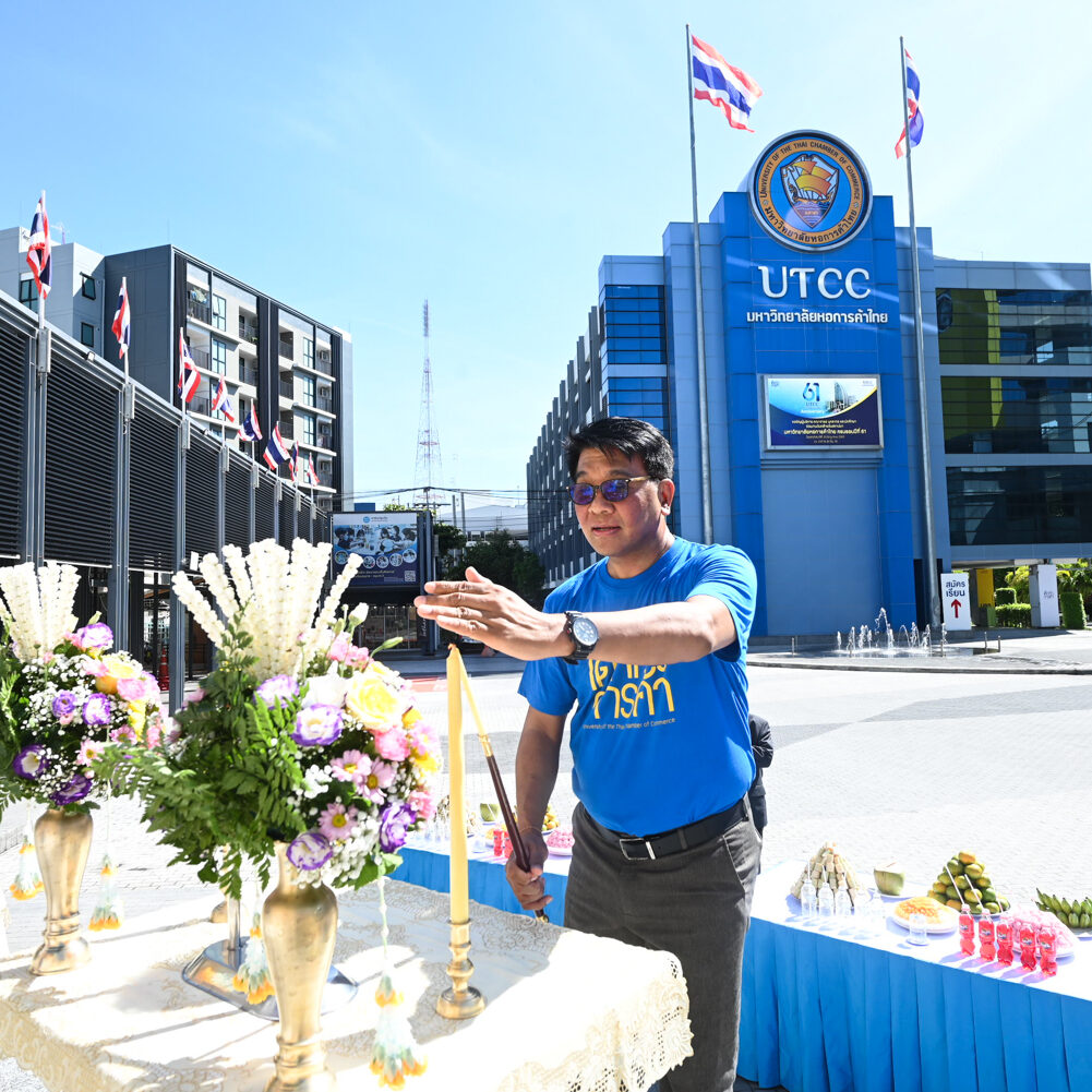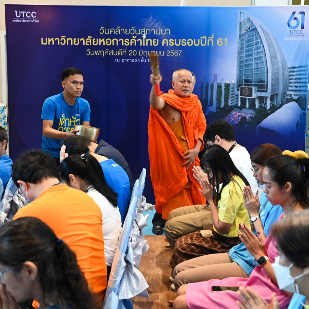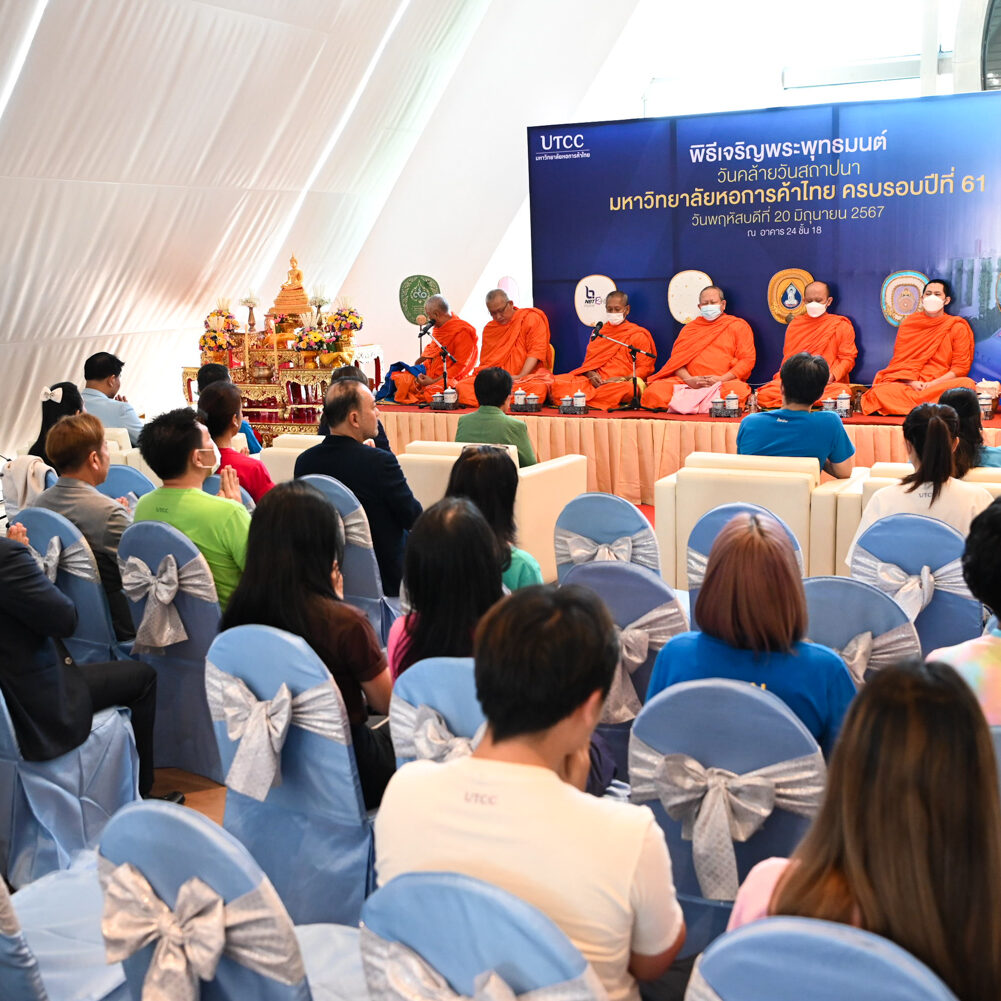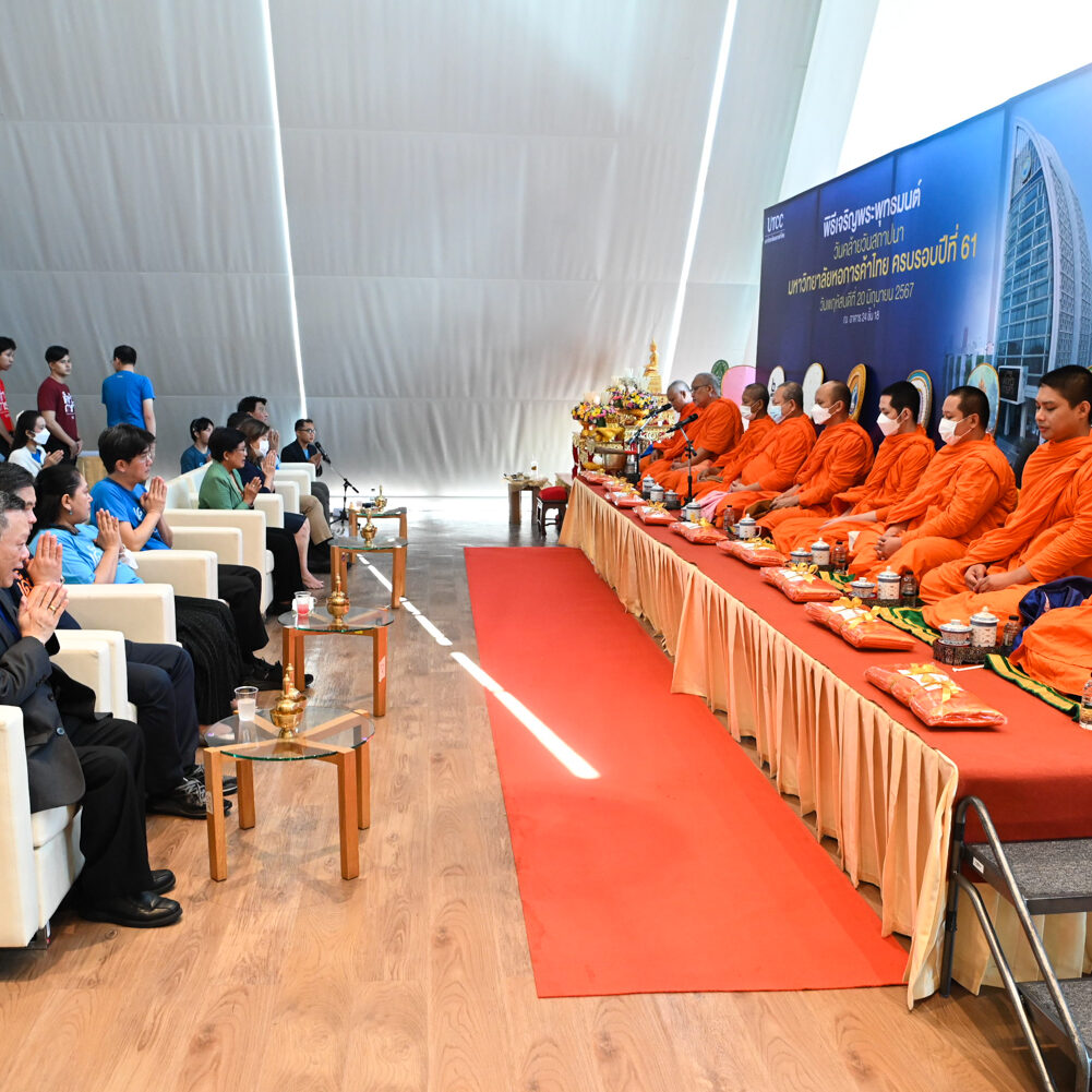 รองศาสตราจารย์ ดร.ธนวรรธน์ พลวิชัย อธิการบดีมหาวิทยาลัยหอการค้าไทย นำคณะผู้บริหาร อาจารย์ เจ้าหน้าที่และผู้แทนนักศึกษา เข้าสักการะสิ่งศักดิ์สิทธิ์ของมหาวิทยาลัยฯ ในโอกาสครบรอบ 61 ปี มหาวิทยาลัยหอการค้าไทยและพิธีเจริญพระพุทธมนต์จากคณะสงฆ์ จำนวน 9 รูป จากวัดพรหมวงศาราม ( วัดหลวงพ่อเณร ) เพื่อเป็นสิริมงคล แก่ผู้เข้าร่วมในงาน ณ โถงอเนกประสงค์ อาคาร 24 (อาคารสัญลักษณ์) ชั้น 18 มหาวิทยาลัยหอการค้าไทย เมื่อวันที่ 20 มิถุนายน 2567