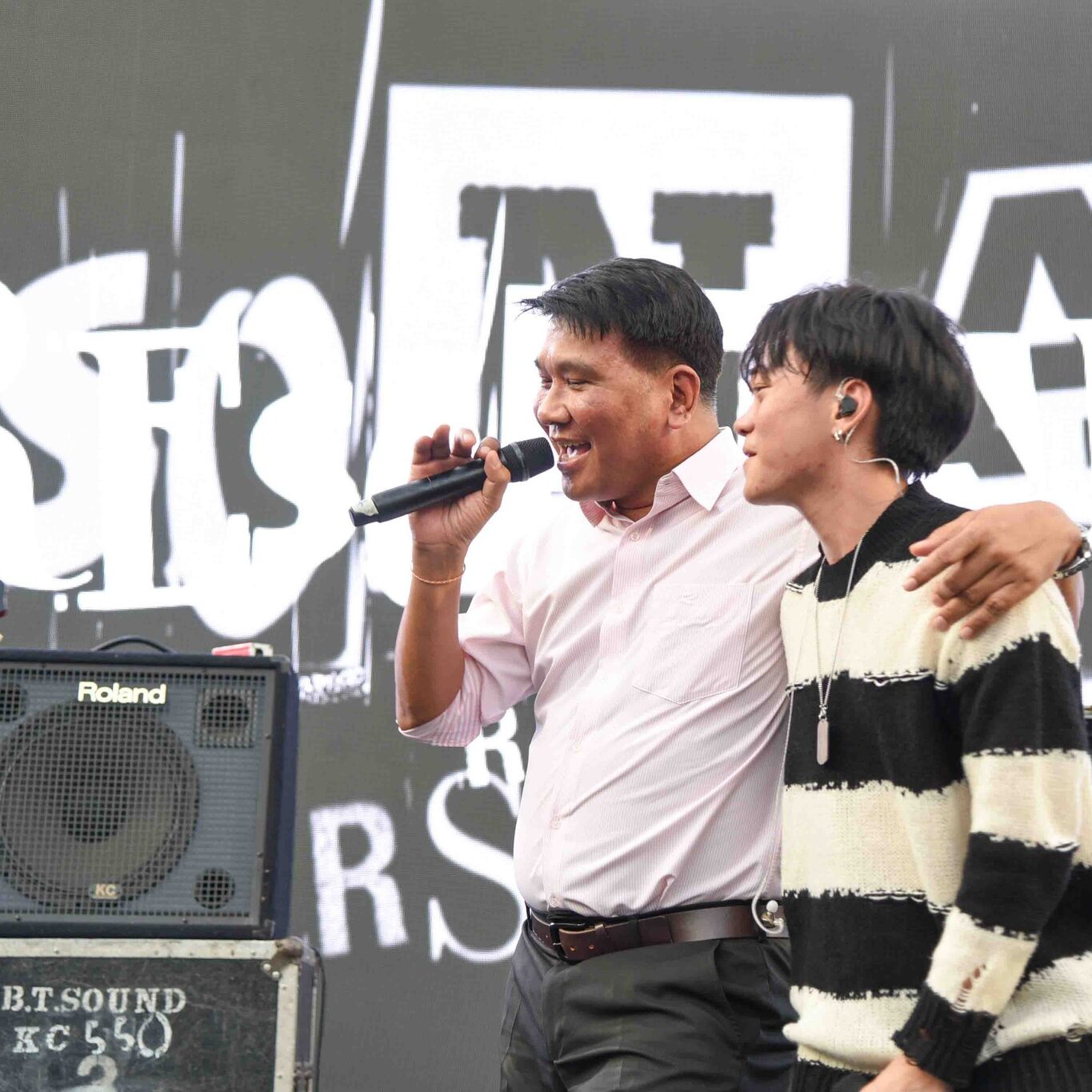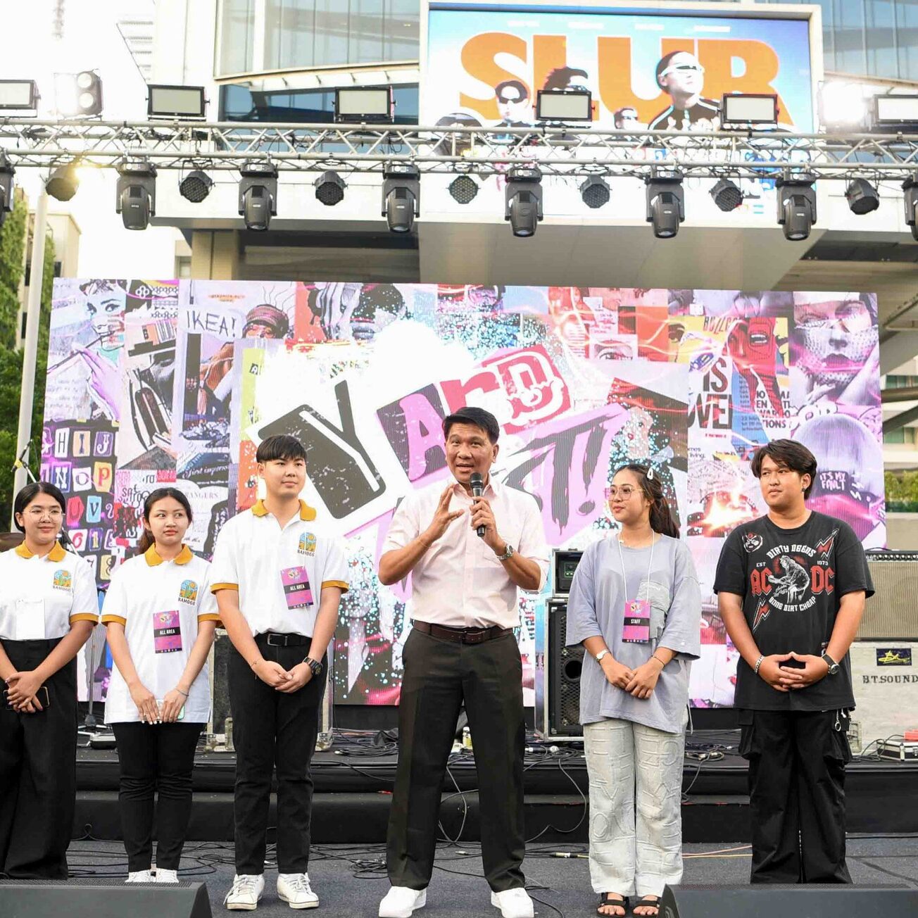 รศ.ดร.ธนวรรธน์ พลวิชัย อธิการบดีมหาวิทยาลัยหอการค้าไทย กล่าวเปิดงานและร่วมร้องเพลงโชว์ ในงาน Yard Fest! จัดโดยชมรมดนตรีสากล มหาวิทยาลัยหอการค้าไทย
