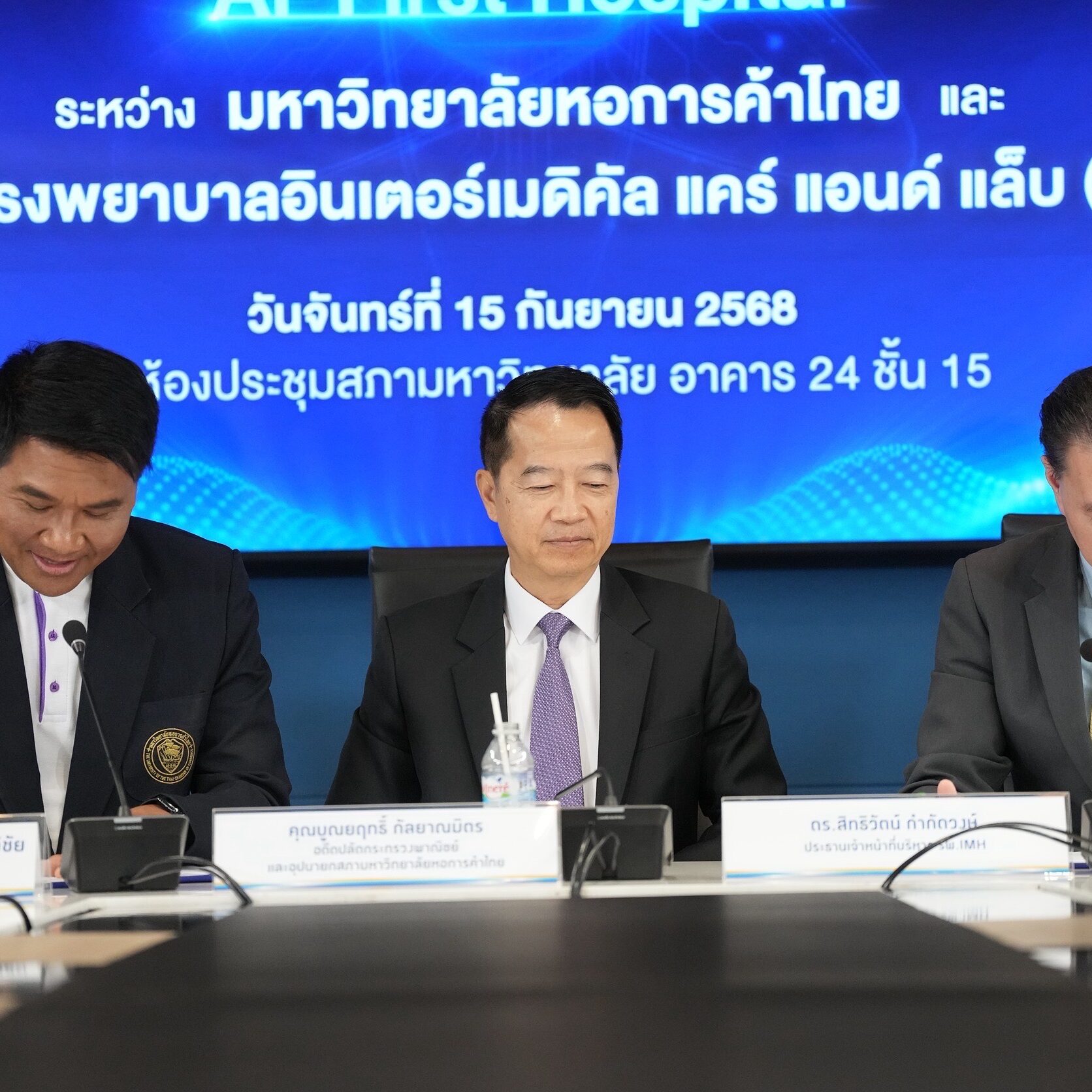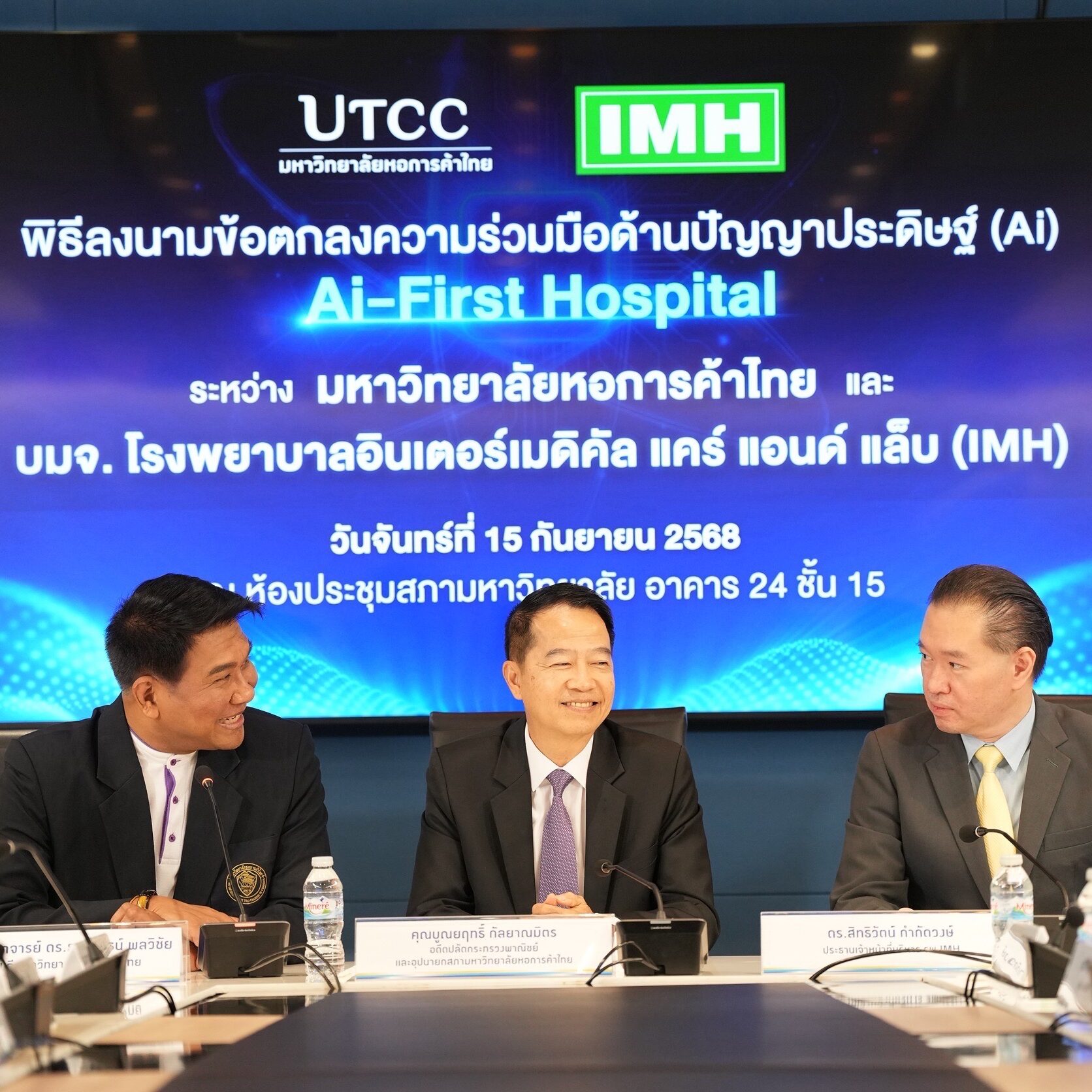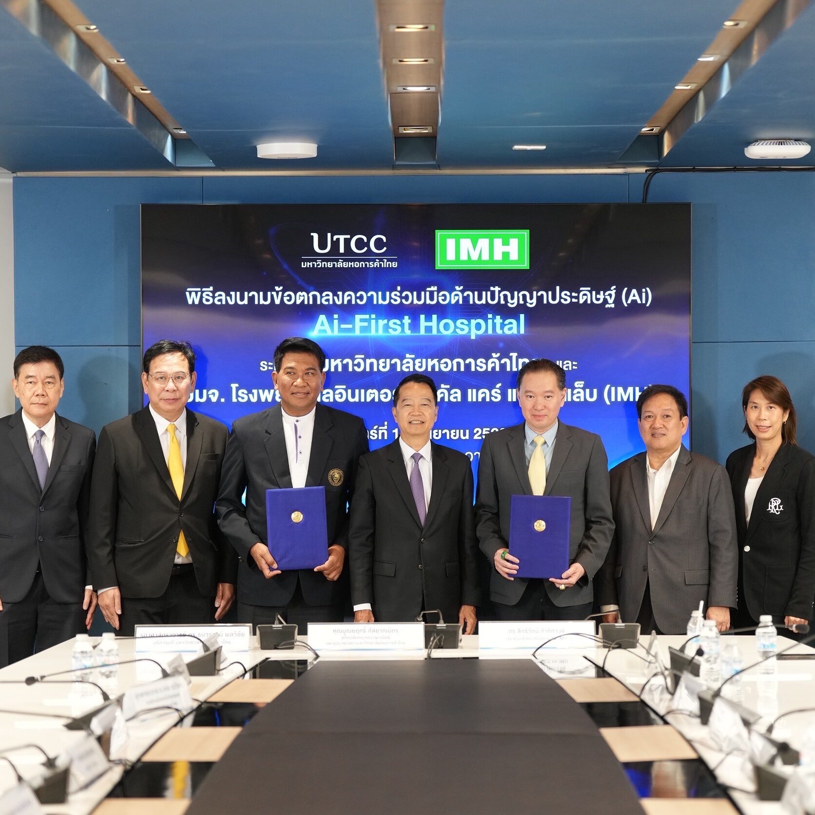 กรุงเทพฯ (วันที่ 15 กันยายน พ.ศ. 2568) มหาวิทยาลัยหอการค้าไทย UTCC ในฐานะ Ai-First University ร่วมกับโรงพยาบาลอินเตอร์เมดิคัล แคร์ แอนด์ แล็บ จำกัด (มหาชน) หรือ IMH ลงนามบันทึกข้อตกลงความร่วมมือด้านการพัฒนาปัญญาประดิษฐ์ (Ai) สำหรับสถานพยาบาล เพื่อยกระดับคุณภาพการรักษาพยาบาลของประเทศไทยสู่การพัฒนา Ai-First Hospital เป็นแห่งแรกในประเทศไทย
