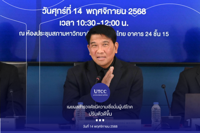 ศูนย์พยากรณ์เศรษฐกิจและธุรกิจ มหาวิทยาลัยหอการค้าไทยแถลงข่าวผลสำรวจดัชนีความเชื่อมั่นเดือนตุลาคม 2568 ชี้ผู้บริโภคปรับตัวดีขึ้นต่อเนื่อง