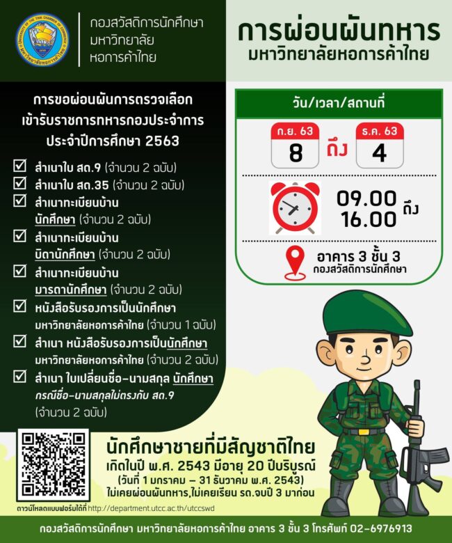 กองสวัสดิการนักศึกษา มหาวิทยาลัยหอการค้าไทย เปิดให้นักศึกษาชายที่เกิดในปี พ.ศ.2543 และกำลังศึกษาอยู่ สามารถทำเรื่องขอผ่อนผันการเกณฑ์ทหารได้