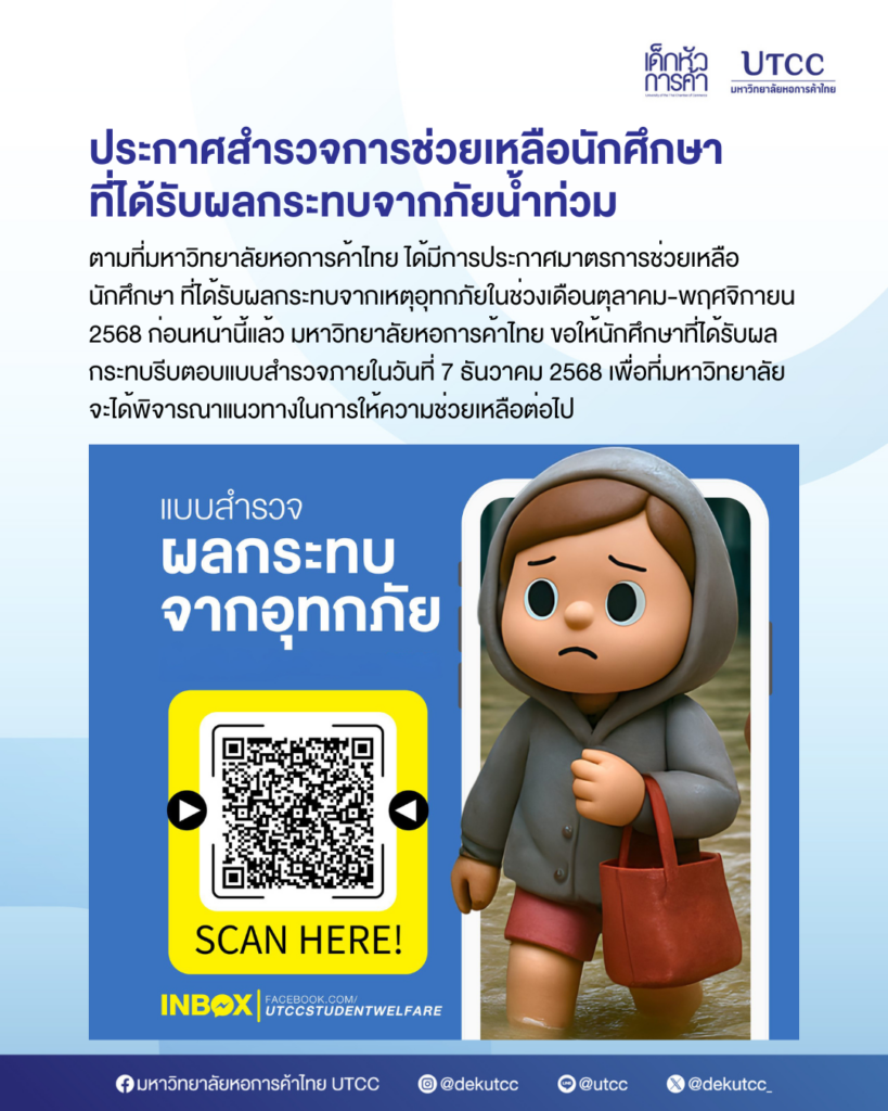 เข้ามาตอบแบบสำรวจความเสียหายกันนะคะ เพื่อที่ UTCC จะได้นำมาพิจารณาการให้ความช่วยเหลือต่อไป