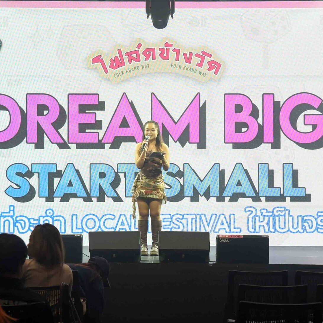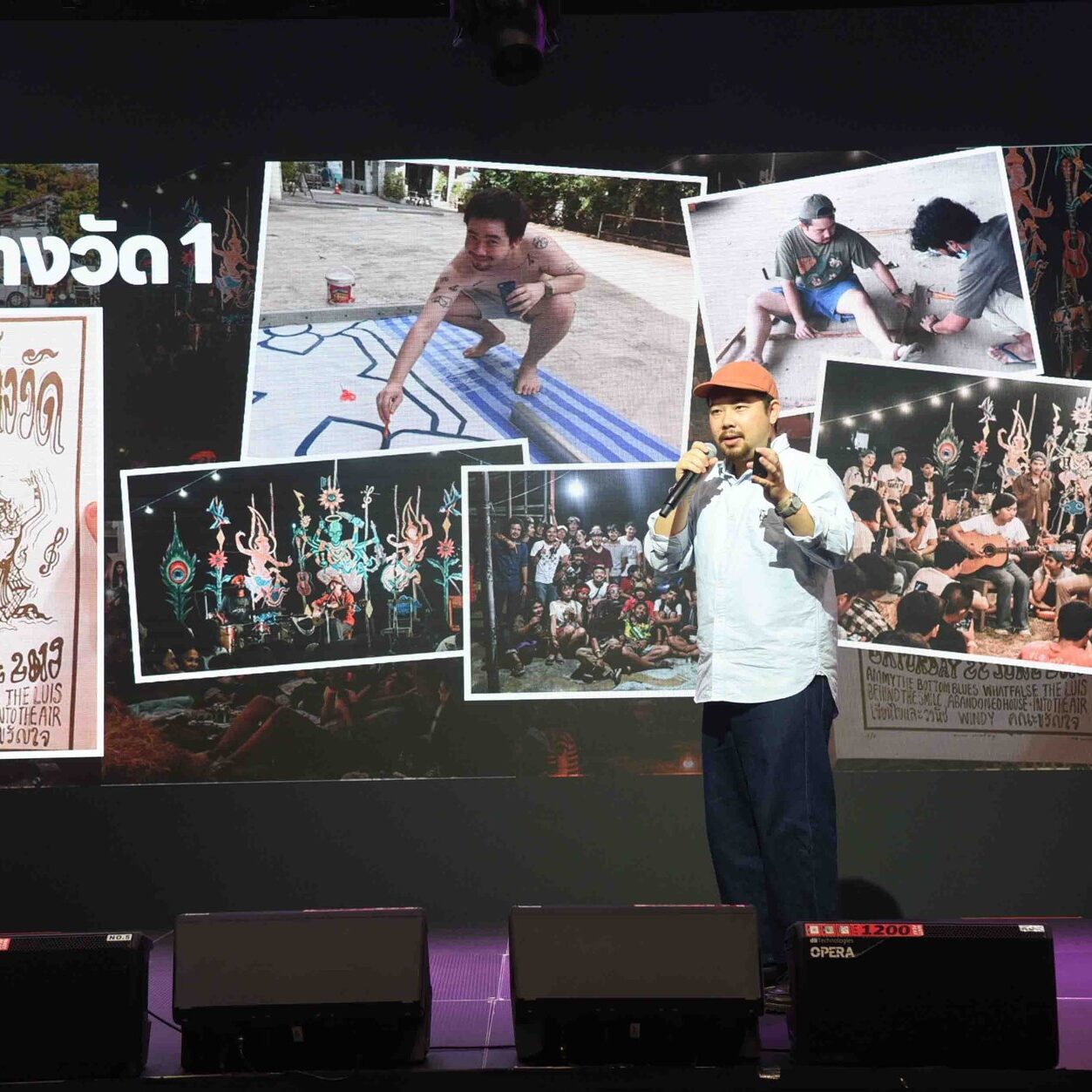 อาจารย์ ดร.รุจิภาส บุญสำเร็จ รองคณบดีฝ่ายกิจการนักศึกษา คณะการท่องเที่ยวและอุตสาหกรรมบริการ มหาวิทยาลัยหอการค้าไทย อาจารย์ผู้สอนวิชาการจัดงานคอนเสิร์ตและเทศกาลดนตรี สาขาวิชาการผลิตและการจัดการอีเว้นท์ กล่าวต้อนรับและมอบกระเช้าของที่ระลึกให้ “พี่ปูน” คุณธนบดี คัชมาตย์ ผู้ก่อตั้ง “โฟล์คข้างวัด” ในโอกาสมาถ่ายทอดประสบการณ์เจาะลึกแนวคิดการสร้าง Local Festival ให้เป็นจริง ในหัวข้อ “Dream Big, Start Small กล้าทำ Local Festival ให้เป็นจริง”