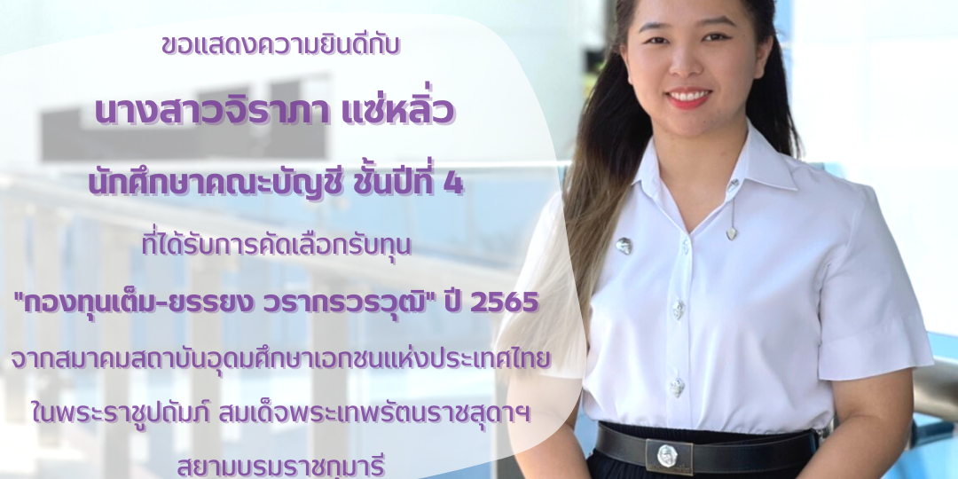 มหาวิทยาลัยหอการค้าไทย ขอแสดงความยินดีกับนางสาวจิราภา แซ่หลิ่ว นักศึกษาคณะบัญชี ชั้นปีที่ 4 ที่ได้รับการคัดเลือกรับทุน “กองทุนเต็ม-ยรรยง วรากรวรวุฒิ” ประจำปีการศึกษา 2565 จากสมาคมสถาบันอุดมศึกษาเอกชนแห่งประเทศไทย ในพระราชูปถัมภ์ สมเด็จพระเทพรัตนราชสุดาฯ สยามบรมราชกุมารี