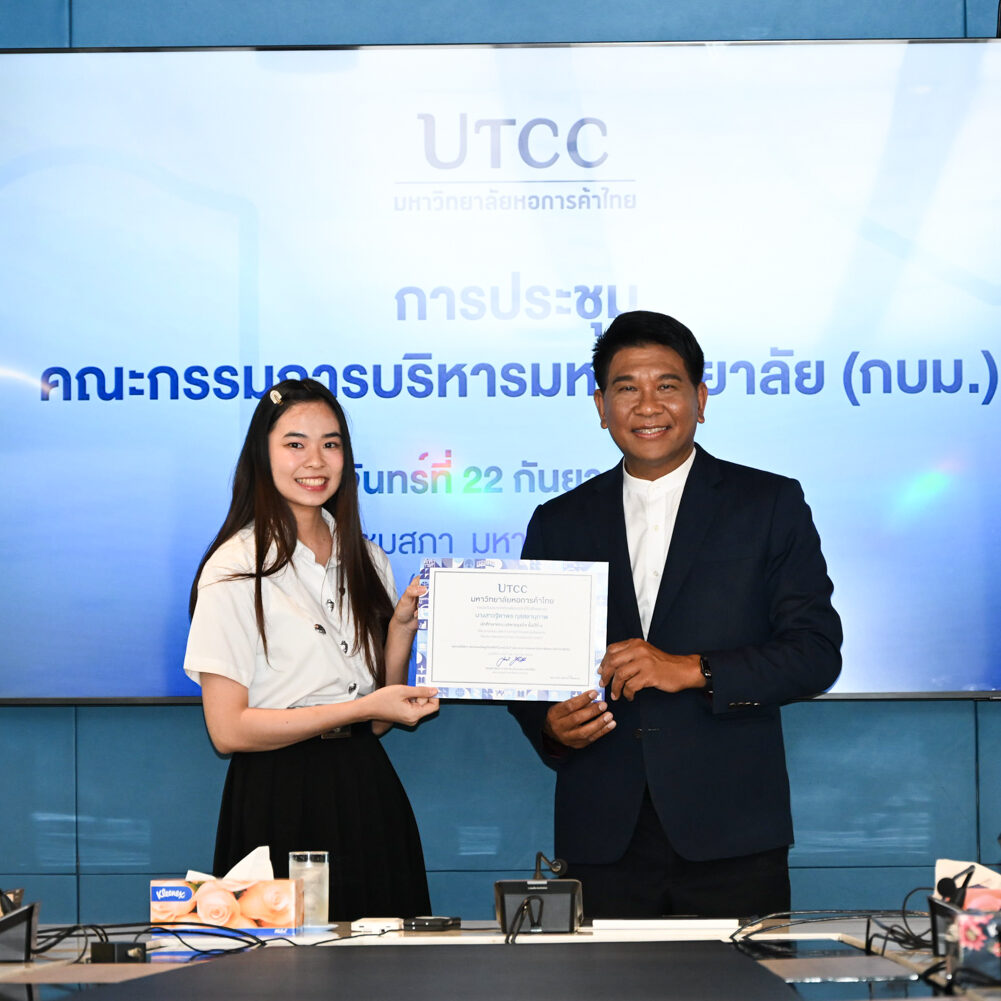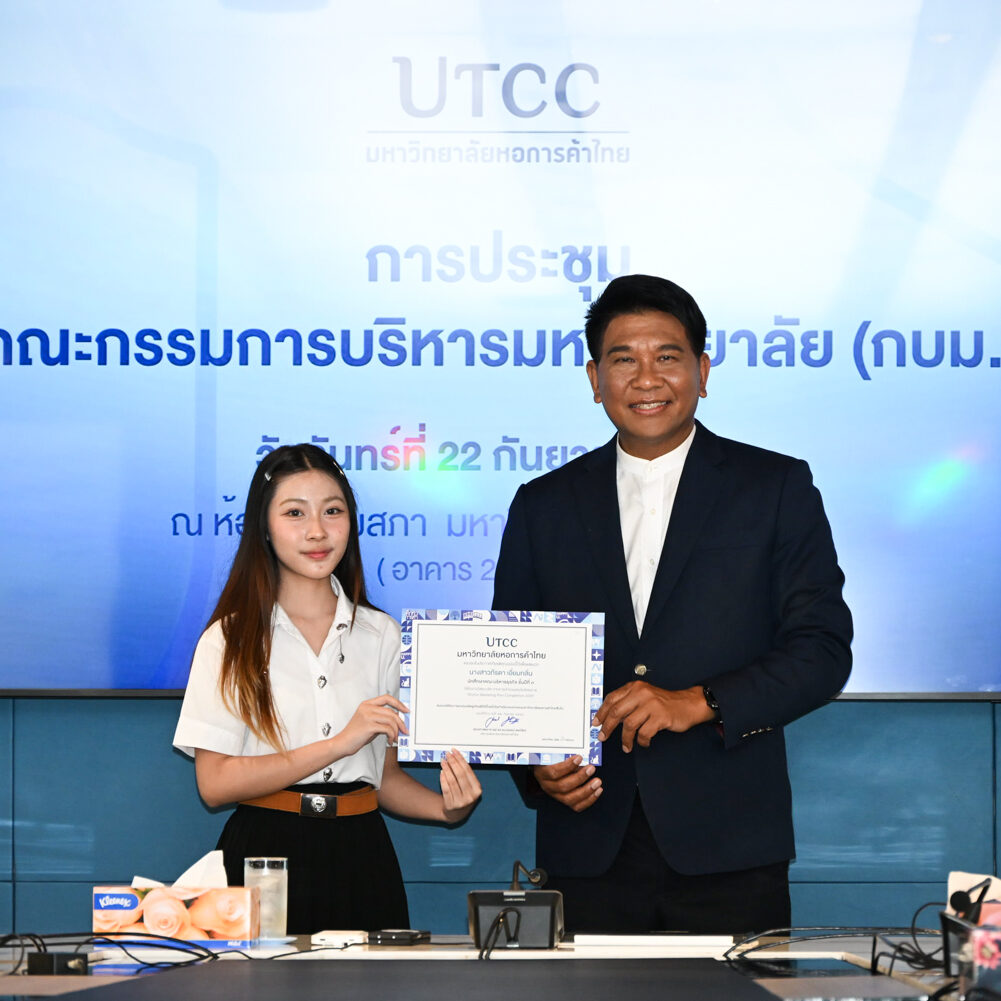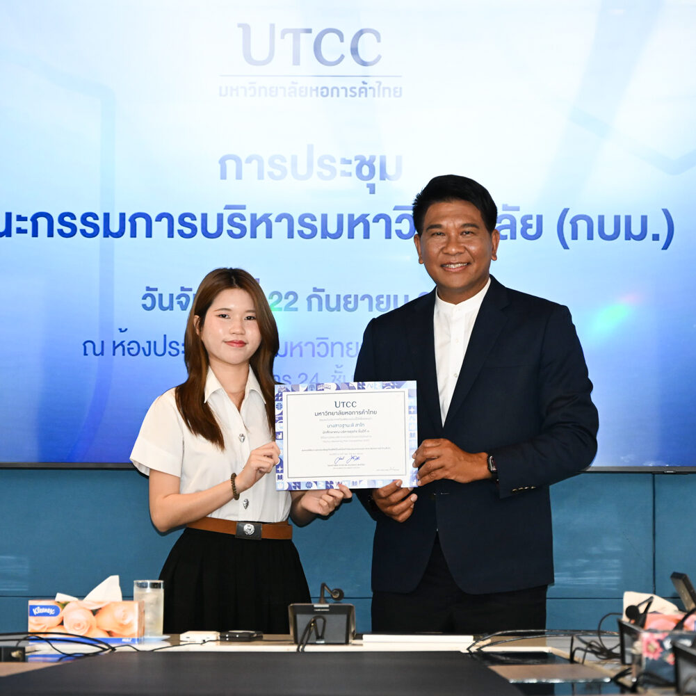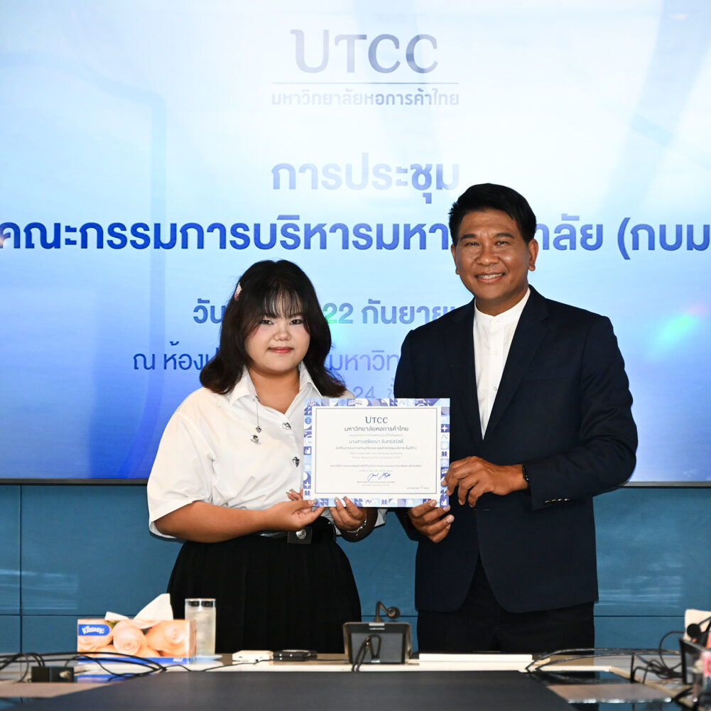รองศาสตราจารย์ ดร.ธนวรรธน์ พลวิชัย อธิการบดีมหาวิทยาลัยหอการค้าไทย ให้เกียรติมอบเกียรติบัตรให้แก่นักศึกษาคณะบริหารธุรกิจ และนักศึกษาคณะการท่องเที่ยวและอุตสาหกรรมบริการ ชั้นปีที่ 3 ที่ได้รับรางวัลชนะเลิศ จากการเข้าร่วมการแข่งขัน Skyfun Marketing Plan Competition 2025 โดยมี คณาจารย์ทั้ง 2 คณะร่วมแสดงความยินดี เมื่อวันที่ 22 กันยายน 2568