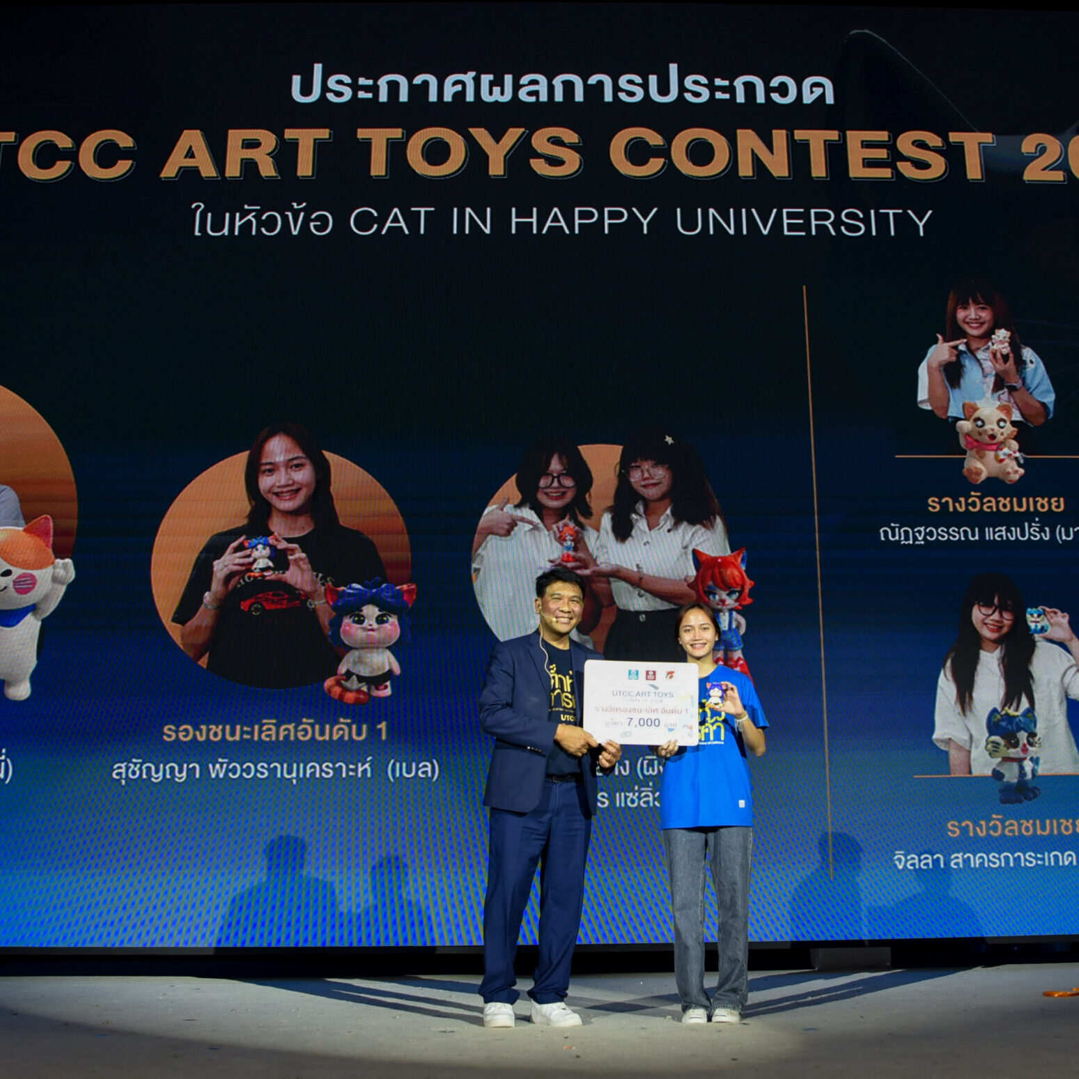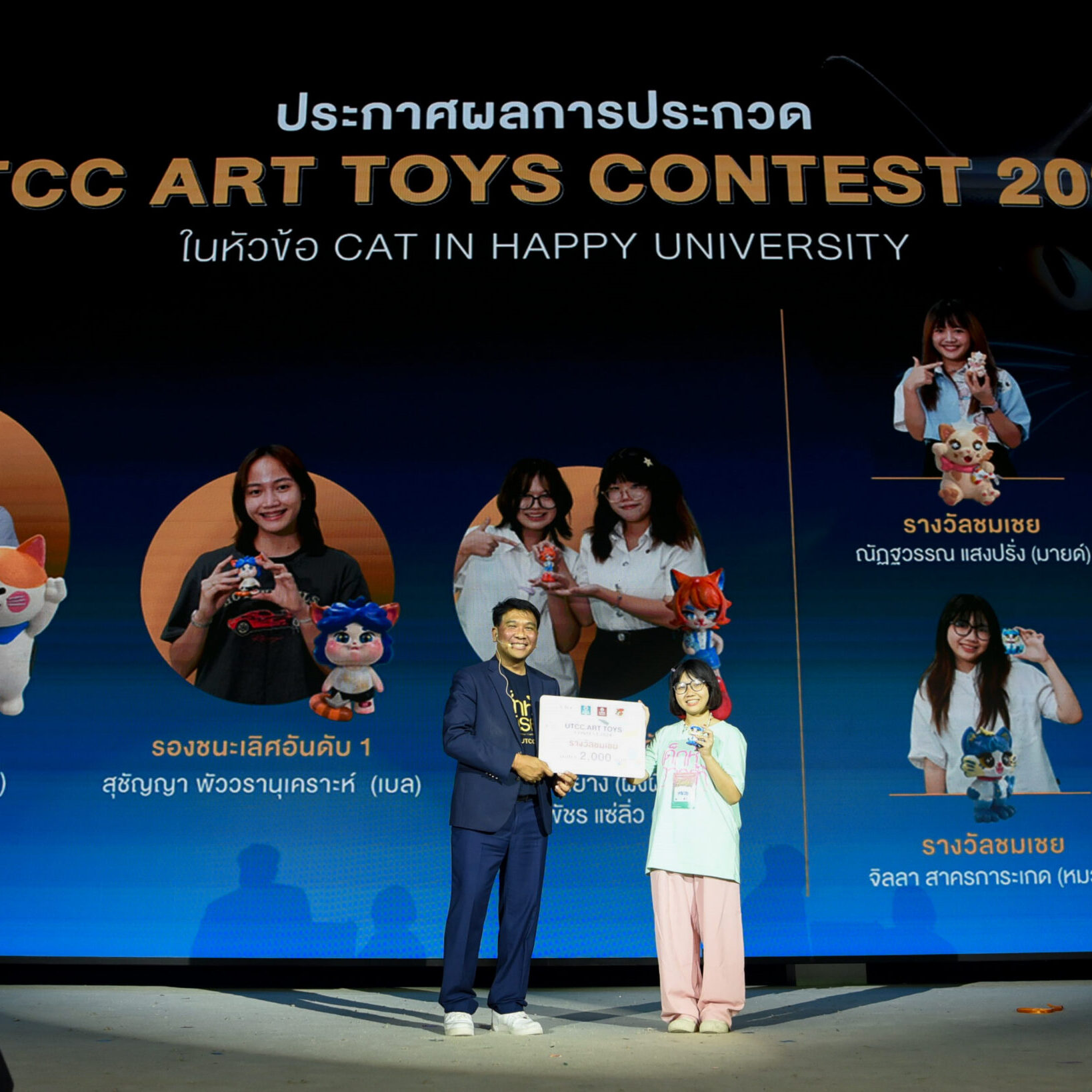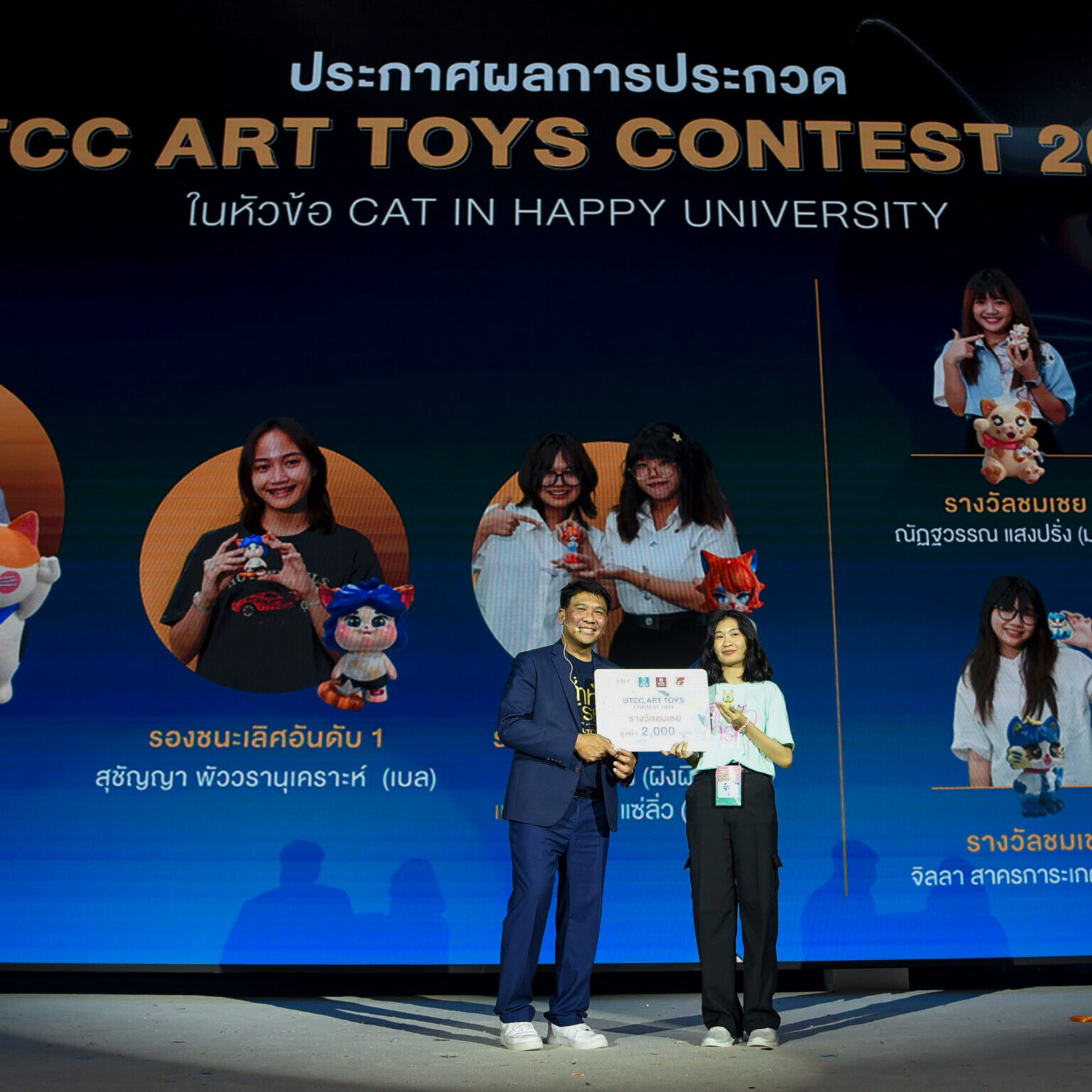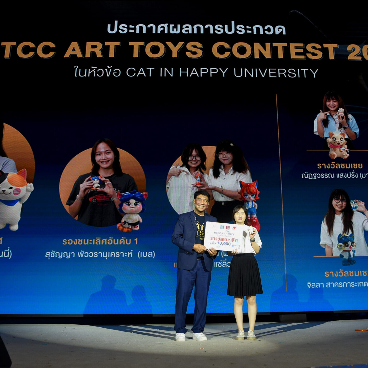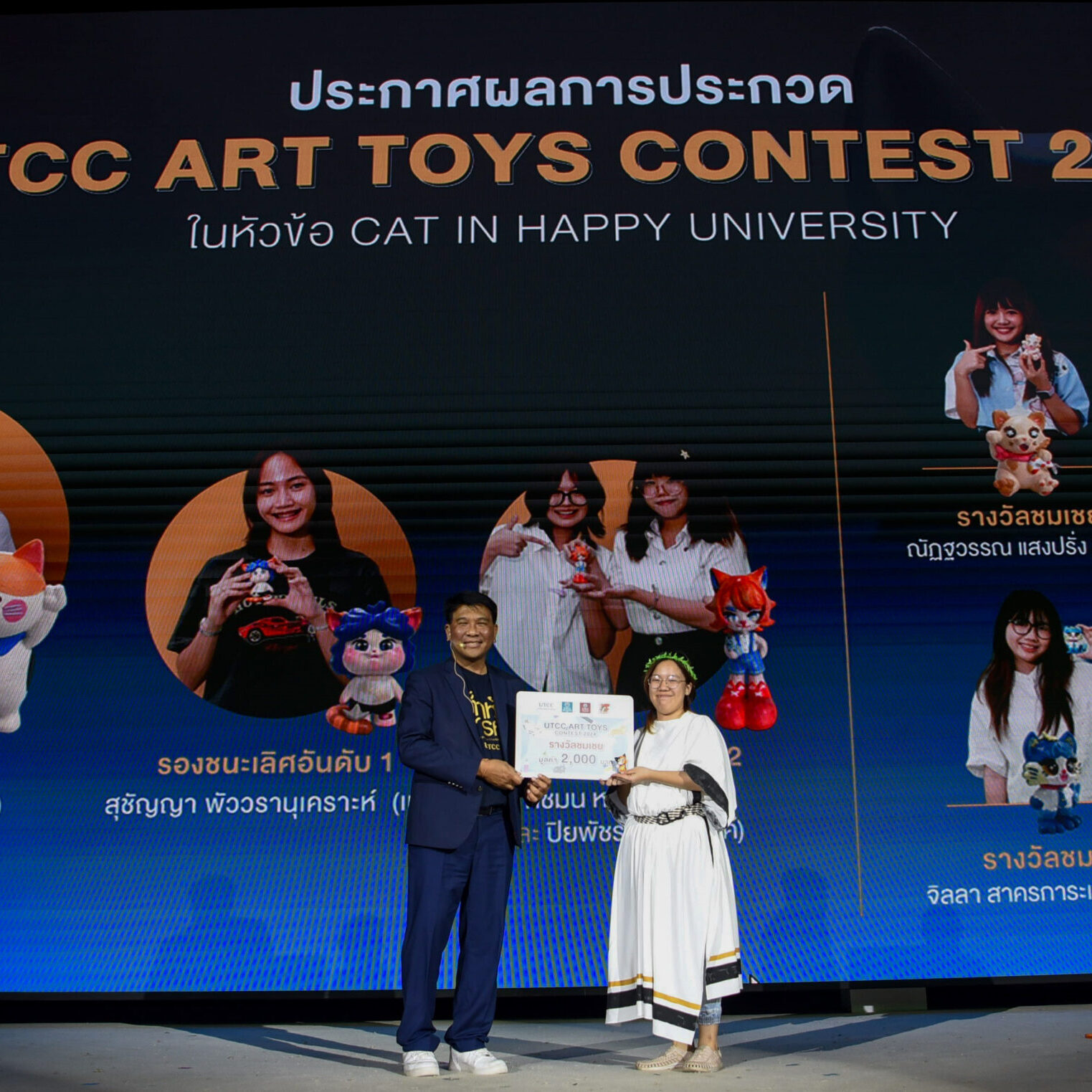 รองศาสตราจารย์ ดร.ธนวรรธน์ พลวิชัย อธิการบดีมหาวิทยาลัยหอการค้าไทย ให้เกียรติมอบรางวัลให้กับนักศึกษาที่ได้รับรางวัลจากการเข้าร่วมประกวด UTCC ART TOYS CONTEST 2024 ในคอนเซ็ปต์ CAT IN HAPPY UNIVERSITY สำหรับนักศึกษาที่ได้รับรางวัลต่างๆ ได้แก่