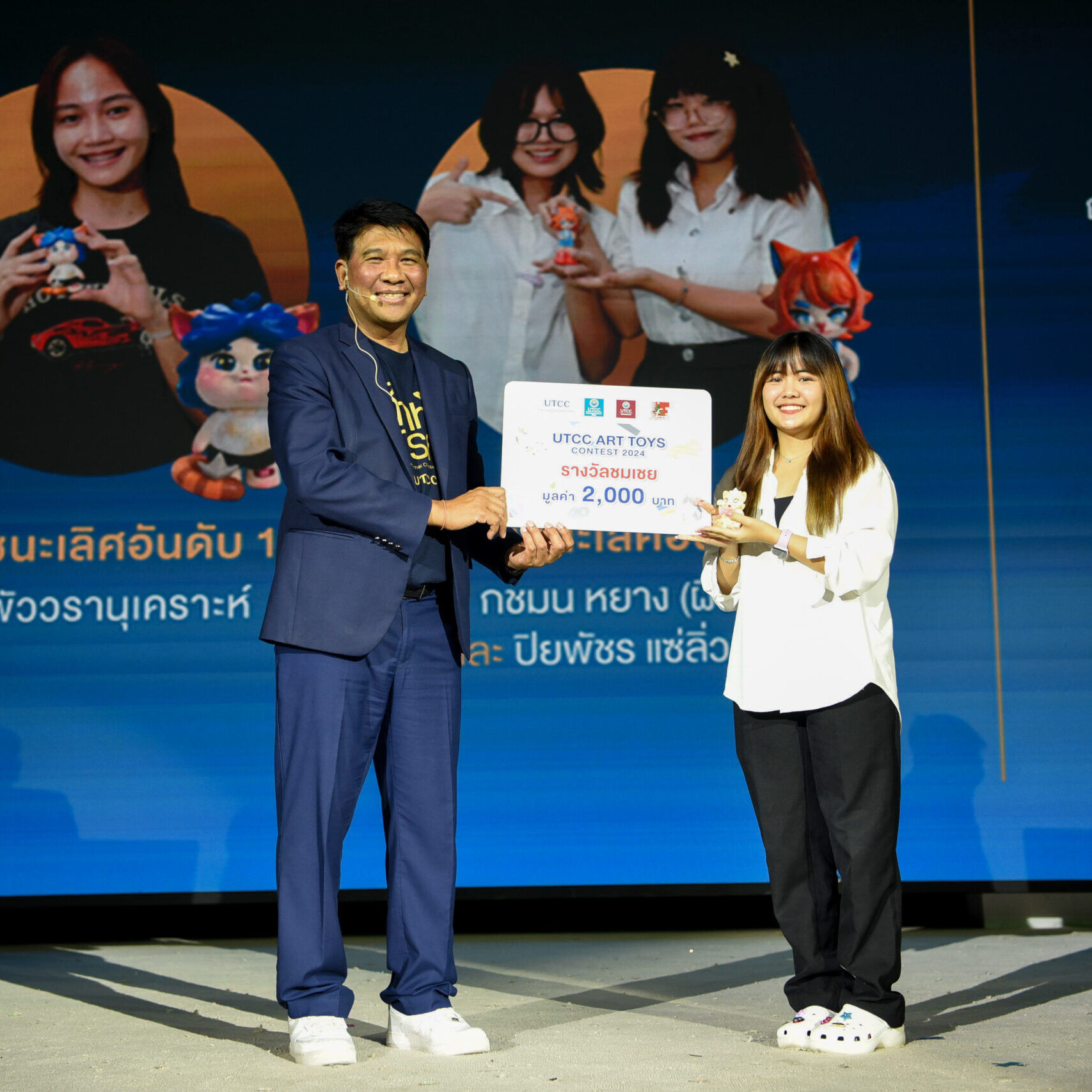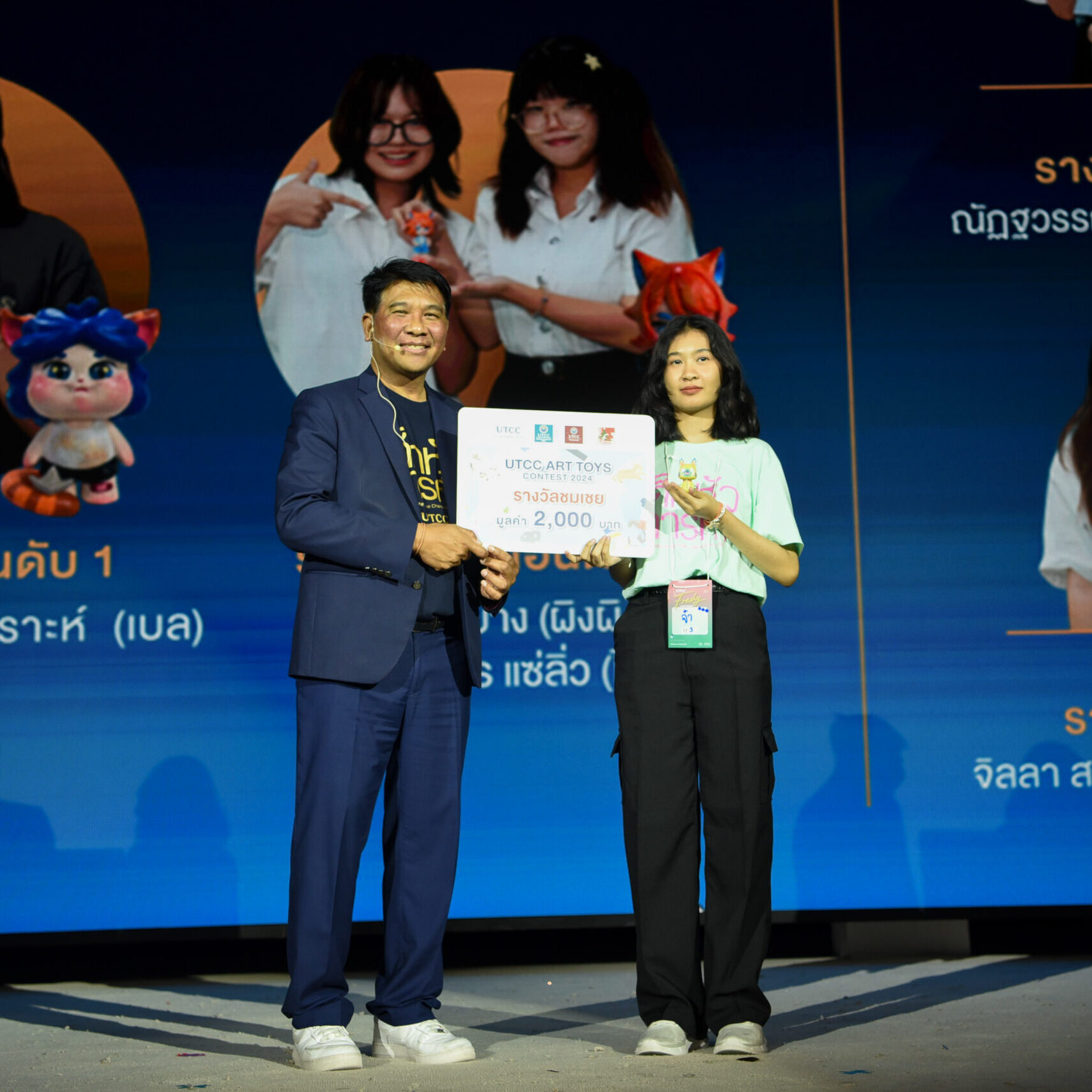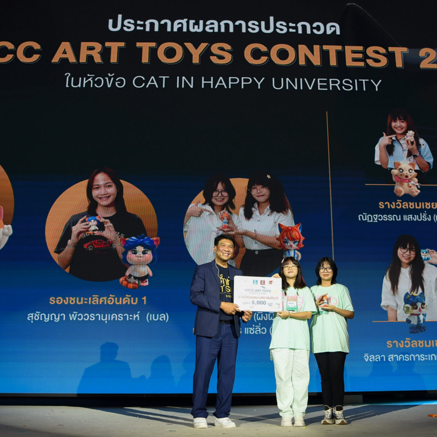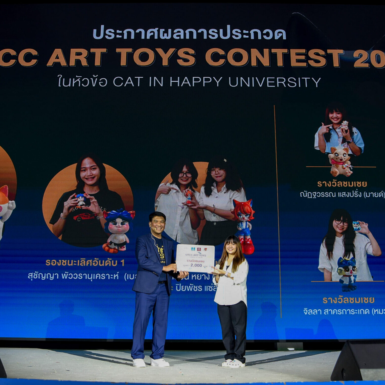 รองศาสตราจารย์ ดร.ธนวรรธน์ พลวิชัย อธิการบดีมหาวิทยาลัยหอการค้าไทย ให้เกียรติมอบรางวัลให้กับนักศึกษาที่ได้รับรางวัลจากการเข้าร่วมประกวด UTCC ART TOYS CONTEST 2024 ในคอนเซ็ปต์ CAT IN HAPPY UNIVERSITY สำหรับนักศึกษาที่ได้รับรางวัลต่างๆ ได้แก่