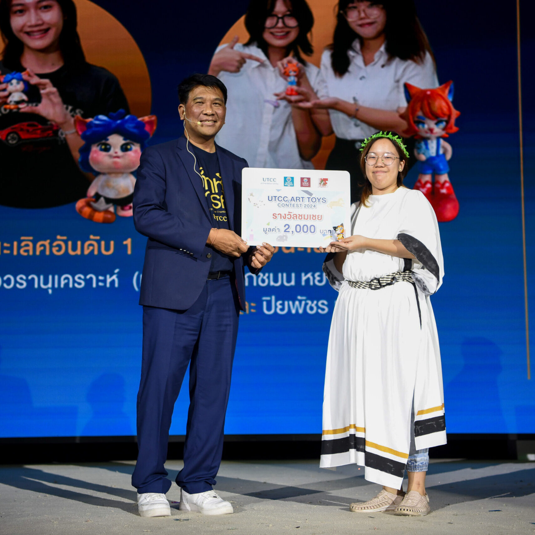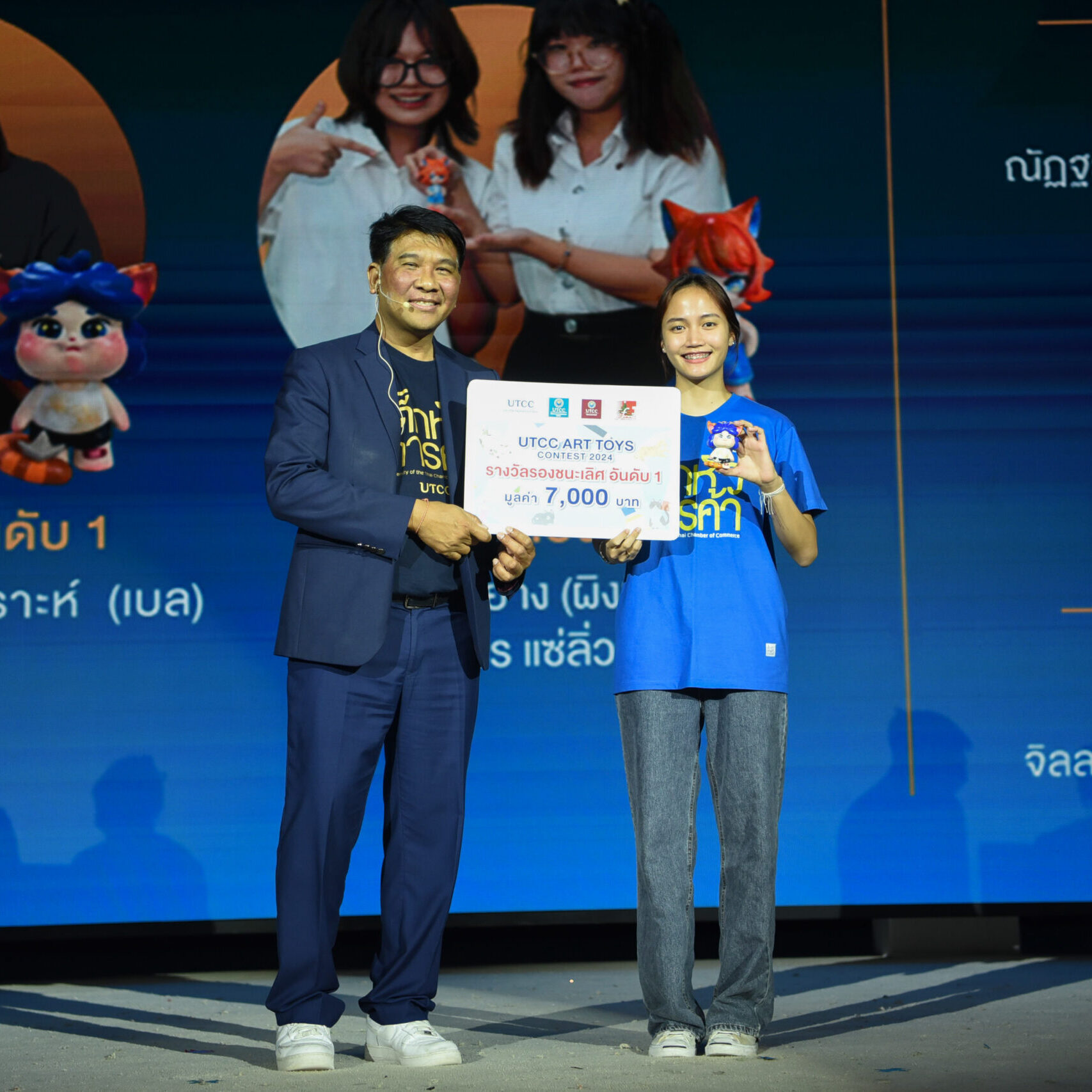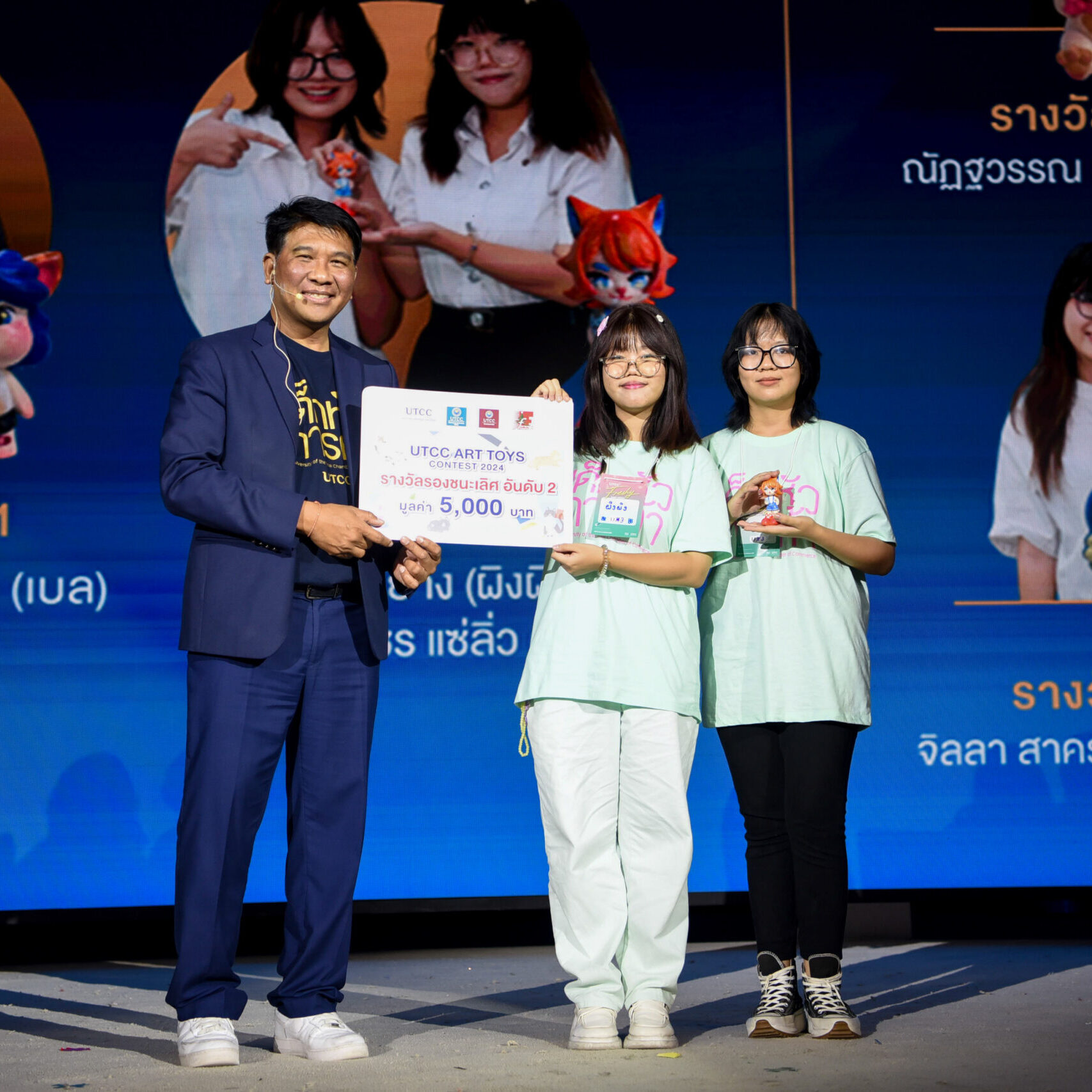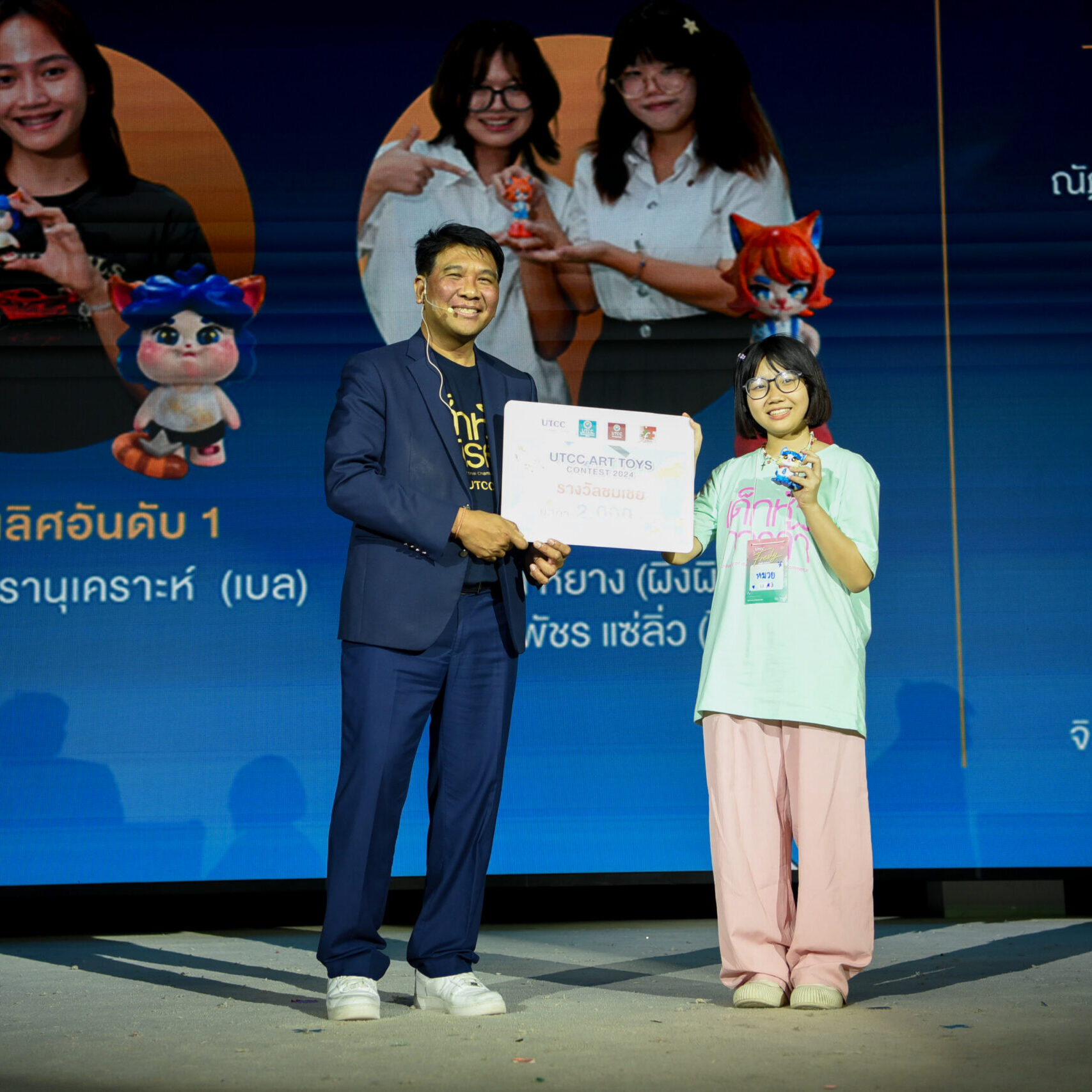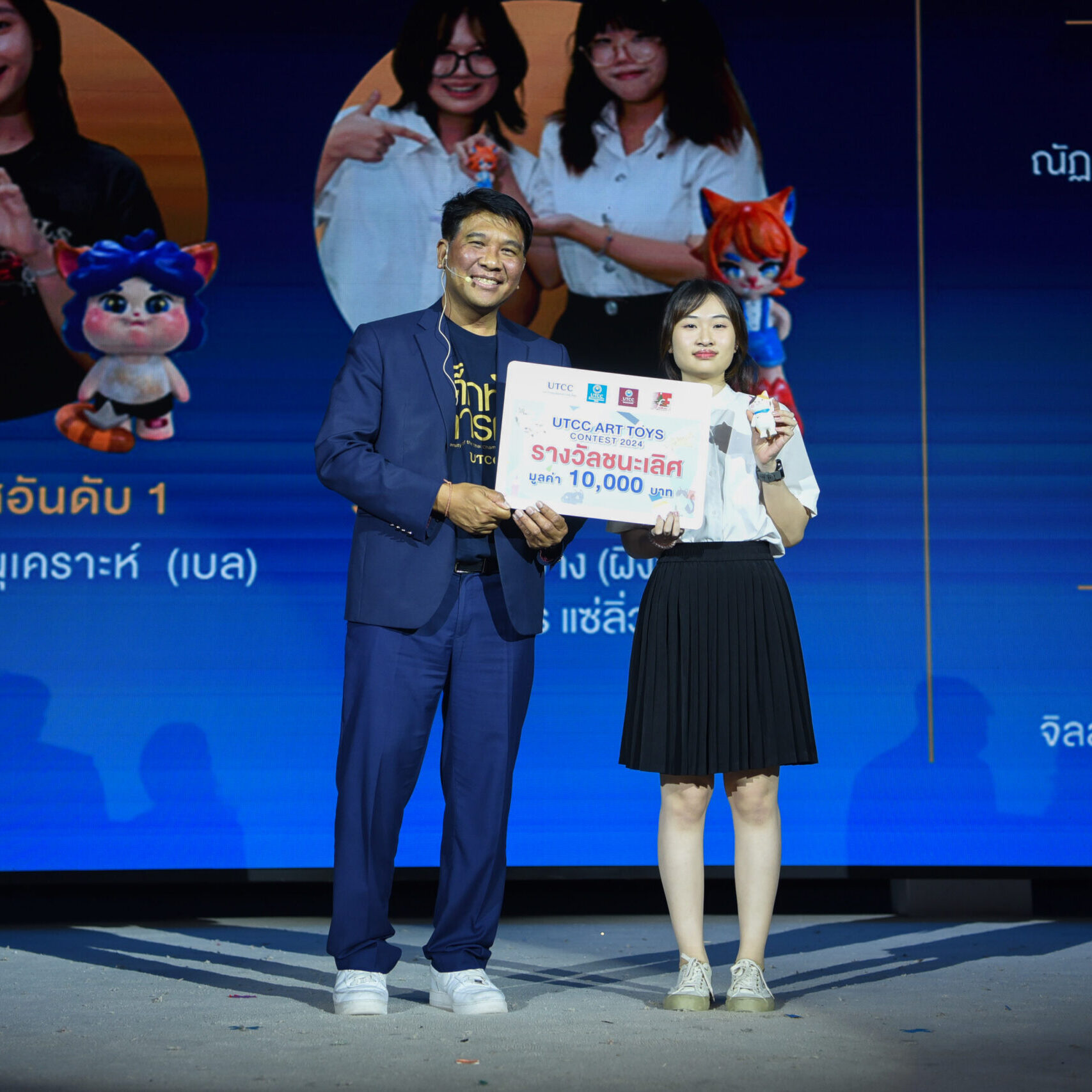 รองศาสตราจารย์ ดร.ธนวรรธน์ พลวิชัย อธิการบดีมหาวิทยาลัยหอการค้าไทย ให้เกียรติมอบรางวัลให้กับนักศึกษาที่ได้รับรางวัลจากการเข้าร่วมประกวด UTCC ART TOYS CONTEST 2024 ในคอนเซ็ปต์ CAT IN HAPPY UNIVERSITY สำหรับนักศึกษาที่ได้รับรางวัลต่างๆ ได้แก่