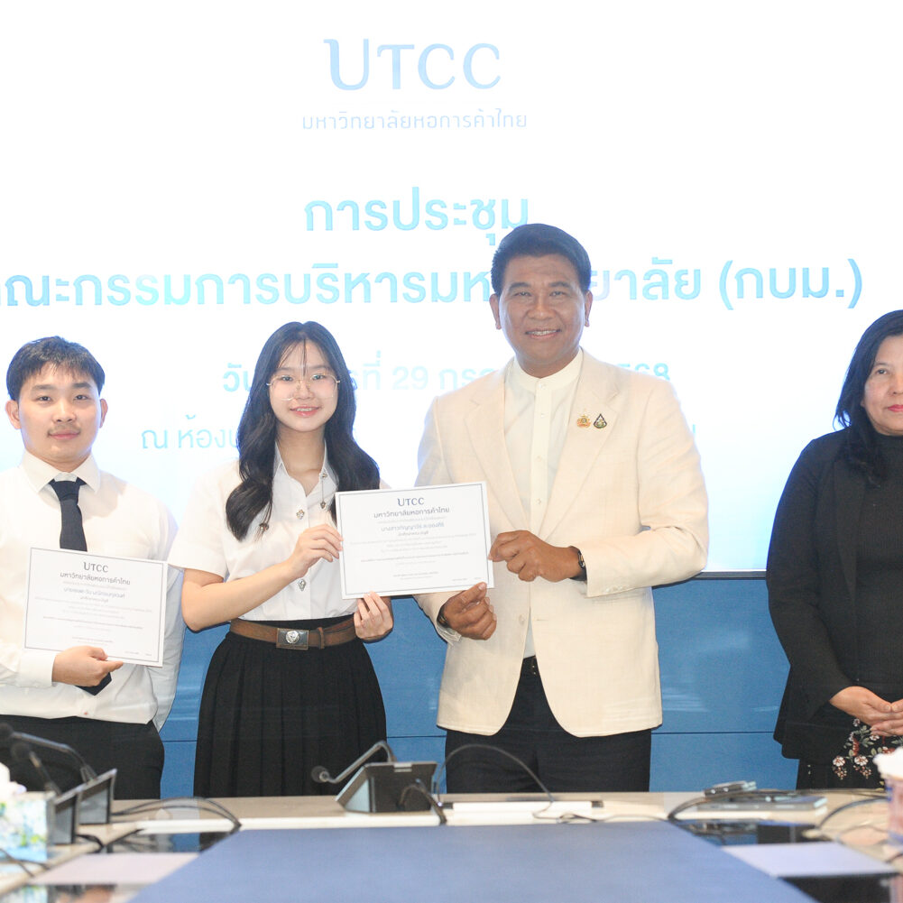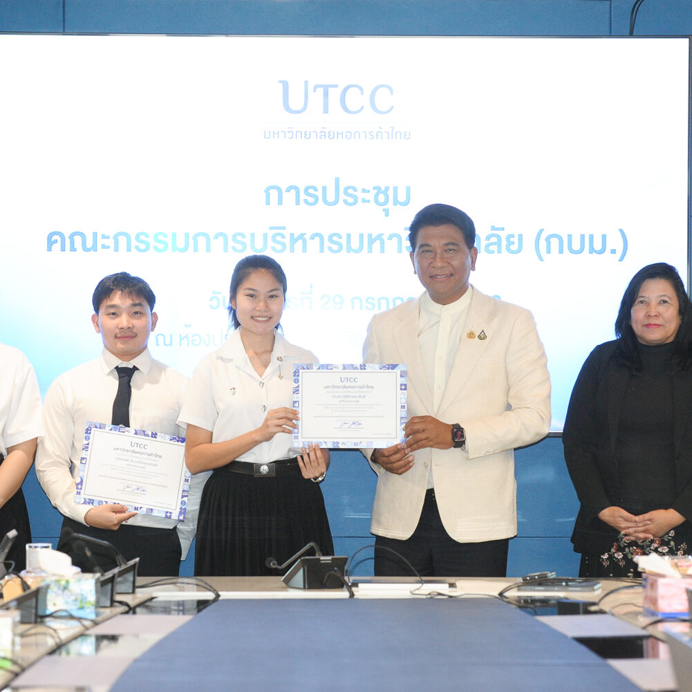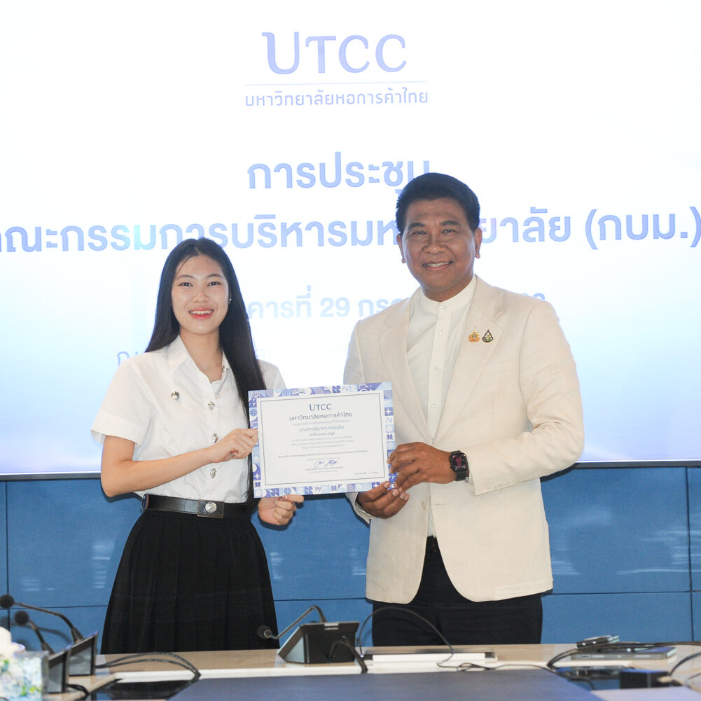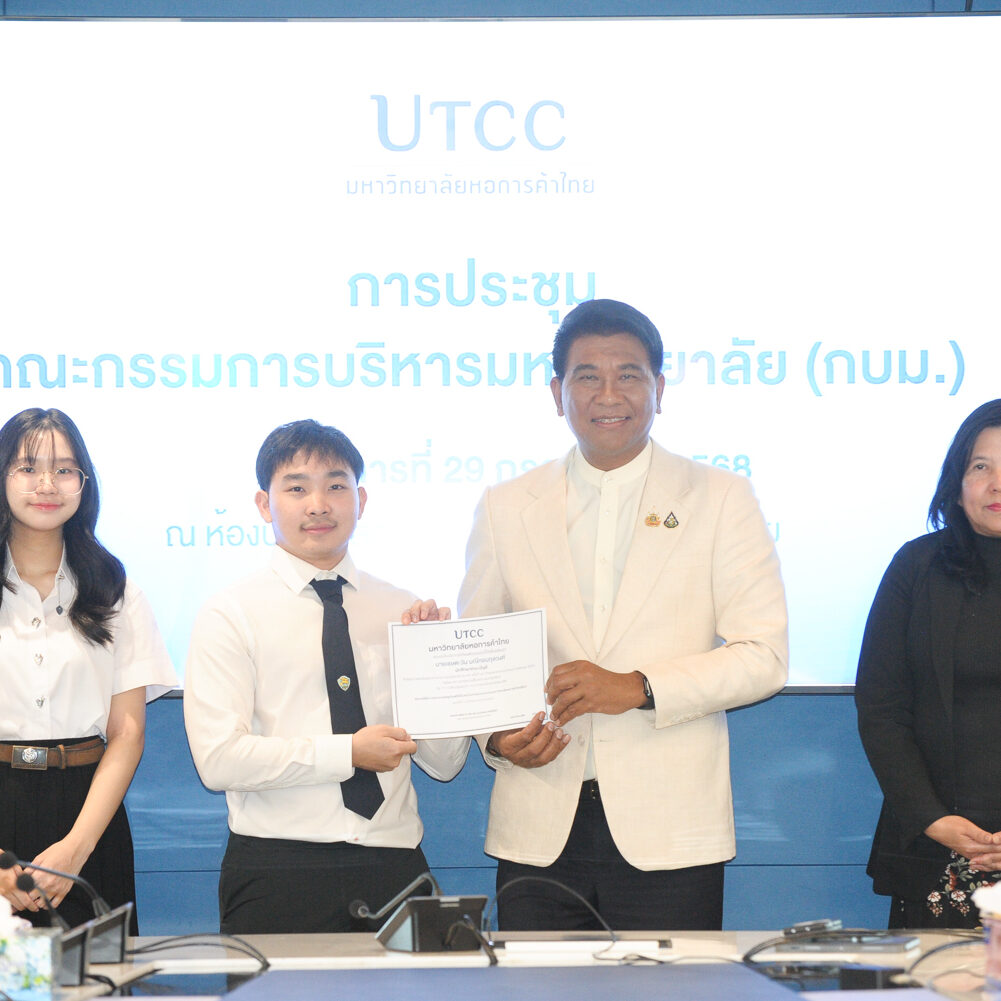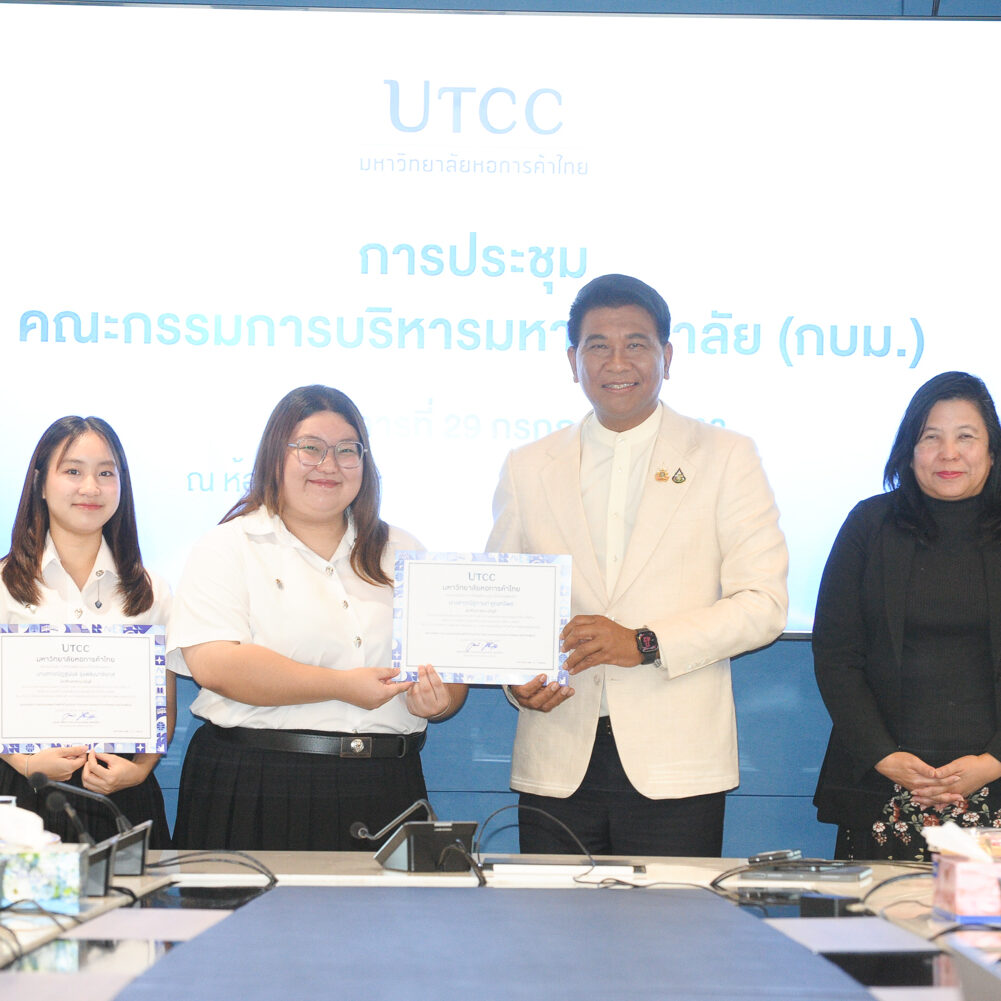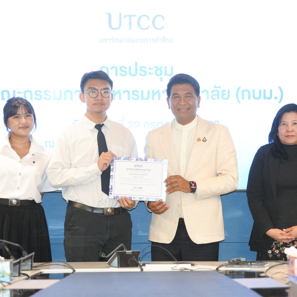 รองศาสตราจารย์ ดร.ธนวรรธน์ พลวิชัย อธิการบดีมหาวิทยาลัยหอการค้าไทย ให้เกียรติมอบเกียรติบัตรให้แก่นักศึกษาคณะบัญชี ในโอกาสที่นักศึกษาคณะบัญชีได้เข้าร่วมการแข่งขันตอบคำถามทางบัญชีระดับประเทศ ครั้งที่ 11 (เมื่อวันเสาร์ที่ 25 มกราคม 2568 ที่ผ่านมา) โดยนักศึกษาคณะบัญชี 3 คนได้อันดับที่ 8 จากการแข่งขันรอบชิงชนะเลิศ (จาก 120 ทีม 66 สถาบันการศึกษา) และได้รับรางวัลชนะเลิศ รางวัลรองชนะเลิศอันดับ 2 และรางวัลชมเชยจากเข้าร่วมการแข่งขันตอบปัญหาทางด้านวิชาการด้านการบัญชี ระดับมหาวิทยาลัย ครั้งที่ 18 การประกวดสุนทรพจน์และเขียนเรียงความครั้งที่ 12 และการแข่งขันตอบปัญหาทางวิชาการด้านการตรวจสอบและควบคุมภายในครั้งที่ 1 (เมื่อวันที่ 4กรกฎาคม 2568 ที่ผ่านมา) โดยมี ผู้ช่วยศาสตราจารย์ จันทร์เจ้า สุภรรุ่งเจริญ คณบดีคณะบัญชี ร่วมแสดงความยินดี เมื่อวันที่ 29 กรกฎาคม 2568