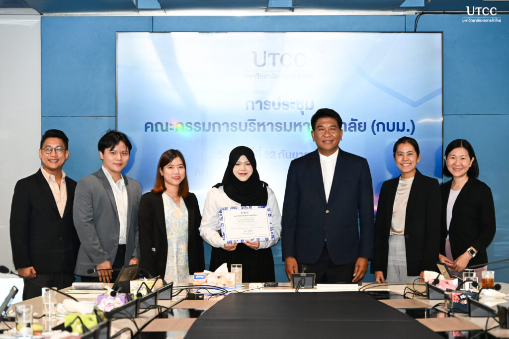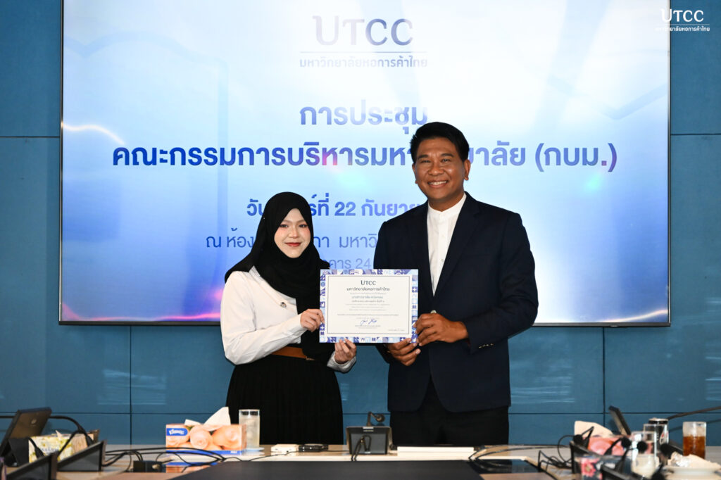 รองศาสตราจารย์ ดร.ธนวรรธน์ พลวิชัย อธิการบดีมหาวิทยาลัยหอการค้าไทย ให้เกียรติมอบเกียรติบัตรให้แก่นักศึกษา นางสาวนาเดีย หวังเกษม คณะบริหารธุรกิจ ชั้นปีที่ 1 ที่ได้รับรางวัลชนะเลิศ จากผลงาน “ความสวยอยู่ที่หลังฉลาก” จากการเข้าร่วมในโครงการประกวดคลิป TikTok ภายใต้แนวคิด “อย. อยู่คู่สังคมไทย”จัดโดยสำนักงานคณะกรรมการอาหารและยา (อย.) โดยมีคณาจารย์จากคณะบริหารธุรกิจ ร่วมแสดงความยินดี เมื่อวันที่ 22 กันยายน 2568