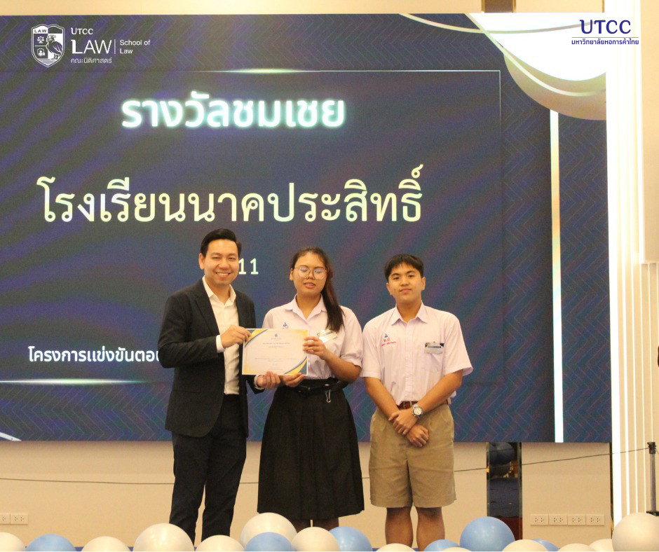 ผู้ช่วยศาสตราจารย์ ดร.ประพันธ์พงษ์ ขำอ่อน คณบดีคณะนิติศาสตร์ มหาวิทยาลัยหอการค้าไทยมอบรางวัลให้กับผู้ที่ได้รับรางวัลจากการจัดกิจกรรมการแข่งขันตอบปัญหาด้านกฎหมาย จัดโดยคณะนิติศาสตร์ มหาวิทยาลัยหอการค้าไทย ณ ห้องไทรทอง เมื่อวันที่ 13 พฤศจิกายน 2568 ที่ผ่านมา