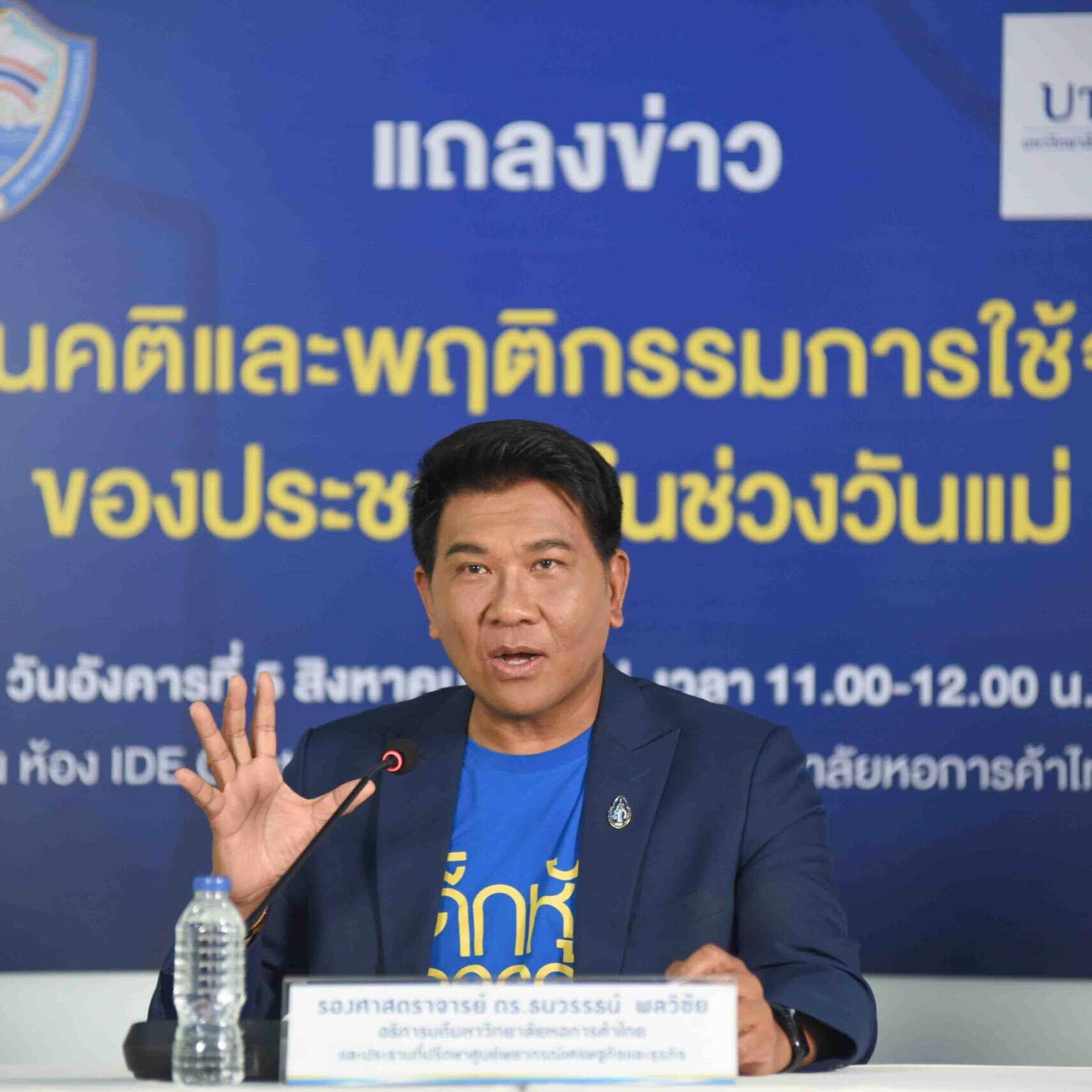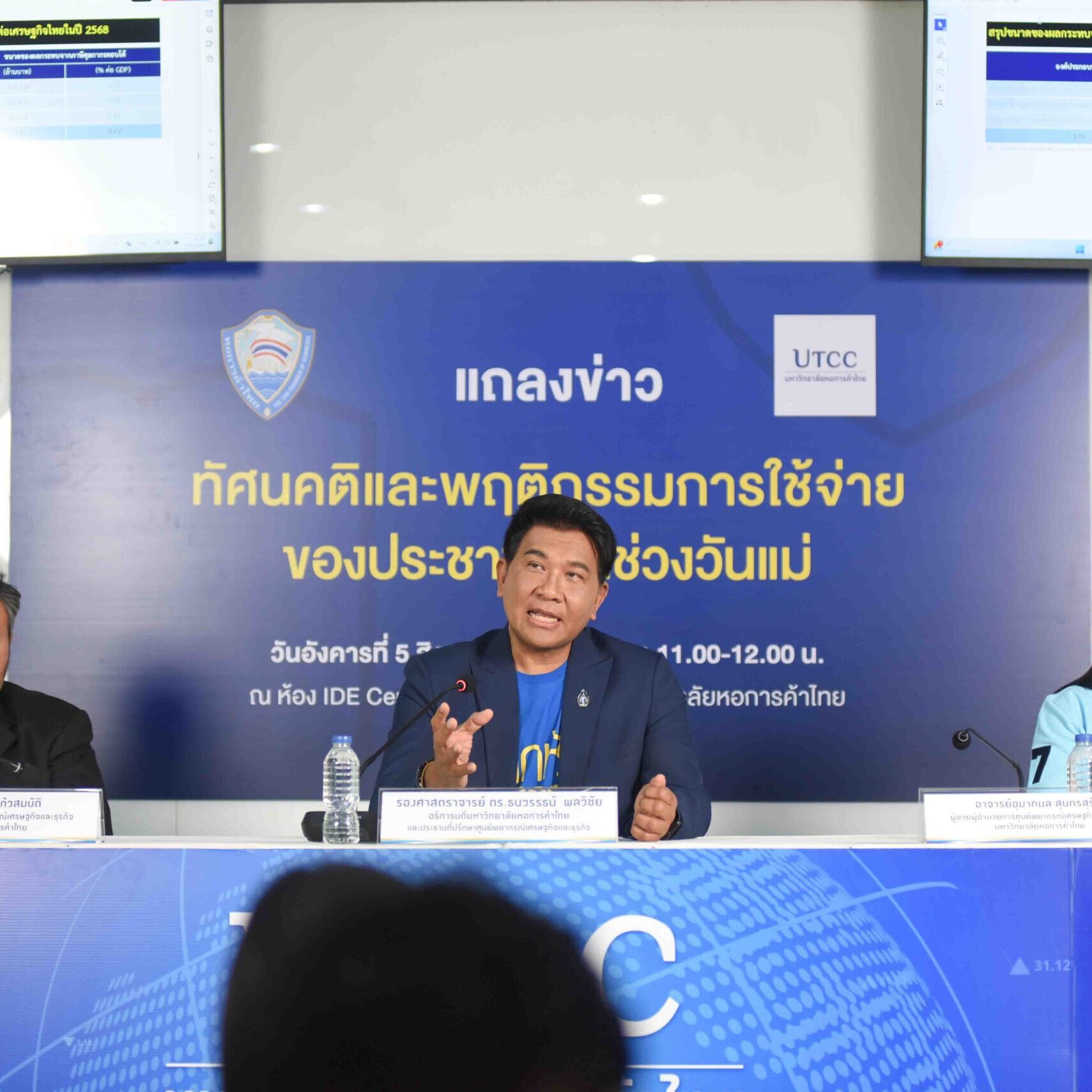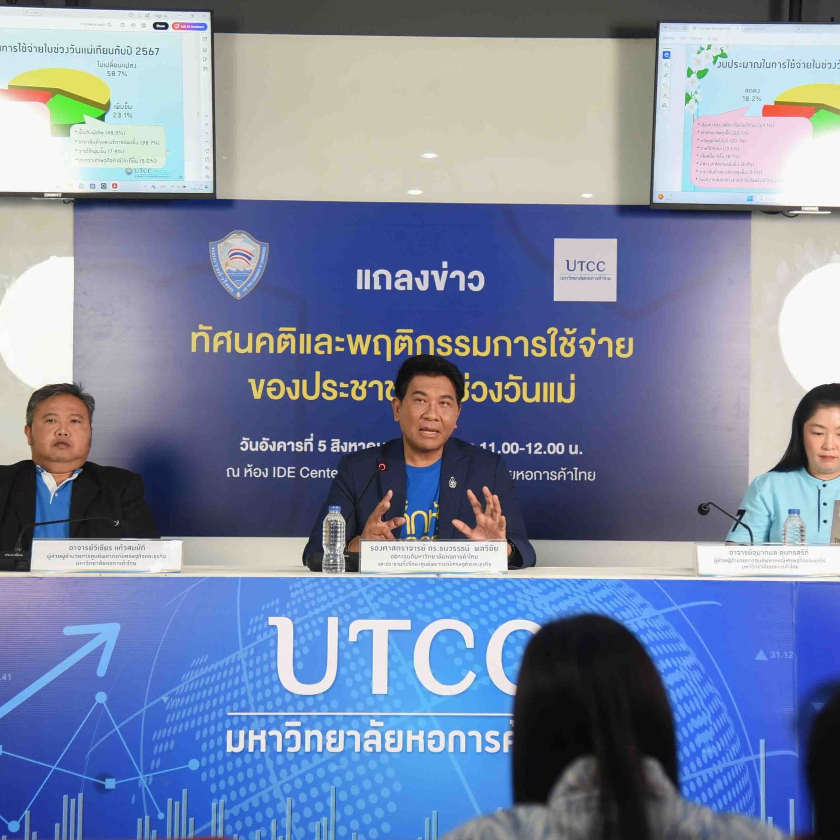 รองศาสตราจารย์ ดร.ธนวรรธน์ พลวิชัย อธิการบดี และประธานที่ปรึกษาศูนย์พยากรณ์เศรษฐกิจและธุรกิจ มหาวิทยาลัยหอการค้าไทย พร้อมด้วย อาจารย์อุมากมล สุนทรสุรัติ ผู้ช่วยผู้อำนวยการศูนย์พยากรณ์เศรษฐกิจและธุรกิจ แถลงข่าว ผลสำรวจทัศนคติและพฤติกรรมการใช้จ่ายของประชาชนในช่วงวันแม่ ประจำปี 2568 พบว่า จากการสำรวจประชาชน 1,422 ตัวอย่าง พบ 58% เห็นว่าวันแม่มีบทบาทสำคัญในการเสริมสร้างความสัมพันธ์ครอบครัว ด้านพฤติกรรมการใช้จ่าย 71% ซื้อของขวัญให้แม่ โดยนิยมให้เงินสด/ทอง เฉลี่ย 3,116 บาท มากที่สุด