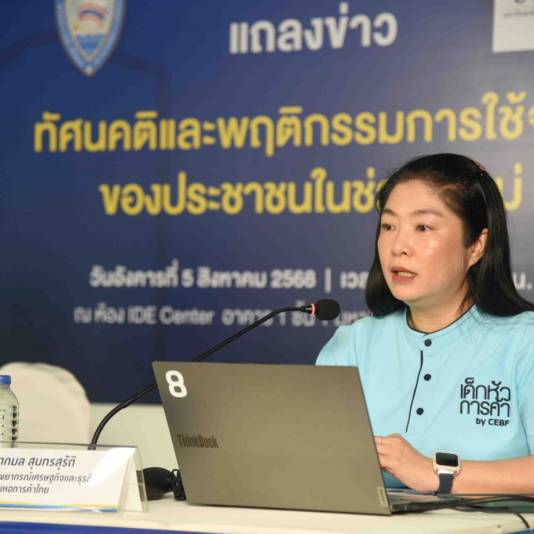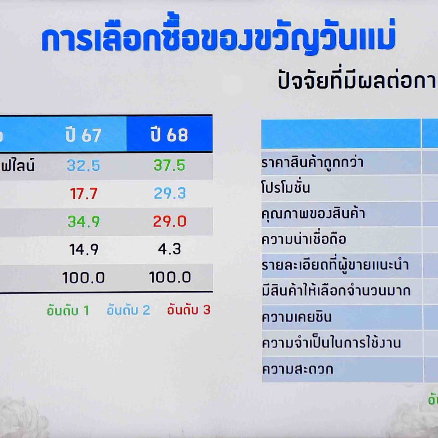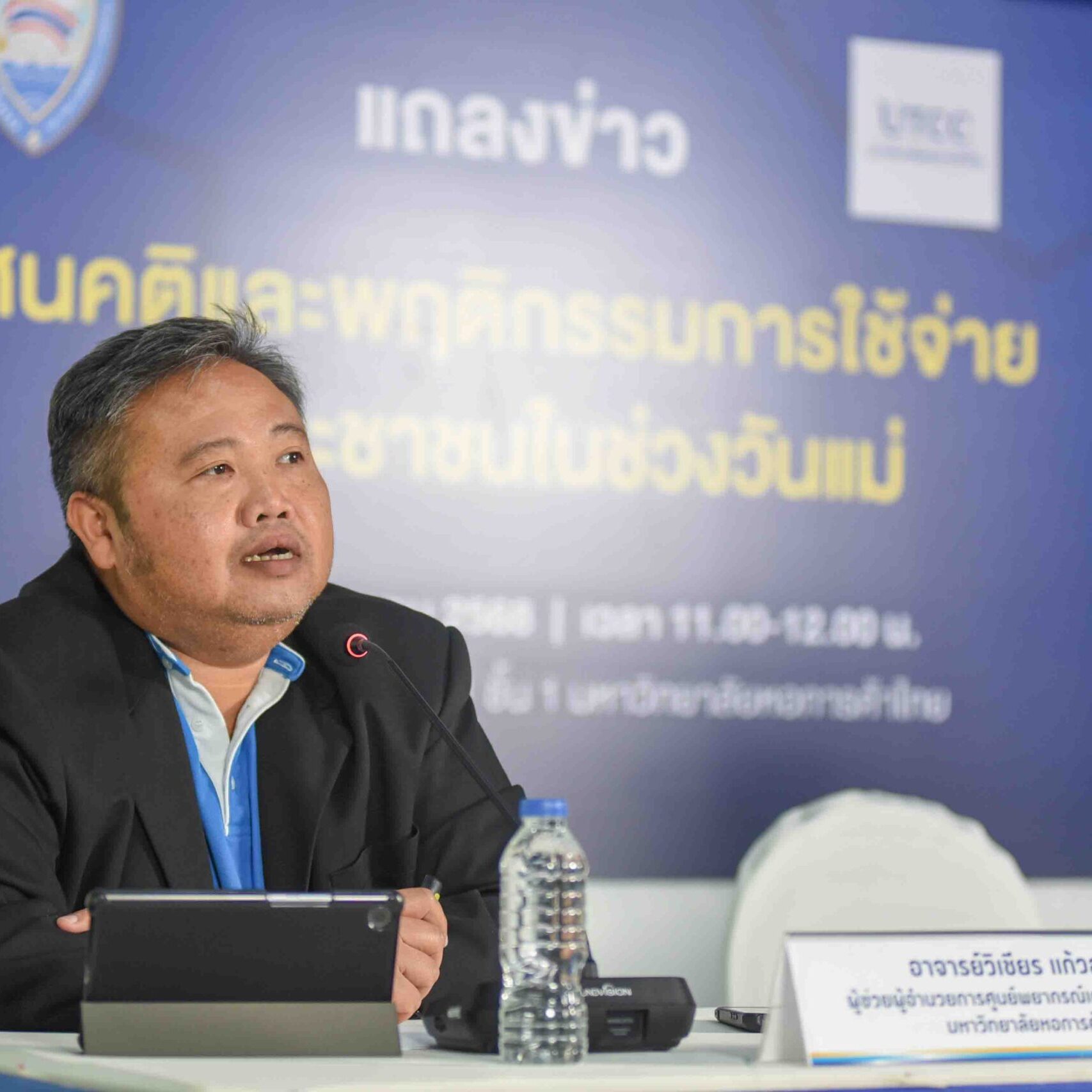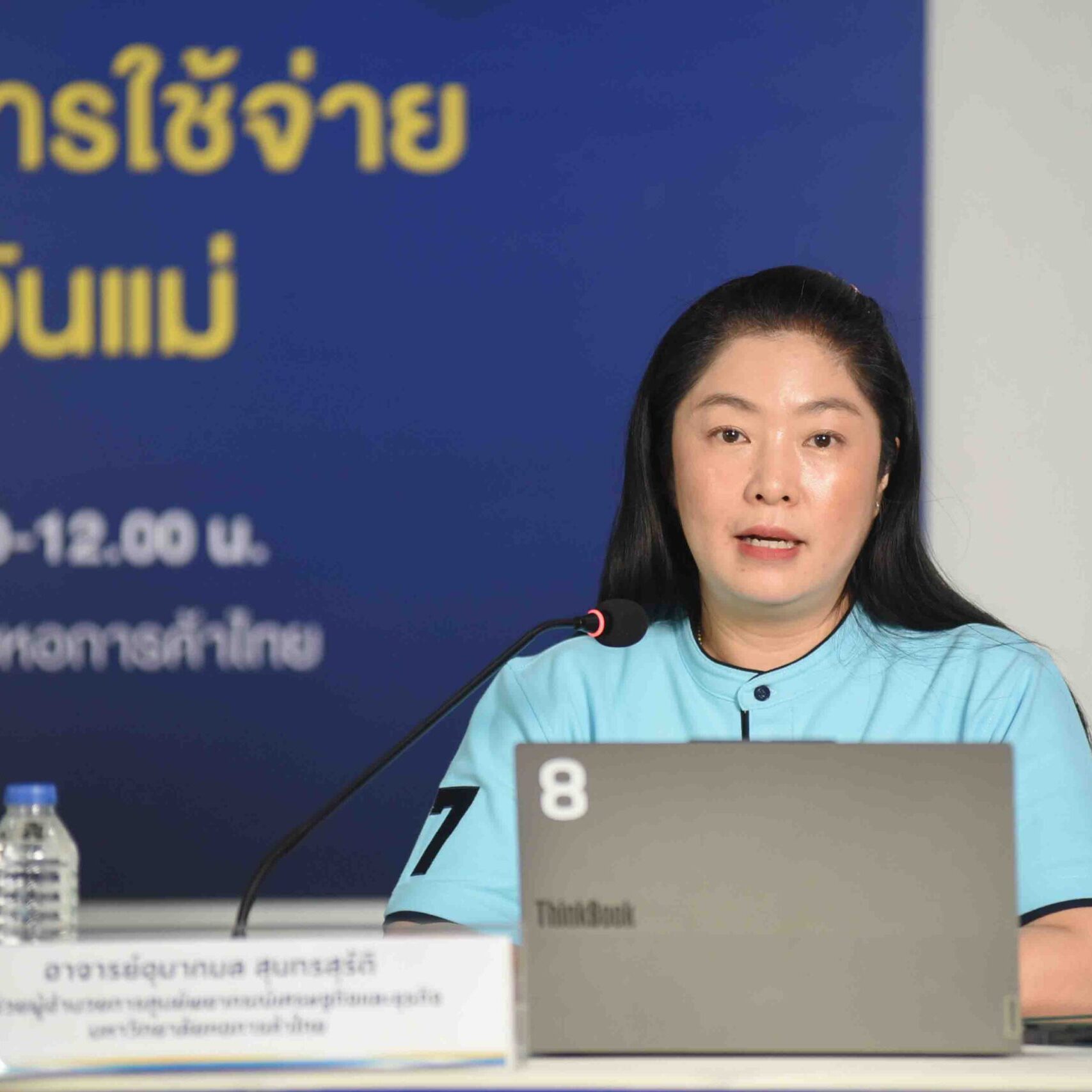 รองศาสตราจารย์ ดร.ธนวรรธน์ พลวิชัย อธิการบดี และประธานที่ปรึกษาศูนย์พยากรณ์เศรษฐกิจและธุรกิจ มหาวิทยาลัยหอการค้าไทย พร้อมด้วย อาจารย์อุมากมล สุนทรสุรัติ ผู้ช่วยผู้อำนวยการศูนย์พยากรณ์เศรษฐกิจและธุรกิจ แถลงข่าว ผลสำรวจทัศนคติและพฤติกรรมการใช้จ่ายของประชาชนในช่วงวันแม่ ประจำปี 2568 พบว่า จากการสำรวจประชาชน 1,422 ตัวอย่าง พบ 58% เห็นว่าวันแม่มีบทบาทสำคัญในการเสริมสร้างความสัมพันธ์ครอบครัว ด้านพฤติกรรมการใช้จ่าย 71% ซื้อของขวัญให้แม่ โดยนิยมให้เงินสด/ทอง เฉลี่ย 3,116 บาท มากที่สุด