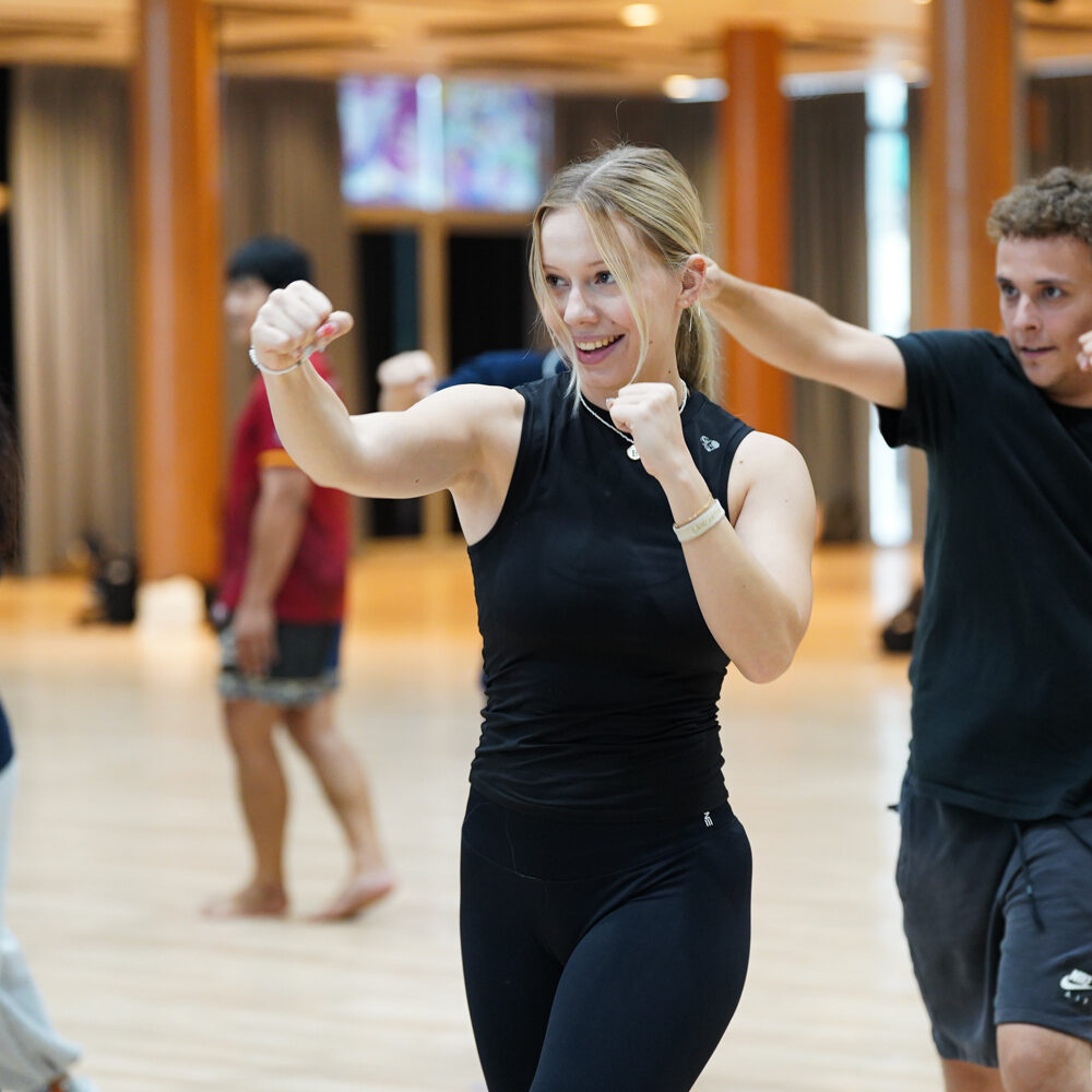 กองการกีฬา จัดกิจกรรม “Muay Thai Power Up เสริมพลัง สร้างสุขภาพ ป้องกันตัว” ให้แก่นักศึกษาทุกชั้นปีที่สนใจมาเข้าร่วมกิจกรรม โดยมีวัตถุประสงค์เพื่อให้ต้องการให้นักศึกษาที่เข้าร่วมกิจกรรมได้มีสุขภาพที่แข็งแรงและนำความรู้และทักษาที่ได้ฝึกปฏิบัติไปในวันนี้ไปฝึกฝนต่อเพื่อให้ร่างกายมีสุขภาพแข็งแรงอีกทั้งนำไปใช้ป้องกันตัวหากเกิดเหตุการณ์ไม่คาดฝันขึ้น