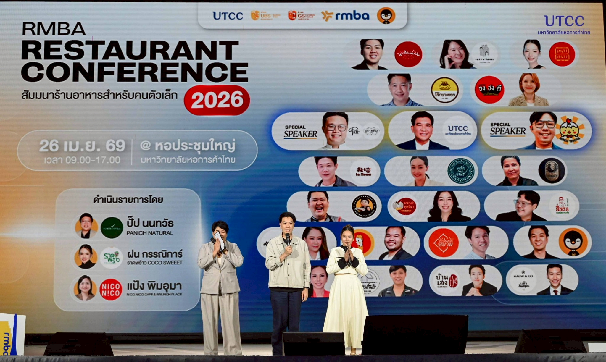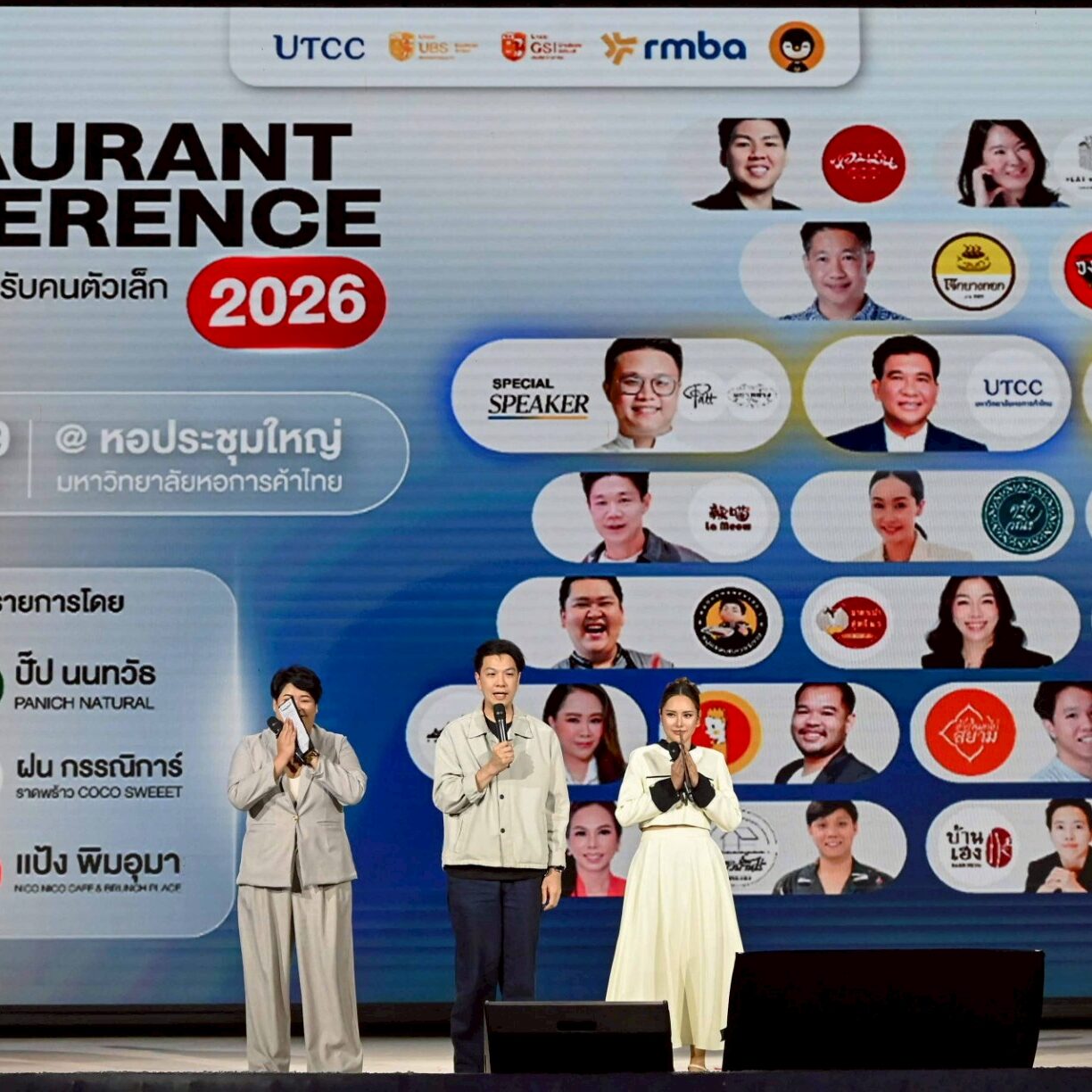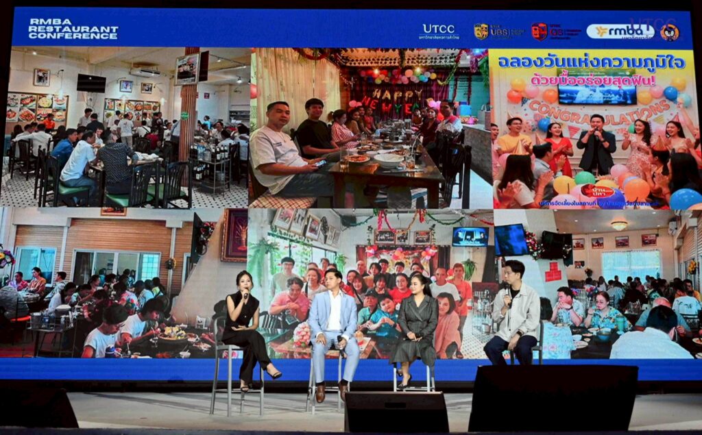 รองศาสตราจารย์ ดร.ธนวรรธน์ พลวิชัย อธิการบดีมหาวิทยาลัยหอการค้าไทย และผู้อำนวยการหลักสูตร RMBA คุณธนพงศ์ วงศ์ชินศรี (ผู้อำนวยการหลักสูตรร่วม RMBA) เจ้าของเพจ Torpenguin กล่าวเปิดงานโครงการ RMBA Forum and Conference ปีการศึกษา 2568 หัวข้อ “RMBA RESTAURANT CONFERENCE 2026 : สัมมนาร้านอาหารสำหรับคนตัวเล็ก” จัดโดยหลักสูตรบริหารธุรกิจมหาบัณฑิต กลุ่มวิชาการจัดการธุรกิจร้านอาหาร (RMBA) บัณฑิตวิทยาลัย มหาวิทยาลัยหอการค้าไทย เพื่อเป็นเวทีแลกเปลี่ยนองค์ความรู้ ประสบการณ์ และมุมมองจากวิทยากรผู้ทรงคุณวุฒิ และผู้ที่ประสบความสำเร็จในธุรกิจร้านอาหาร รวมถึงเสริมสร้างศักยภาพและแนวคิดใหม่ๆ ให้กับ นักศึกษา และผู้ประกอบการร้านอาหารรายย่อย (คนตัวเล็ก) สามารถนำความรู้ไปประยุกต์ใช้ได้จริงในอนาคต
