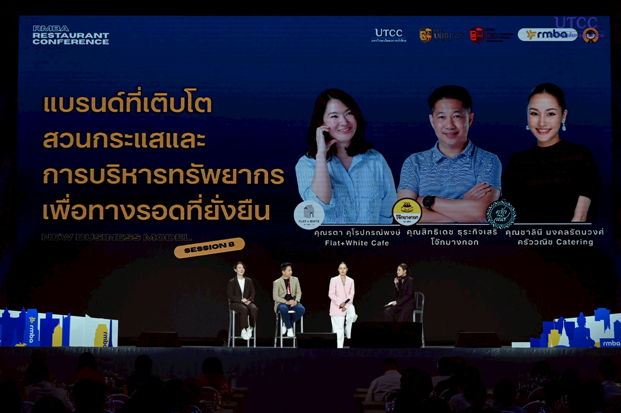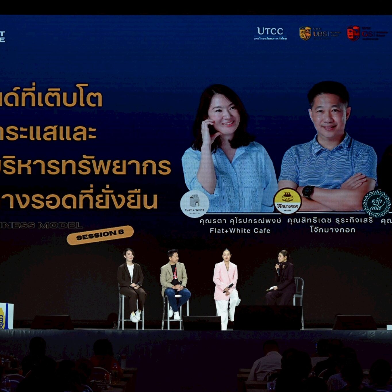Session 8: แบรนด์ที่เติบโตสวนกระแส และการบริหารทรัพยากรเพื่อทางรอดที่ยั่งยืน โดยคุณปอ ชาลินี มงคลรัตนวงศ์เจ้าของร้าน ครัววณิช Catering และ คุณเคียว สิทธิเดช ธุระกิจเสรี เจ้าของร้าน โจ๊กบางกอก และ คุณไวท์ รตา คุโรปกรณ์พงษ์ เจ้าของร้าน Flat+White Cafe
