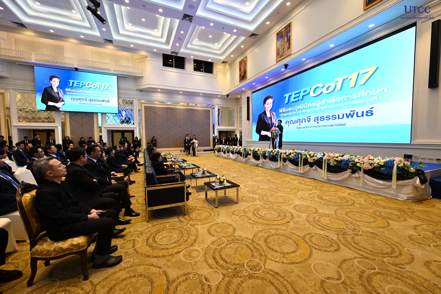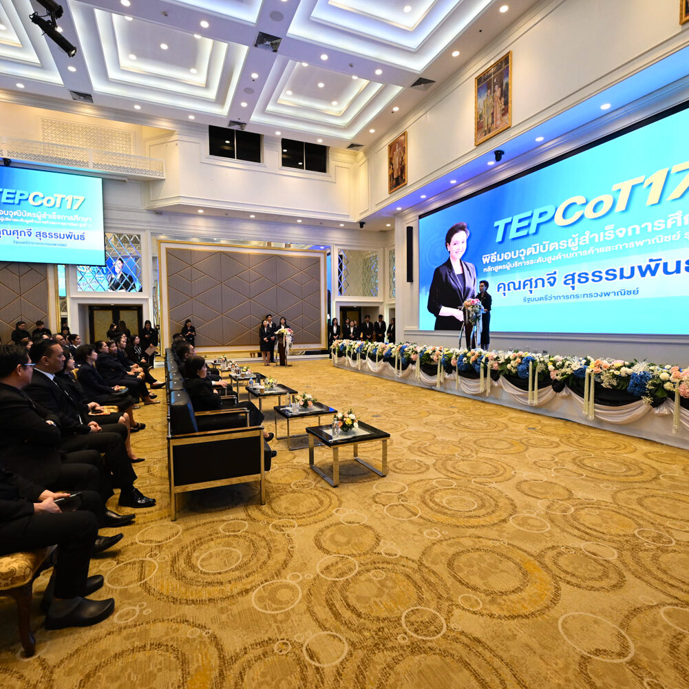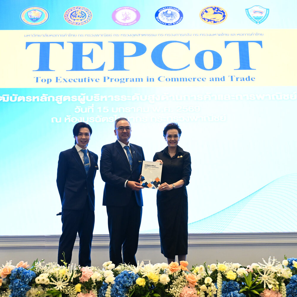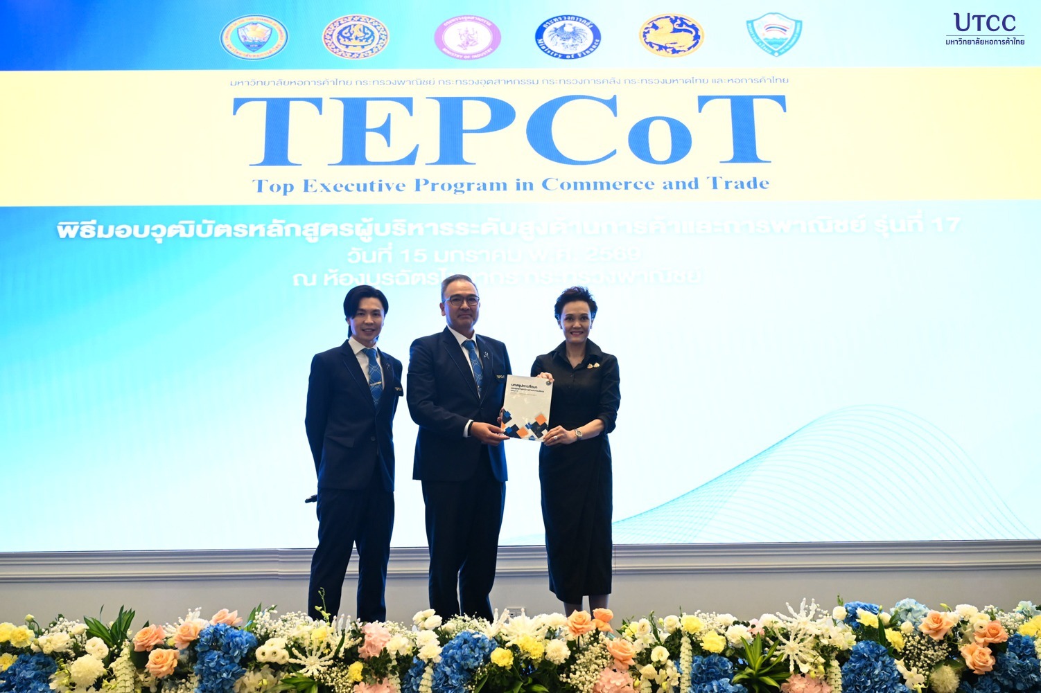 มหาวิทยาลัยหอการค้าไทย โดยศูนย์บริการวิชาการ จัดพิธีมอบวุฒิบัตรแก่ผู้สำเร็จหลักสูตรผู้บริหารระดับสูงด้านการค้าและการพาณิชย์ รุ่นที่ 17 (TEPCoT 17) เพื่อแสดงความยินดีและยกย่องผู้บริหารที่สำเร็จการอบรมตามหลักสูตรดังกล่าว ซึ่งมุ่งเสริมสร้างองค์ความรู้ด้านการค้า การพาณิชย์ และการบริหารเชิงกลยุทธ์ให้สอดคล้องกับบริบทเศรษฐกิจและการค้าทั้งในและต่างประเทศ โดยได้รับเกียรติจากคุณศุภจี สุธรรมพันธุ์ รัฐมนตรีว่าการกระทรวงพาณิชย์ เป็นประธานในพิธี พร้อมด้วย ดร.พจน์ อร่ามวัฒนานนท์ ประธานกรรมการหอการค้าไทยและสภาหอการค้าแห่งประเทศไทย, คุณภูมินทร์ หะรินสุต รองประธานกรรมการหอการค้าไทย, รองศาสตราจารย์ ดร.เสาวณีย์ ไทยรุ่งโรจน์ ที่ปรึกษาประจำสภามหาวิทยาลัยหอการค้าไทย และผู้อำนวยการหลักสูตร TEPCoT และ รองศาสตราจารย์ ดร.ธนวรรธน์ พลวิชัย อธิการบดีมหาวิทยาลัยหอการค้าไทย เข้าร่วมในพิธี ณ ห้องบุรฉัตรไชยากร ชั้น 4 สำนักงานปลัดกระทรวงพาณิชย์ (สนามบินน้ำ) เมื่อวันที่ 15 มกราคม 2569
