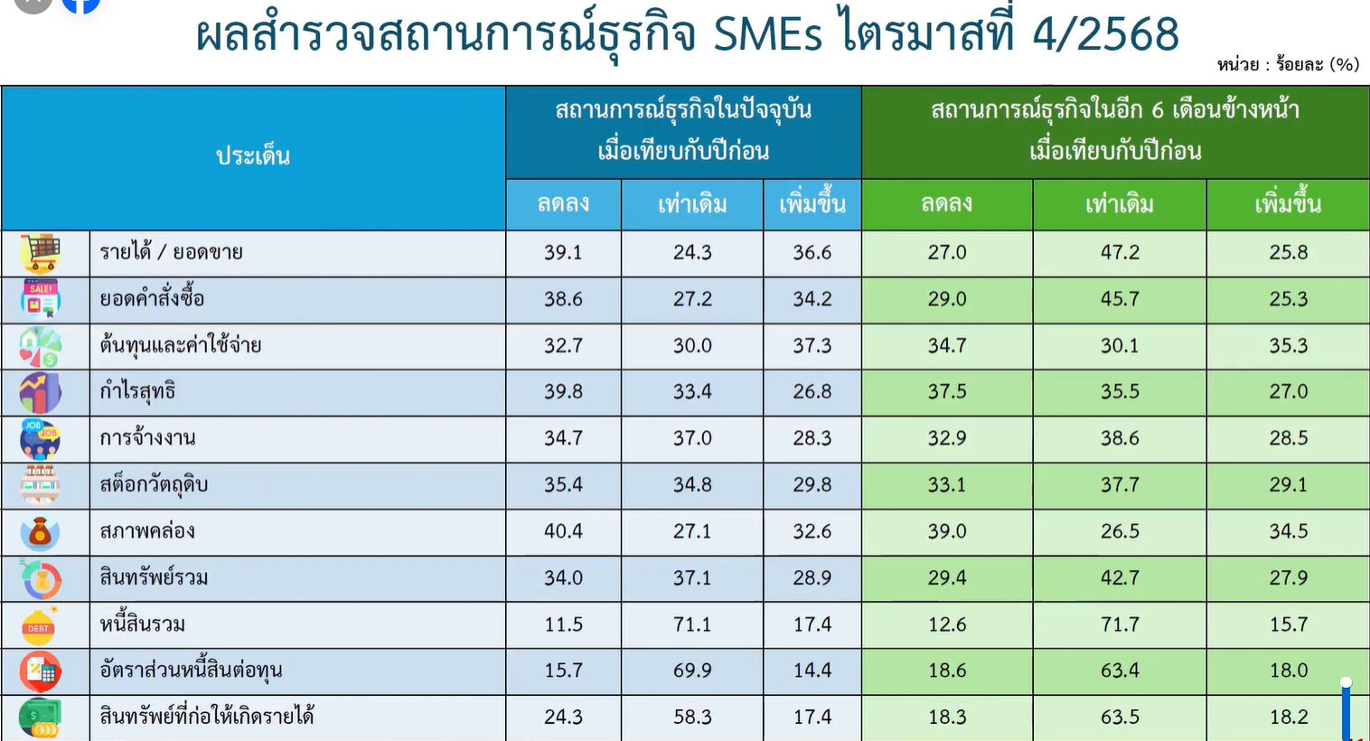 นอกจากนี้ รองศาสตราจารย์ ดร.ธนวรรธน์ ยังได้สรุปดัชนีความสามารถในการแข่งขันของธุรกิจ SMEs ประจำไตรมาส 4/2568 โดยระบุว่า ภาพรวมเศรษฐกิจบางภาคส่วนยังไม่มีความโดดเด่นมากนัก โดยเฉพาะกลุ่มผู้ประกอบการ SME ที่ยังเผชิญข้อจำกัดหลายด้าน