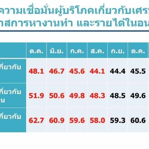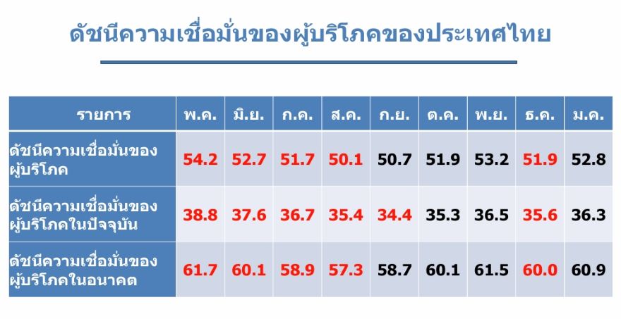 ขณะที่ดัชนีความเชื่อมั่นผู้บริโภคโดยรวมอยู่ที่ 52.8 ดัชนีความเชื่อมั่นผู้บริโภคในปัจจุบันอยู่ที่ 36.3 และดัชนีความเชื่อมั่นผู้บริโภคในอนาคตอยู่ที่ 60.9 แสดงให้เห็นว่าผู้บริโภคยังมีความกังวลต่อสถานการณ์ปัจจุบัน แต่มีความหวังต่อแนวโน้มเศรษฐกิจในอนาคตมากขึ้น