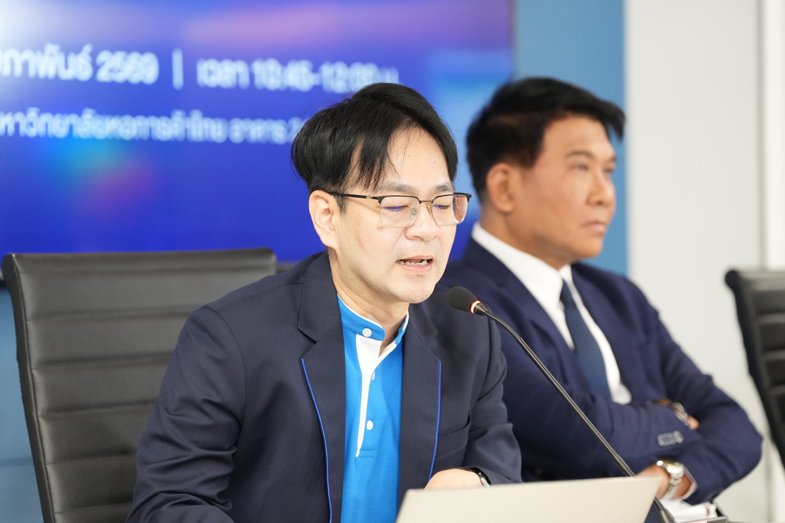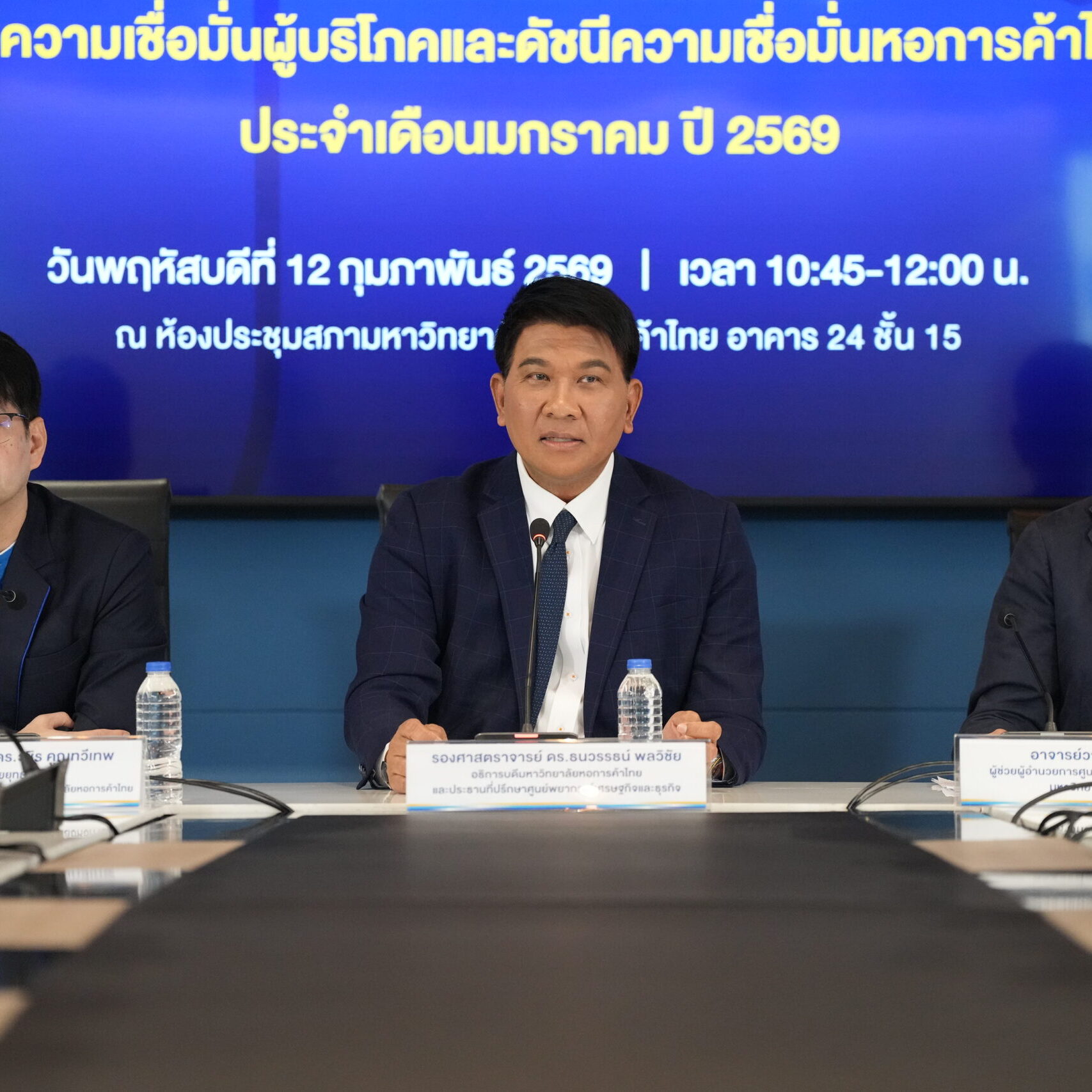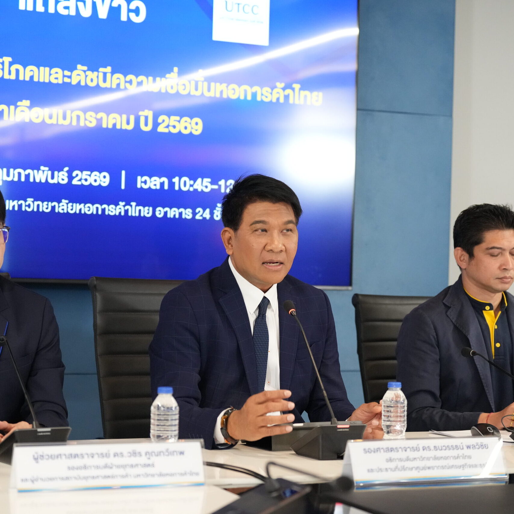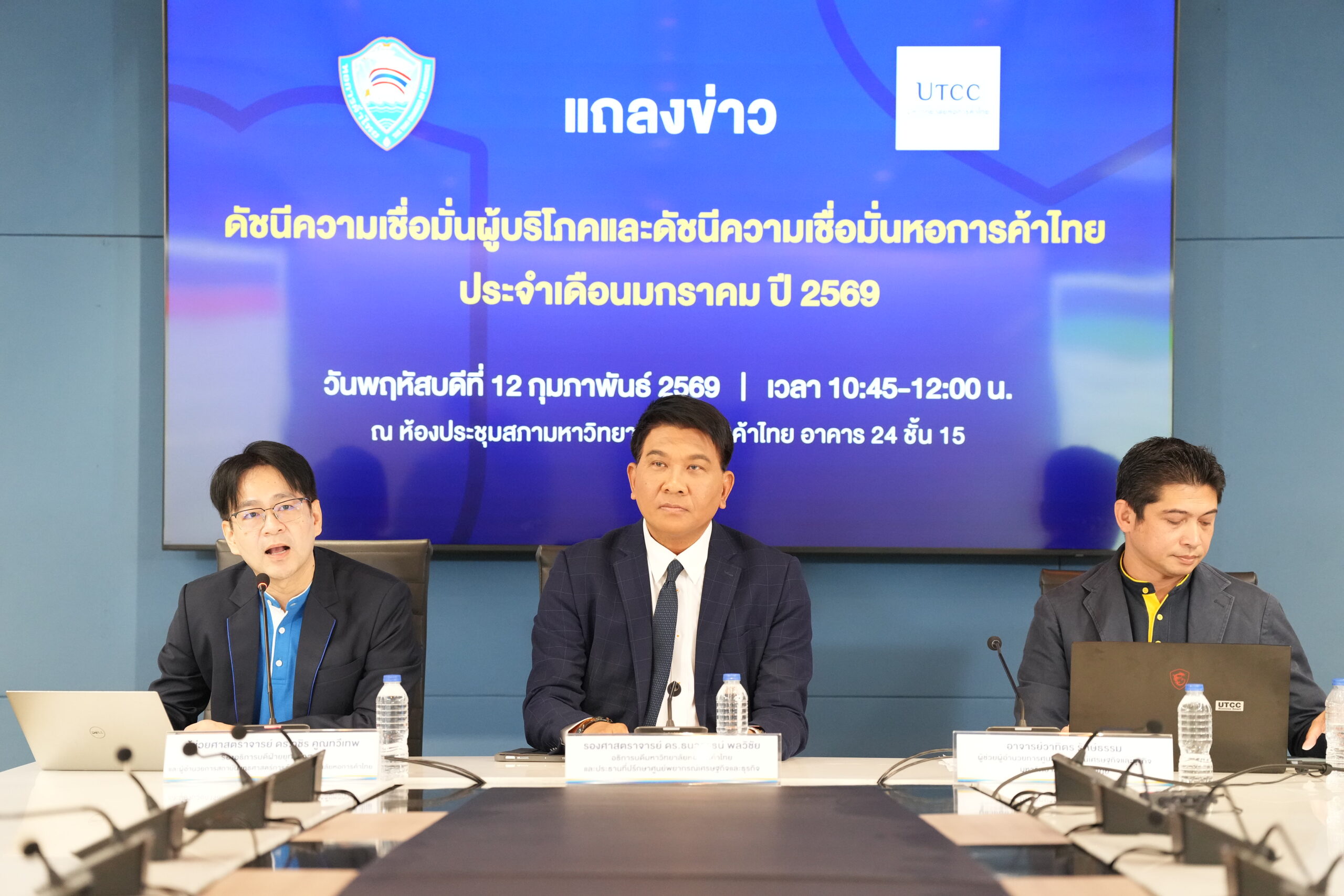 เมื่อวันที่ 12 กุมภาพันธ์ 2569 รองศาสตราจารย์ ดร.ธนวรรธน์ พลวิชัย อธิการบดีและประธานที่ปรึกษาศูนย์พยากรณ์เศรษฐกิจและธุรกิจ พร้อมด้วยผู้ช่วยศาสตราจารย์ ดร.วชิร คูณทวีเทพ รองอธิการบดีฝ่ายยุทธศาสตร์ และอาจารย์วาทิตร รักษ์ธรรม ผู้ช่วยผู้อำนวยการศูนย์ฯ ร่วมแถลงผลสำรวจดัชนีความเชื่อมั่นผู้บริโภค และดัชนีความเชื่อมั่นหอการค้าไทย ประจำเดือนมกราคม 2569 ณ ห้องประชุมสภามหาวิทยาลัยหอการค้าไทย