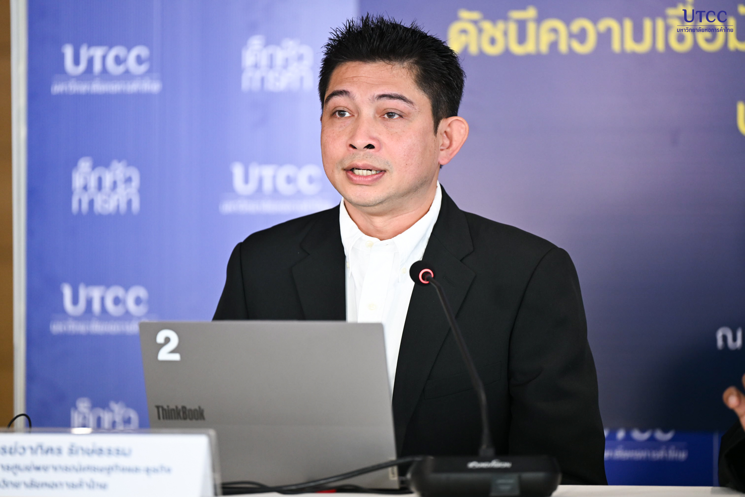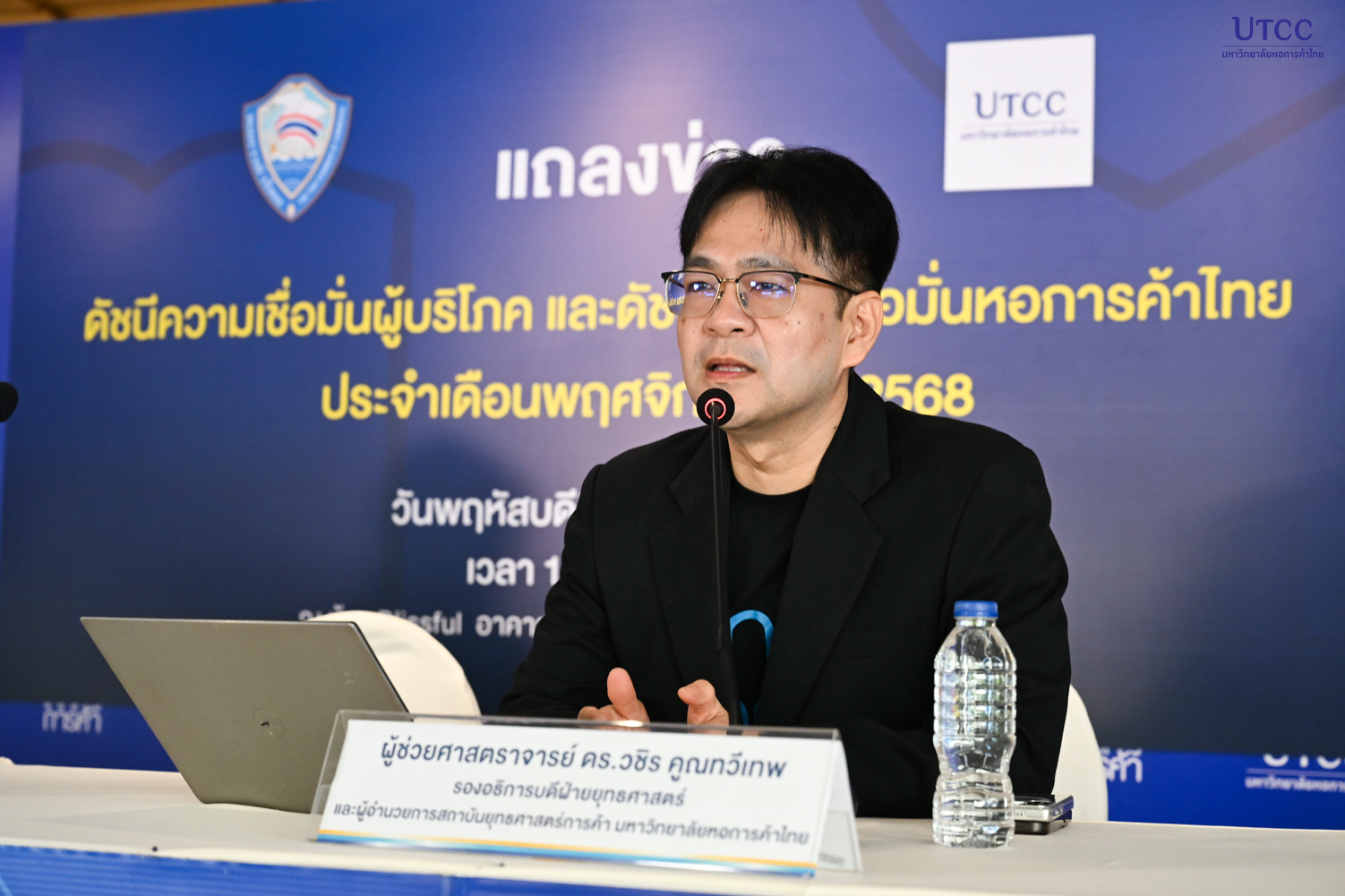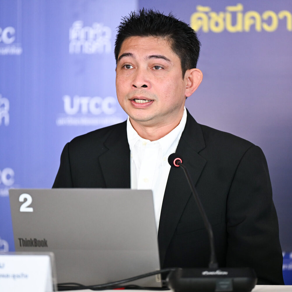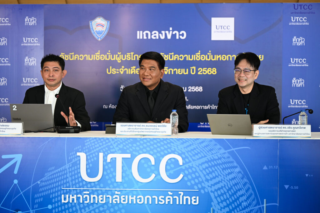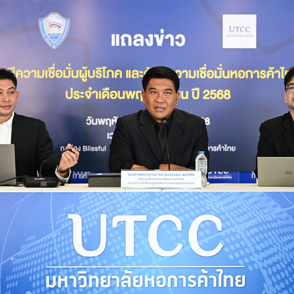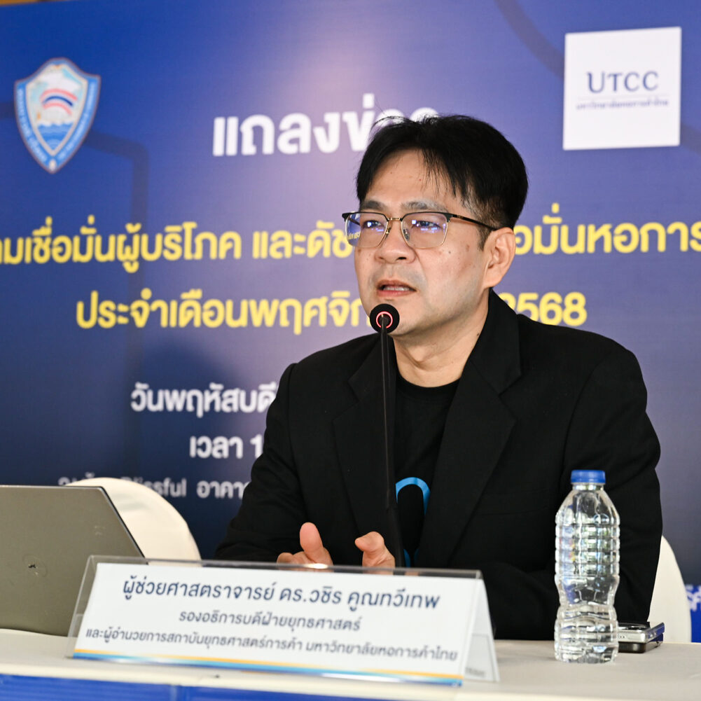 เมื่อวันที่ 4 ธันวาคม 2568 รองศาสตราจารย์ ดร.ธนวรรธน์ พลวิชัย อธิการบดีมหาวิทยาลัยหอการค้าไทย และประธานที่ปรึกษาศูนย์พยากรณ์เศรษฐกิจและธุรกิจ พร้อมด้วย ผู้ช่วยศาสตราจารย์ ดร.วชิร คูณทวีเทพ รองอธิการบดีฝ่ายยุทธศาสตร์ และอาจารย์วาทิตร รักษ์ธรรม ผู้ช่วยผู้อำนวยการศูนย์ฯ ร่วมแถลงข่าวผลสำรวจดัชนีดังกล่าว ณ ห้อง Blissful Auditorium อาคาร 10 ชั้น 1 มหาวิทยาลัยหอการค้าไทย