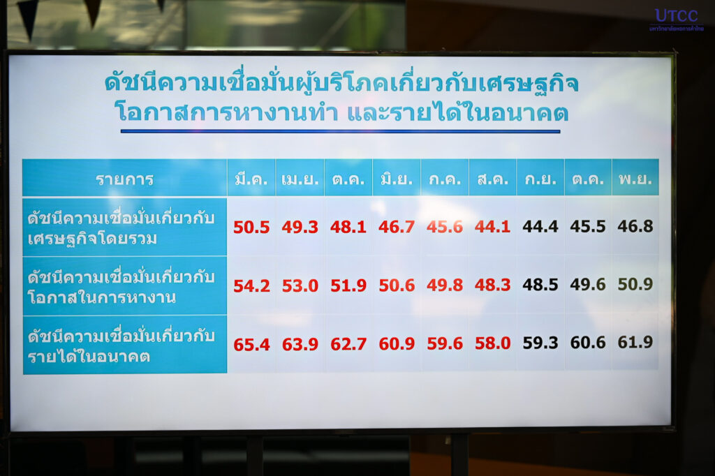 ผลสำรวจระบุว่า ดัชนีความเชื่อมั่นผู้บริโภคเกี่ยวกับเศรษฐกิจโดยรวมอยู่ที่ระดับ 46.8 ดัชนีความเชื่อมั่นเกี่ยวกับโอกาสหางานทำอยู่ที่ระดับ 50.9 และดัชนีความเชื่อมั่นเกี่ยวกับรายได้ในอนาคตอยู่ที่ระดับ 61.9 โดยดัชนีปรับตัวดีขึ้นทุกรายการเป็นเดือนที่ 2 ในรอบ 10 เดือน อย่างไรก็ตาม ผู้บริโภคส่วนใหญ่ยังไม่มีความมั่นใจต่อสถานการณ์เศรษฐกิจ โอกาสในการหางานทำ และรายได้ในอนาคต เนื่องจากยังมีความกังวลต่อการฟื้นตัวของเศรษฐกิจที่ยังไม่ชัดเจน ค่าครองชีพที่ทรงตัวอยู่ในระดับสูง สถานการณ์น้ำท่วมในพื้นที่ภาคใต้ ตลอดจนปัญหาความขัดแย้งระหว่างไทยกับกัมพูชา ซึ่งส่งผลกระทบต่อเศรษฐกิจและการจ้างงาน โดยมีแนวโน้มฟื้นตัวได้ช้าในระยะเวลาข้างหน้า
