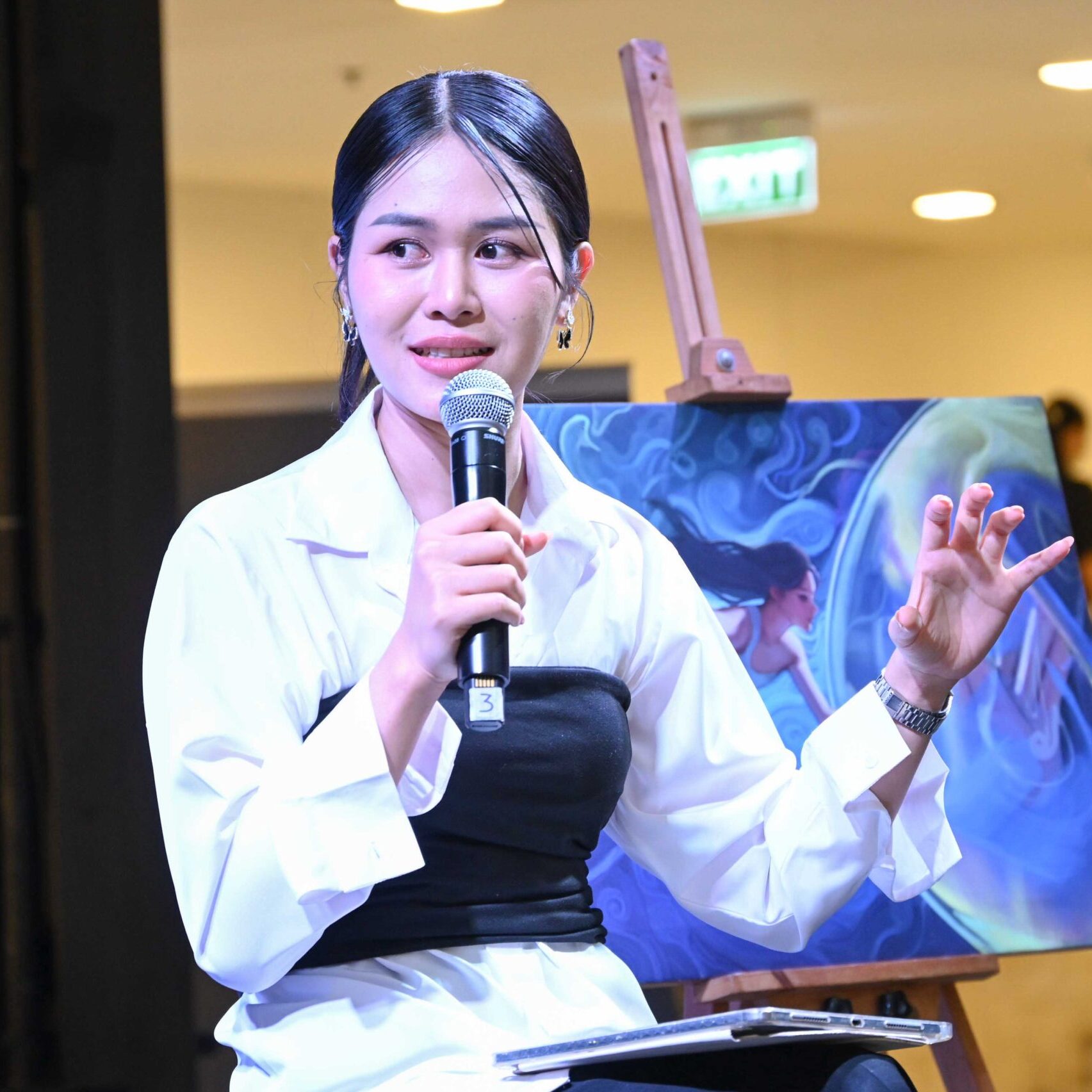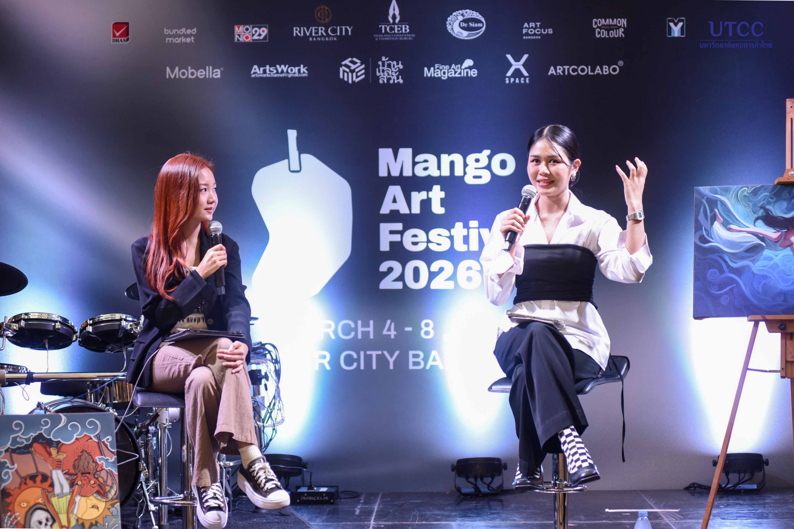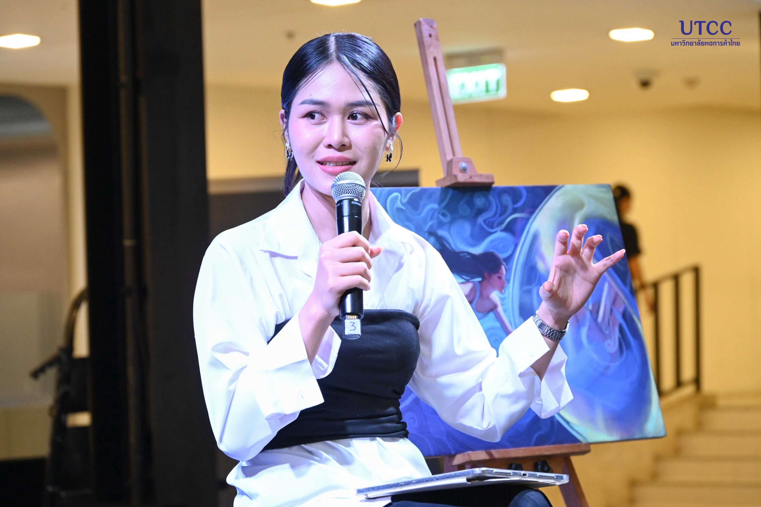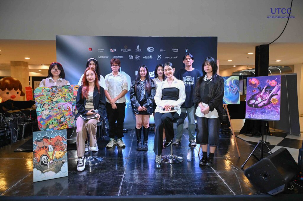 นอกจากนี้ ภายในงานยังมีการเสวนาในหัวข้อ Creative Futures: ศิลปะ การออกแบบ และคนรุ่นใหม่ โดยอาจารย์ ธณมฬ วงษา ครูปฏิบัติการคณะดิจิทัลอาร์ตและดีไซน์ มหาวิทยาลัยหอการค้าไทย โดยมีคุณจุฬาลักษณ์ บุญอยู่ ศิษย์เก่ารุ่นที่ 2 คณะดิจิทัลอาร์ตและดีไซน์ มหาวิทยาลัยหอการค้าไทย เป็นผู้ดำเนินการเสวนา ณ River City Bangkok ชั้น 1 (FL1) เมื่อวันที่ 5 มีนาคม 2569