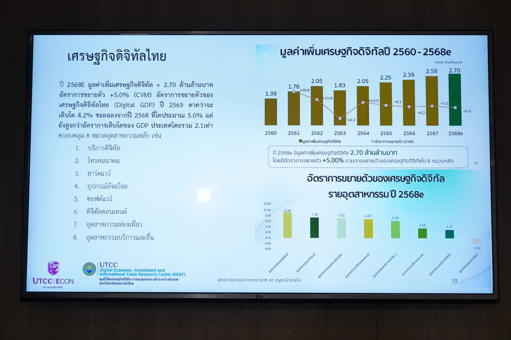 เมื่อวันที่ 9 ธันวาคม 2568 ศูนย์วิจัยเศรษฐกิจดิจิทัล การลงทุนและการค้าระหว่างประเทศ (DEIIT) คณะเศรษฐศาสตร์ มหาวิทยาลัยหอการค้าไทย เปิดเผยผลสำรวจ “ดัชนีการเปลี่ยนผ่านดิจิทัลของประเทศไทย” (Thailand Digital Transformation Index: TDTI) ครั้งแรก โดยพบว่า ประเทศไทยมีโครงสร้างพื้นฐานด้านดิจิทัลและระดับการเข้าถึงเทคโนโลยีสูงที่สุดในภูมิภาคอาเซียน อยู่ในระดับเทียบเท่าประเทศชั้นนำของสหภาพยุโรป