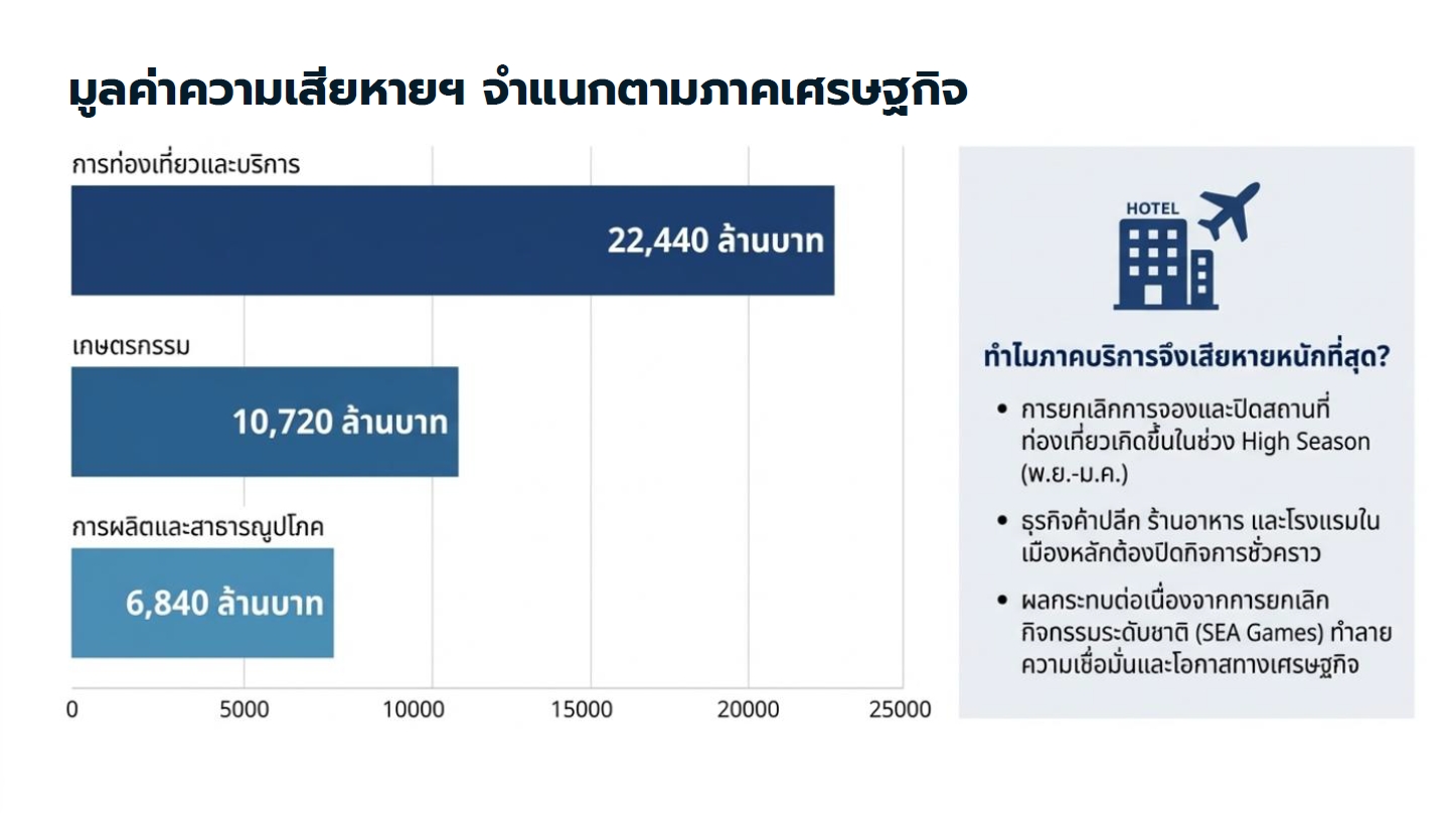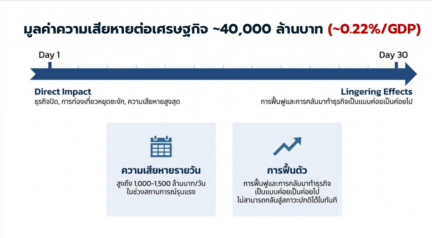 รศ.ดร.ธนวรรธน์ กล่าวว่า มหาวิทยาลัยได้ปรับลดประมาณการอัตราการขยายตัวทางเศรษฐกิจ (GDP) ของไทยในปี 2568 ลงเหลือ 1.9% จากเดิมที่คาดไว้ 2.0% โดยสาเหตุหลักที่ปรับลด GDP มาจากผลกระทบและความสูญเสียทางเศรษฐกิจที่เกิดขึ้นจากเหตุอุทกภัยครั้งใหญ่ในพื้นที่ภาคใต้ โดยเฉพาะ อ.หาดใหญ่ จ.สงขลา ที่สร้างความเสียหายทางเศรษฐกิจไม่ต่ำกว่า 4 หมื่นล้านบาท
