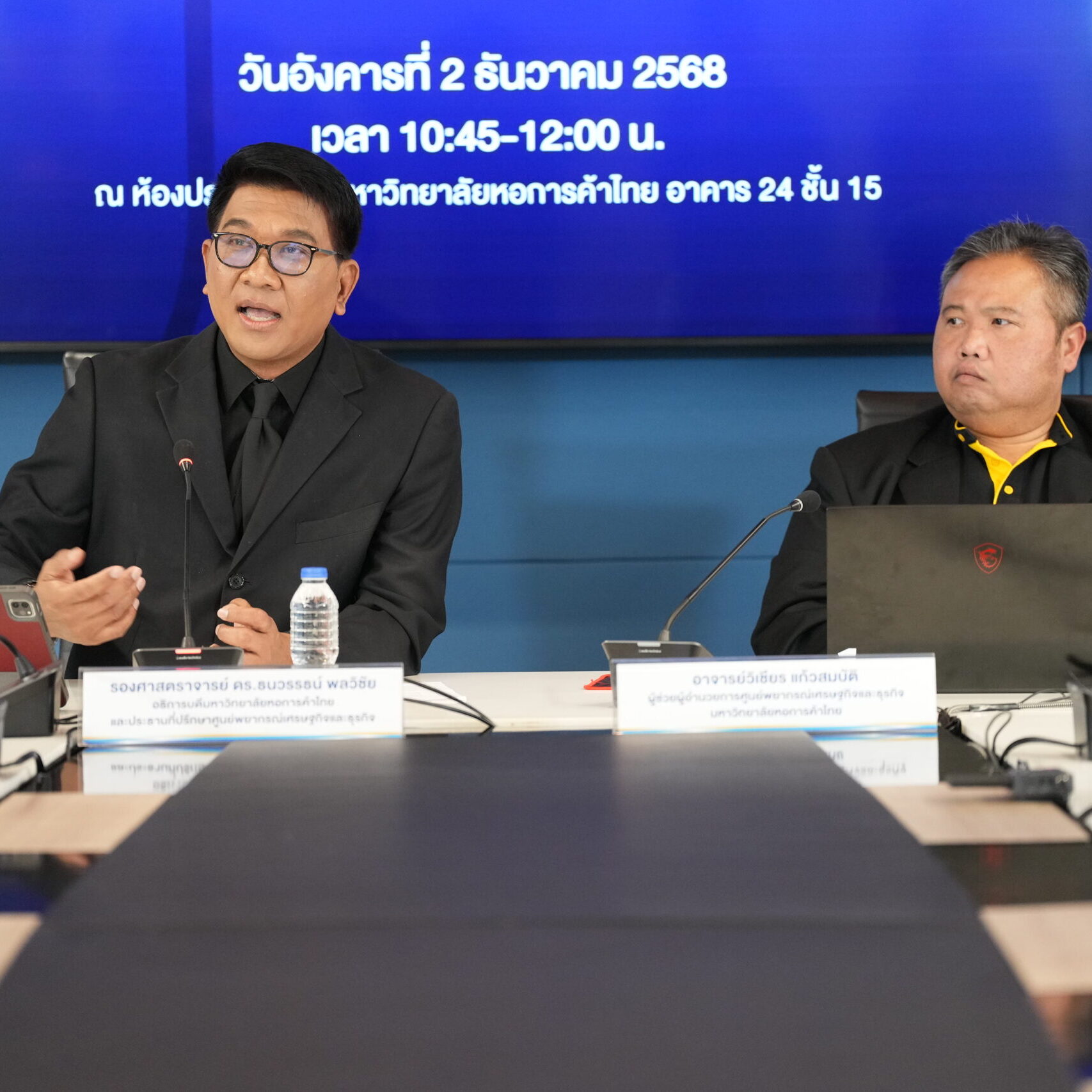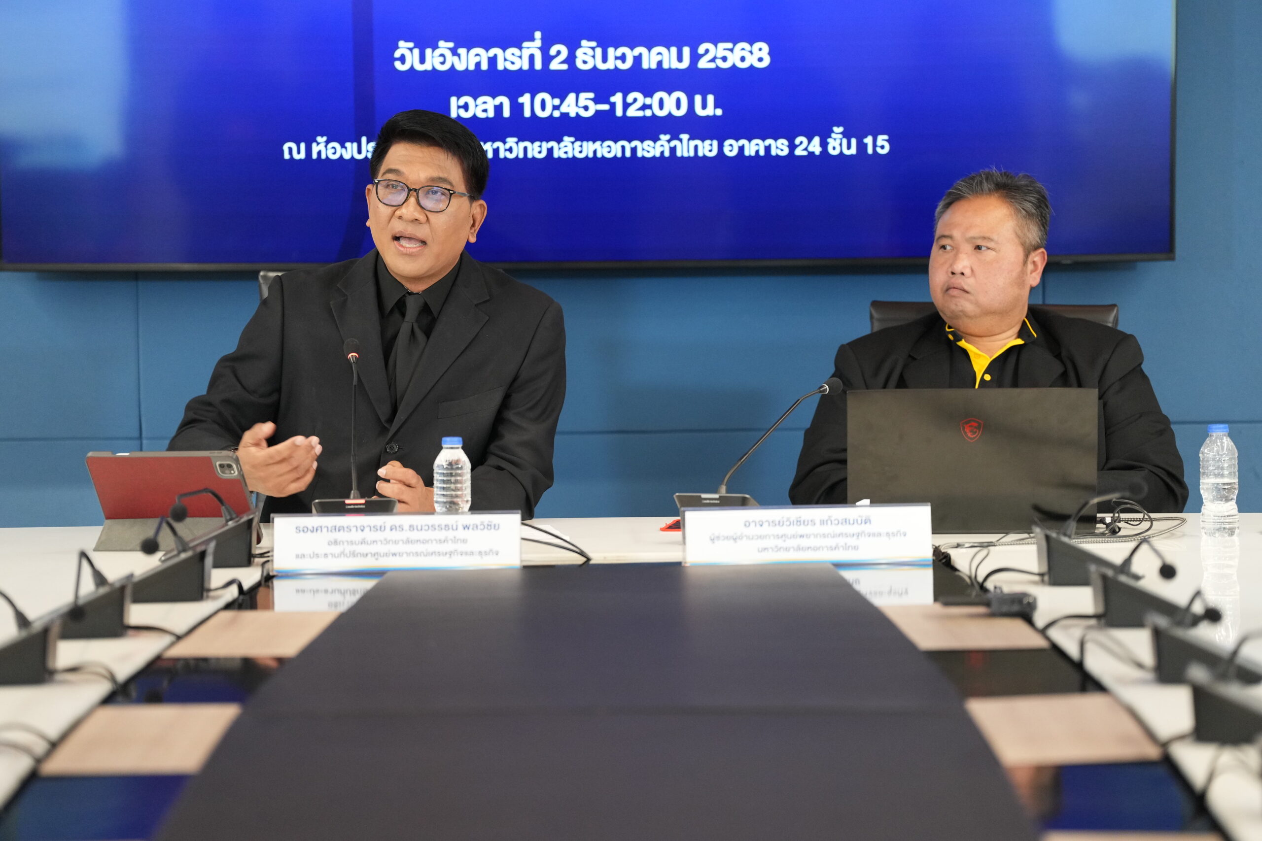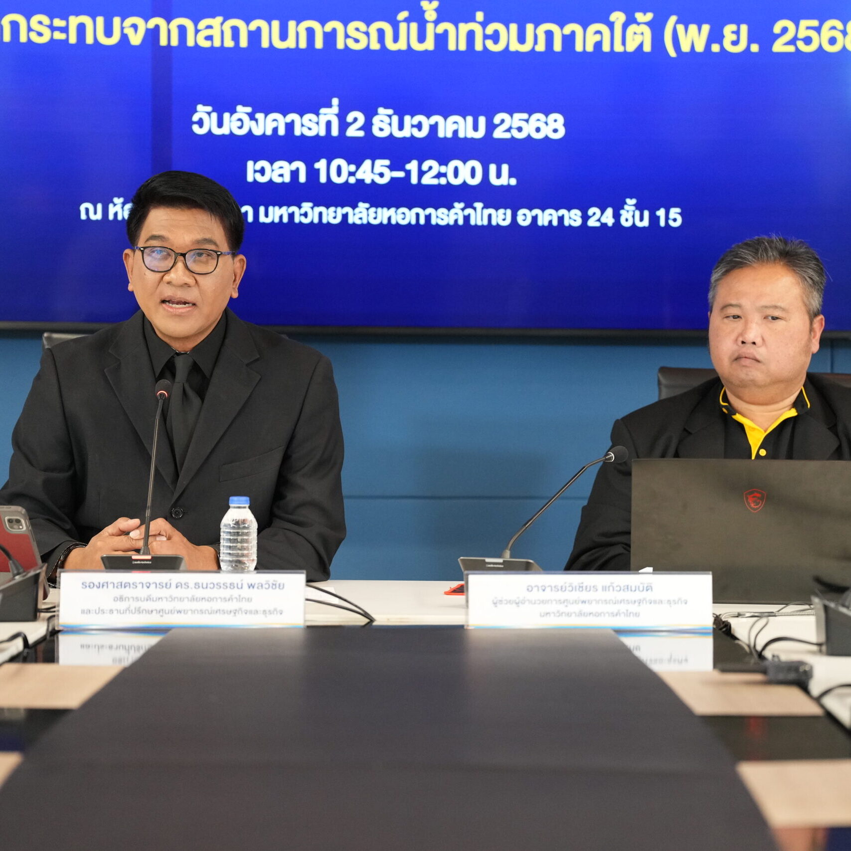 รองศาสตราจารย์ ดร.ธนวรรธน์ พลวิชัย อธิการบดีมหาวิทยาลัยหอการค้าไทย และประธานที่ปรึกษาศูนย์พยากรณ์เศรษฐกิจและธุรกิจ พร้อมด้วยอาจารย์วิเชียร แก้วสมบัติ ผู้ช่วยผู้อำนวยการศูนย์พยากรณ์เศรษฐกิจและธุรกิจ ร่วมแถลงข่าวประมาณการเศรษฐกิจไทยปี 2568-2569 และผลกระทบจากสถานการณ์น้ำท่วมภาคใต้