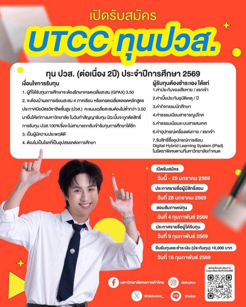 ถึงเวลาของน้อง ปวส. แล้ว! เปิดรับสมัครสอบ UTCC ทุนปวส. (ต่อเนื่อง 2 ปี) ประจำปีการศึกษา 2569