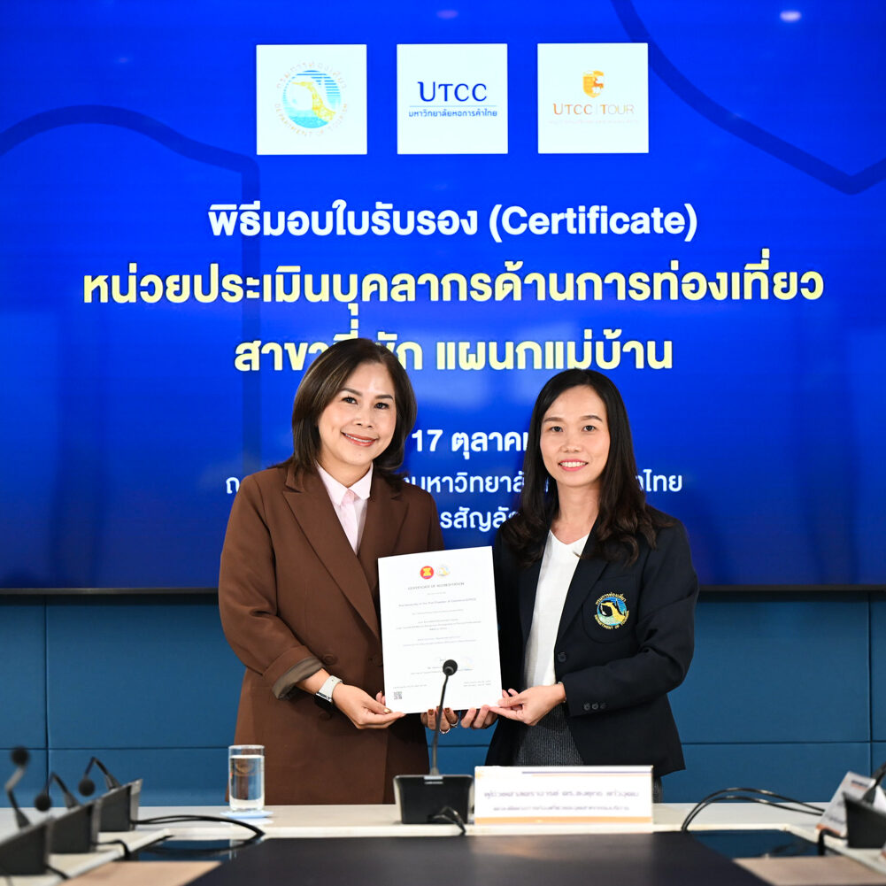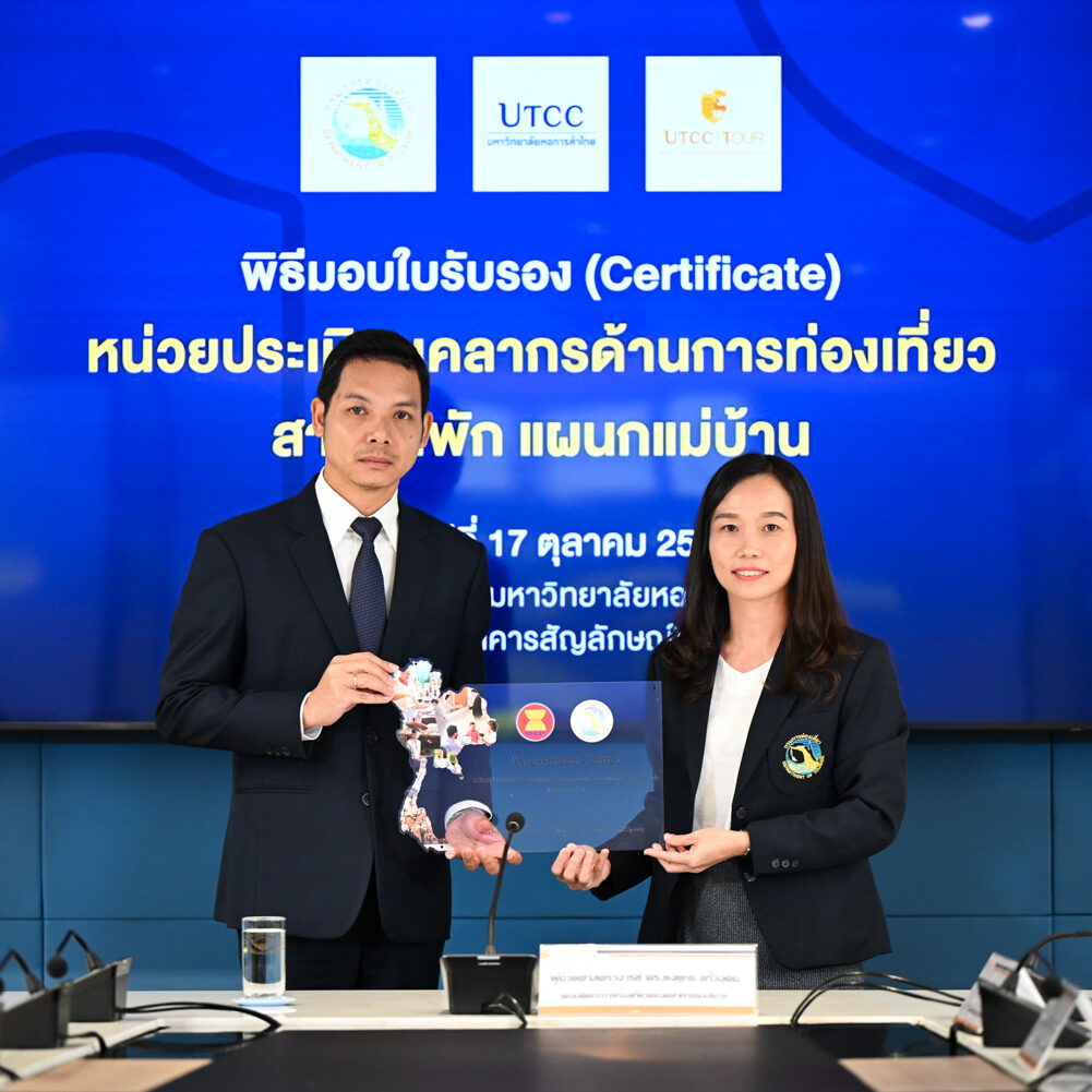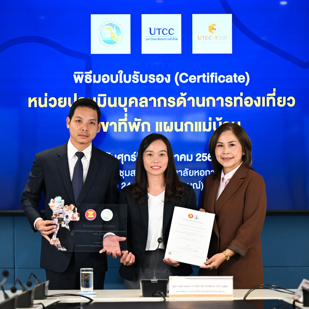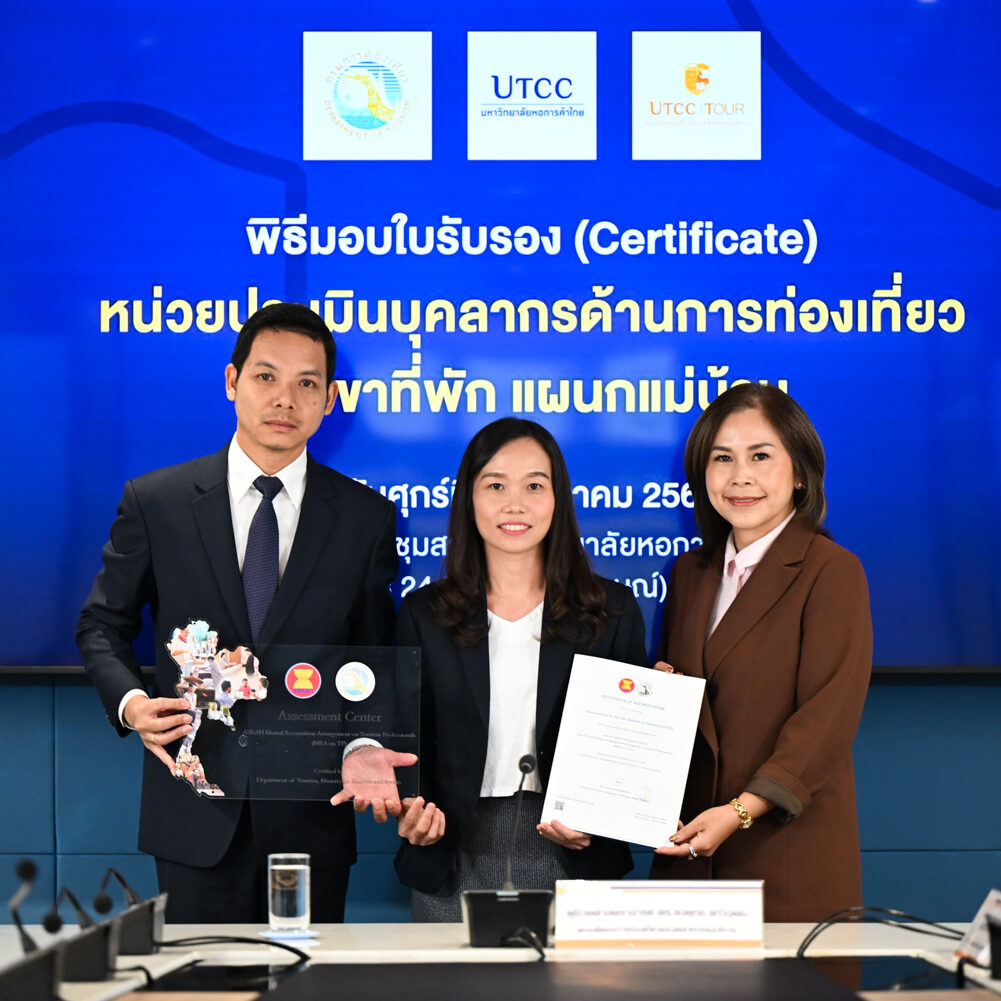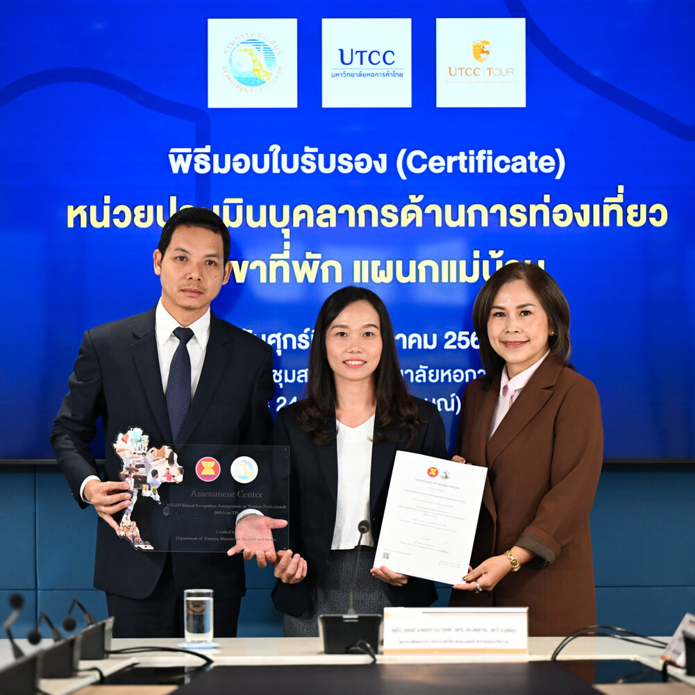 คณะการท่องเที่ยวและอุตสาหกรรมบริการ นำโดยผู้ช่วยศาสตราจารย์ ดร.ยงยุทธ แก้วอุดม คณบดีคณะการท่องเที่ยวและอุตสาหกรรมบริการ พร้อมคณาจารย์ ให้การต้อนรับผู้แทนจากหน่วยประเมินมาตรฐานบุคลากรด้านการท่องเที่ยว สาขาที่พัก (แผนกแม่บ้าน) นำโดยนางสาวณัฐา เฮงเจริญ หัวหน้ากลุ่มทะเบียนและตรวจประเมิน และนางสาวรุ่งรัตน์ วรรณะอยู่ นักพัฒนาการท่องเที่ยวชำนาญการ จากกรมการท่องเที่ยว ในโอกาสมอบโล่และใบรับรอง (Certificate) แก่คณะการท่องเที่ยวและอุตสาหกรรมบริการ มหาวิทยาลัยหอการค้าไทย ณ ห้องประชุมสภามหาวิทยาลัยหอการค้าไทย เมื่อวันที่ 17 ตุลาคม 2568