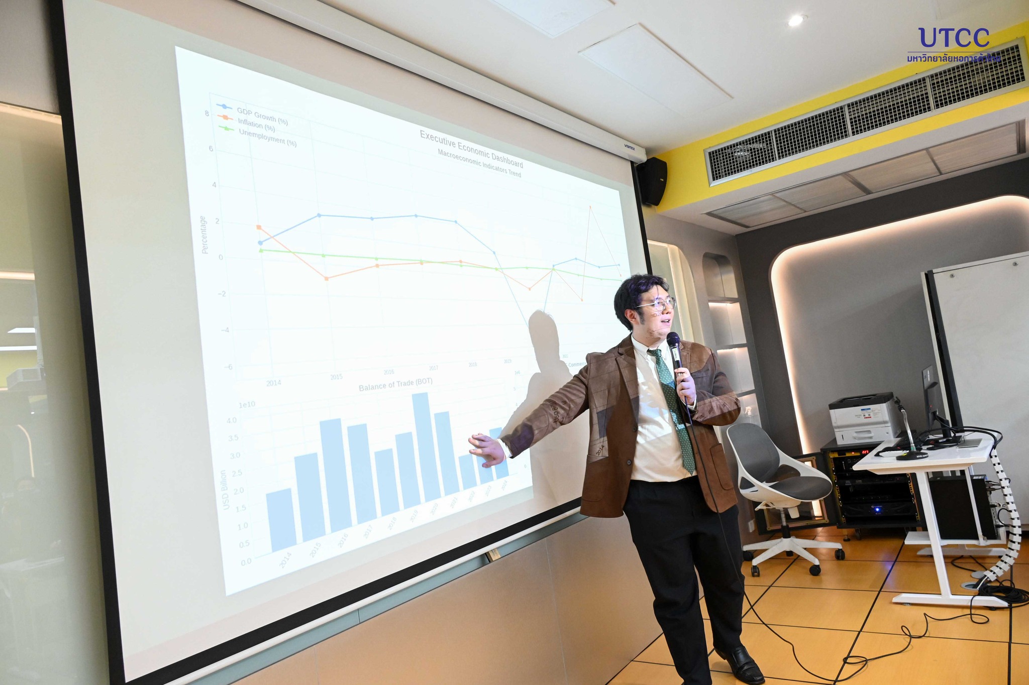 ผู้ช่วยศาสตราจารย์ ดร.วชิร คูณทวีเทพ รองอธิการบดีฝ่ายยุทธศาสตร์ และรักษาการคณบดีคณะเศรษฐศาสตร์ กล่าวต้อนรับคณะศึกษาดูงานจาก บริษัท ไปรษณีย์ไทย จำกัด ในโอกาสมาเยี่ยมชมศึกษาดูงาน ของมหาวิทยาลัยหอการค้าไทย โดยมี ดร.จอมขวัญ ผลภาษี ผู้ช่วยอธิการบดีฝ่ายวิจัยและนวัตกรรม และนายเมธี จารุบุณย์ ที่ปรึกษาอธิการบดีด้าน Ai และการตลาด พร้อมคณะร่วมให้การต้อนรับ ณ ห้องประชุมสภามหาวิทยาลัยหอการค้าไทย