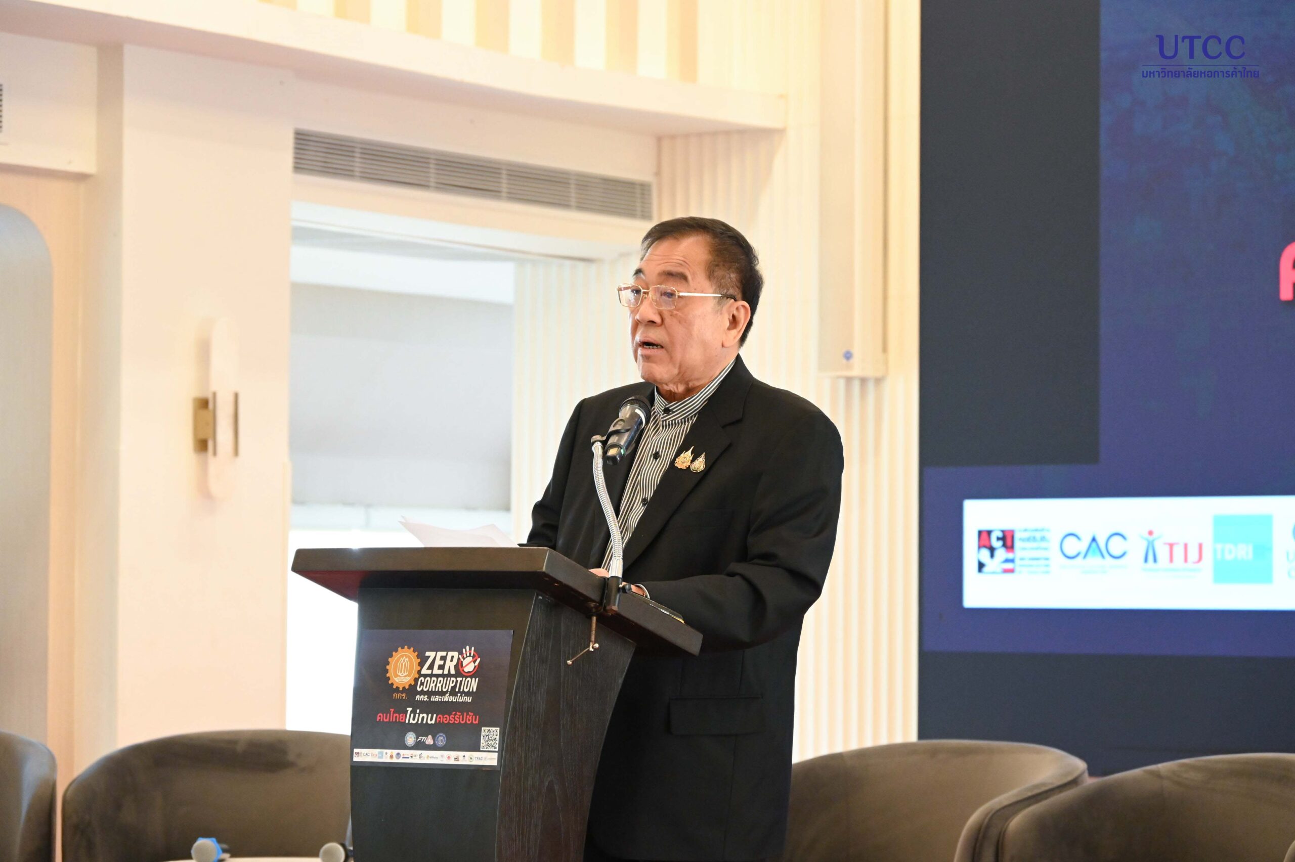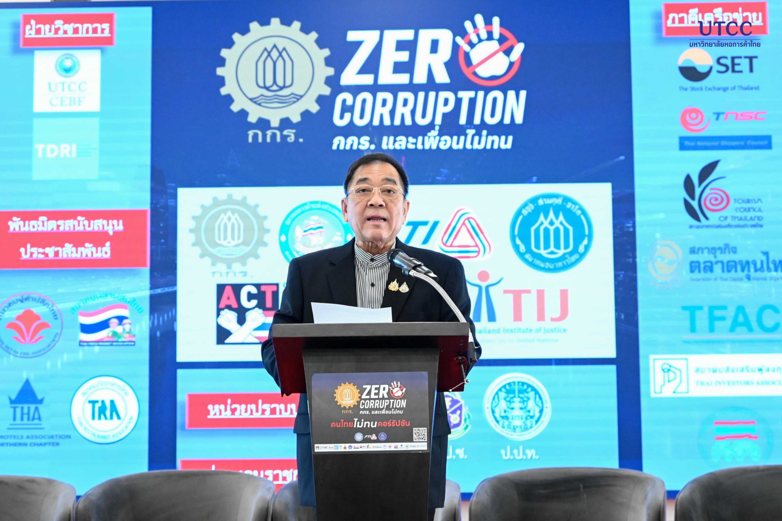 ดร.พจน์ อร่ามวัฒนานนท์ ประธานกรรมการหอการค้าไทย และสภาหอการค้าแห่งประเทศไทย กล่าวเปิดงานและแถลงจุดยืนไม่ทนคอร์รัปชัน บนเวทีเสวนา “Zero Corruption: กกร. และเพื่อน ไม่ทน”