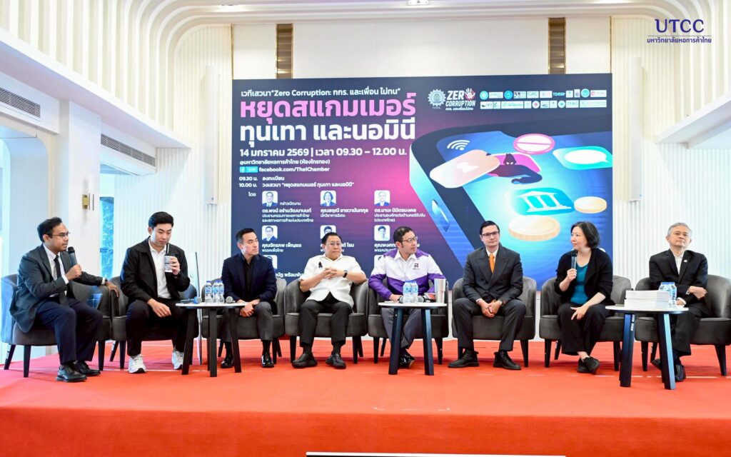 ทั้งนี้ในงานเสวนาดังกล่าว จัดขึ้นเพื่อเป็นเวทีในการสื่อสารวิสัยทัศน์และข้อเสนอแก้ปัญหาสแกมเมอร์ ทุนเทาและนอมินี ต่อพรรคการเมืองต่าง ๆ ที่มีนโยบายแก้ปัญหานี้ และสื่อสารต่อสาธารณะให้ร่วมเรียกร้องต่อรัฐบาลใหม่เร่งแก้ปัญหานี้ โดยมีรองศาสตราจารย์ ดร.ธนวรรธน์ พลวิชัย อธิการบดีมหาวิทยาลัยหอการค้าไทย ผู้บริหาร ตัวแทนนักการเมือง และนักศึกษา เข้าร่วมรับฟัง ณ ห้องไทรทอง (อาคาร 3 ชั้น 4) เมื่อวันที่ 14 มกราคม 2569